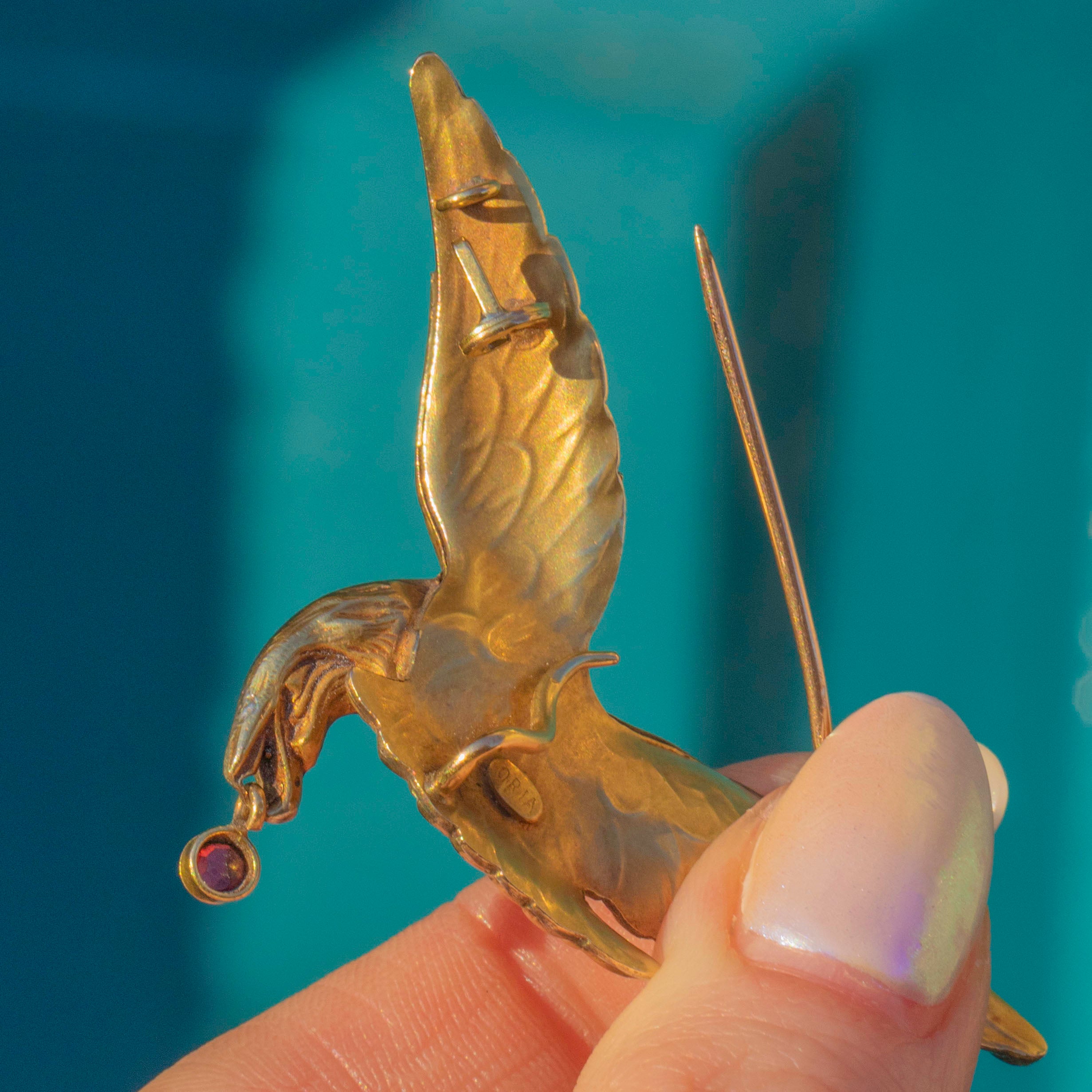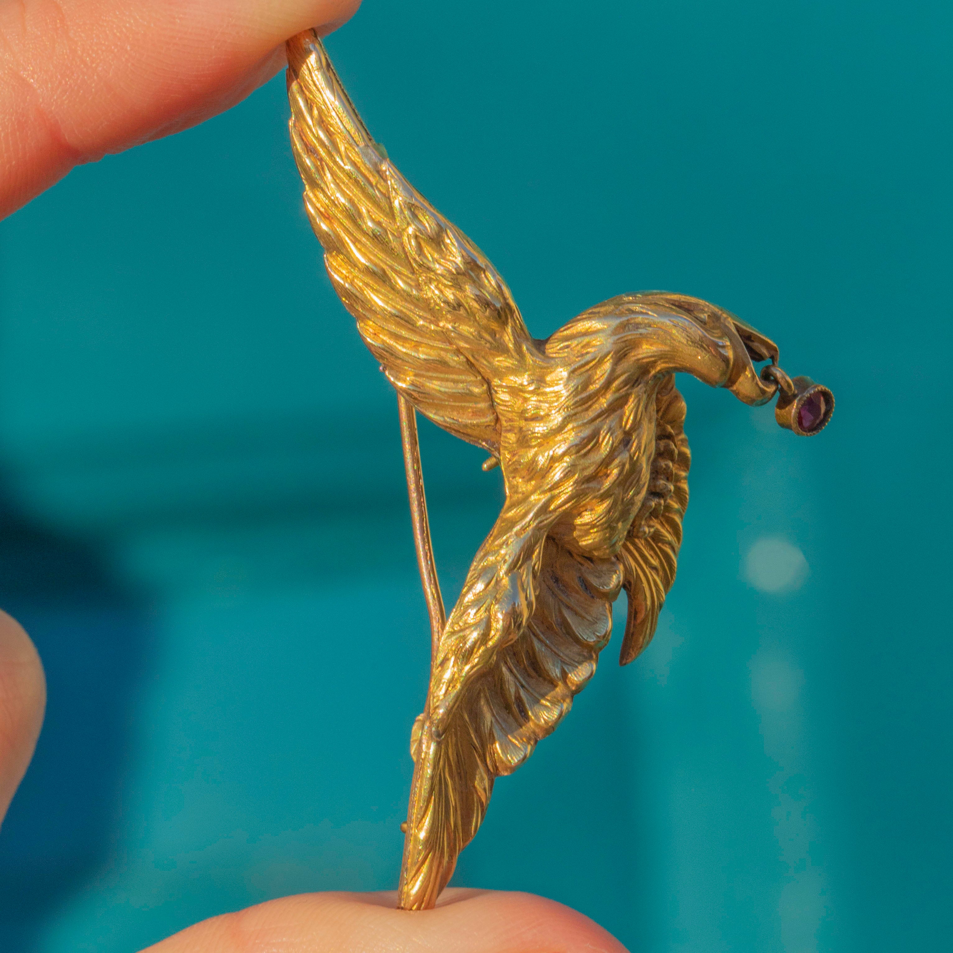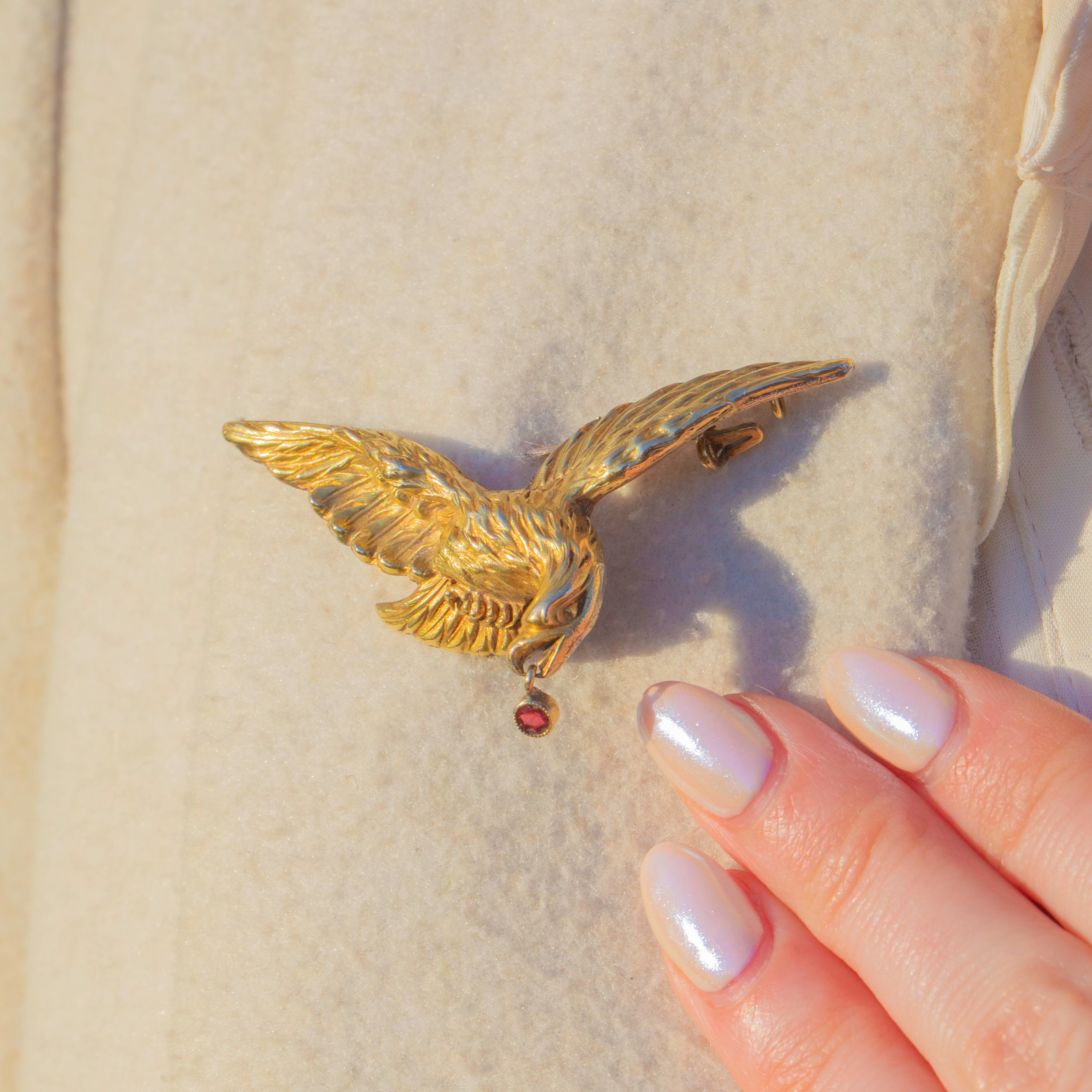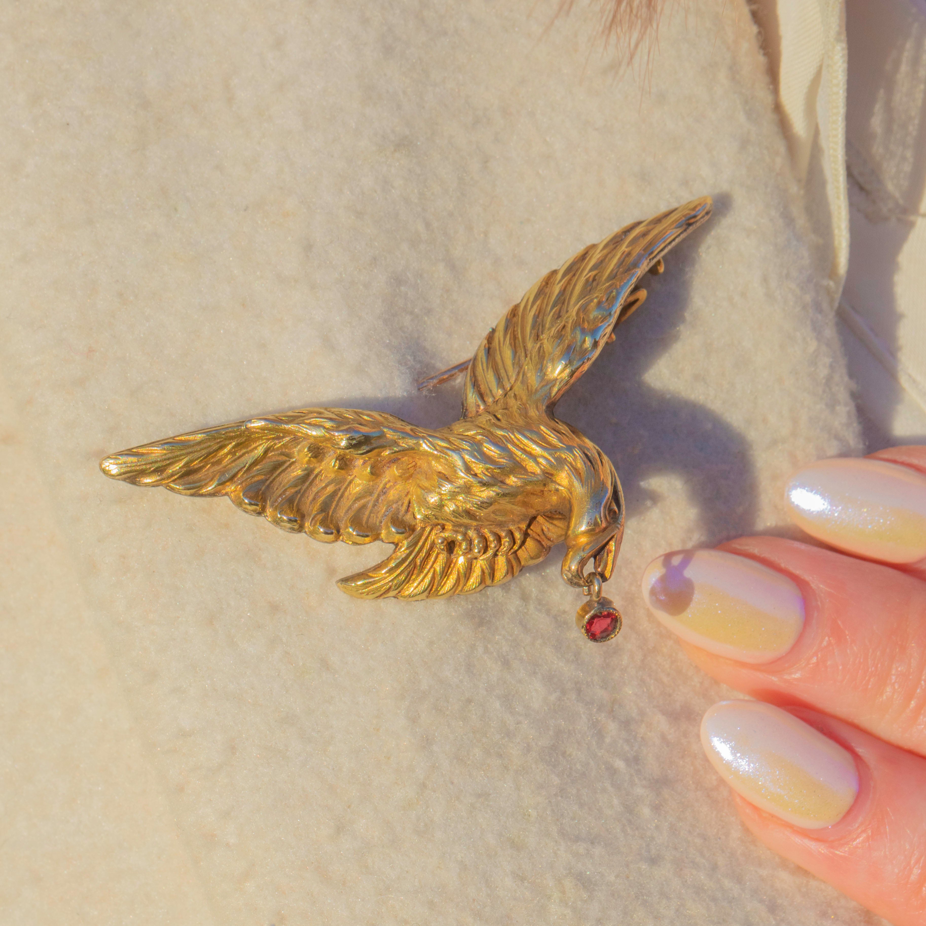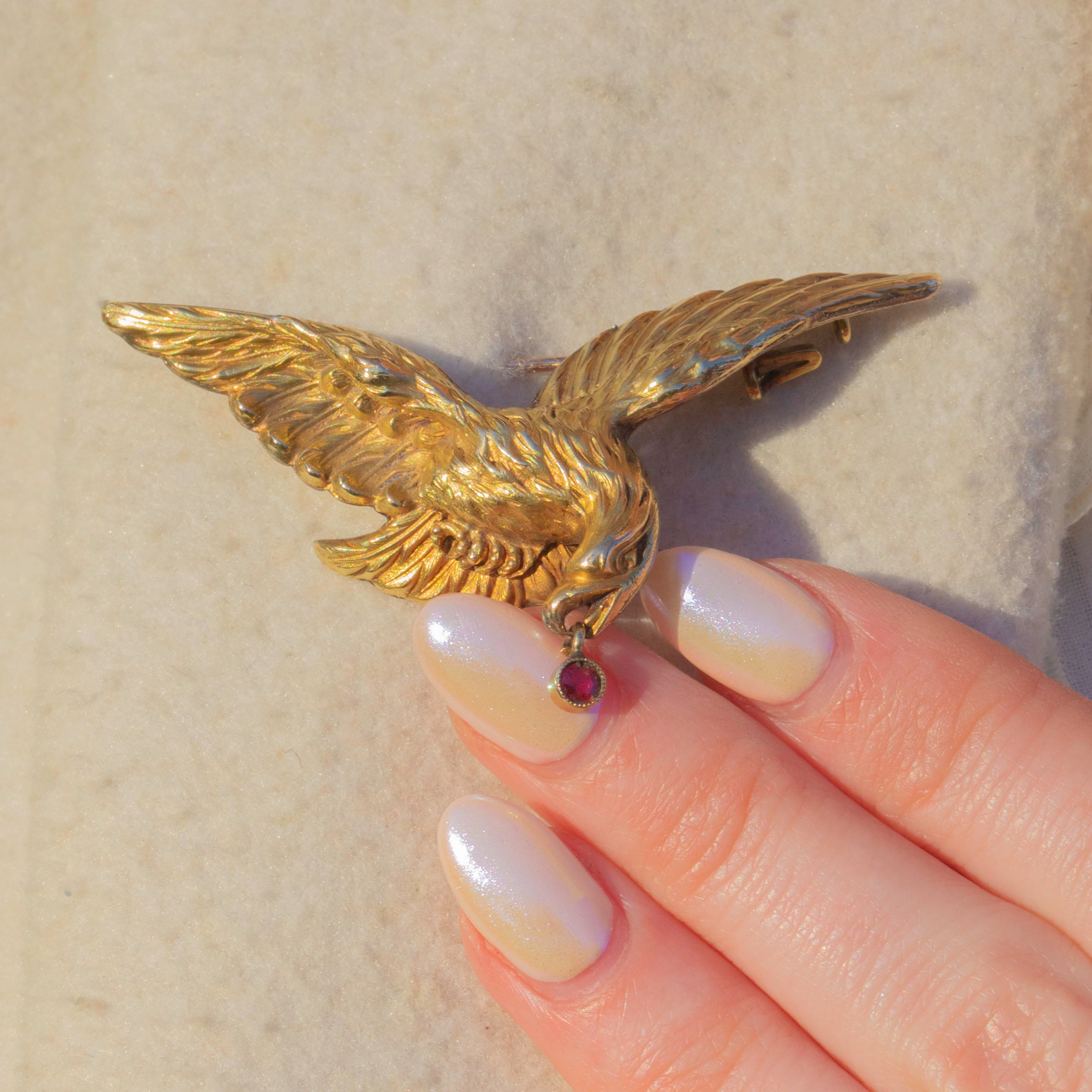 Art Nouveau French Gold Fix Eagle Brooch with Garnet Drop