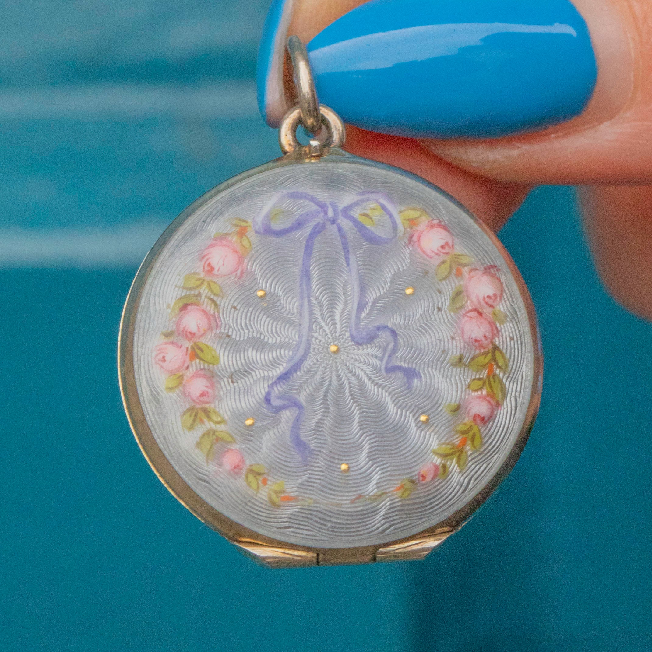 Art Nouveau Guilloche Enamel Locket with Ribbon & Roses