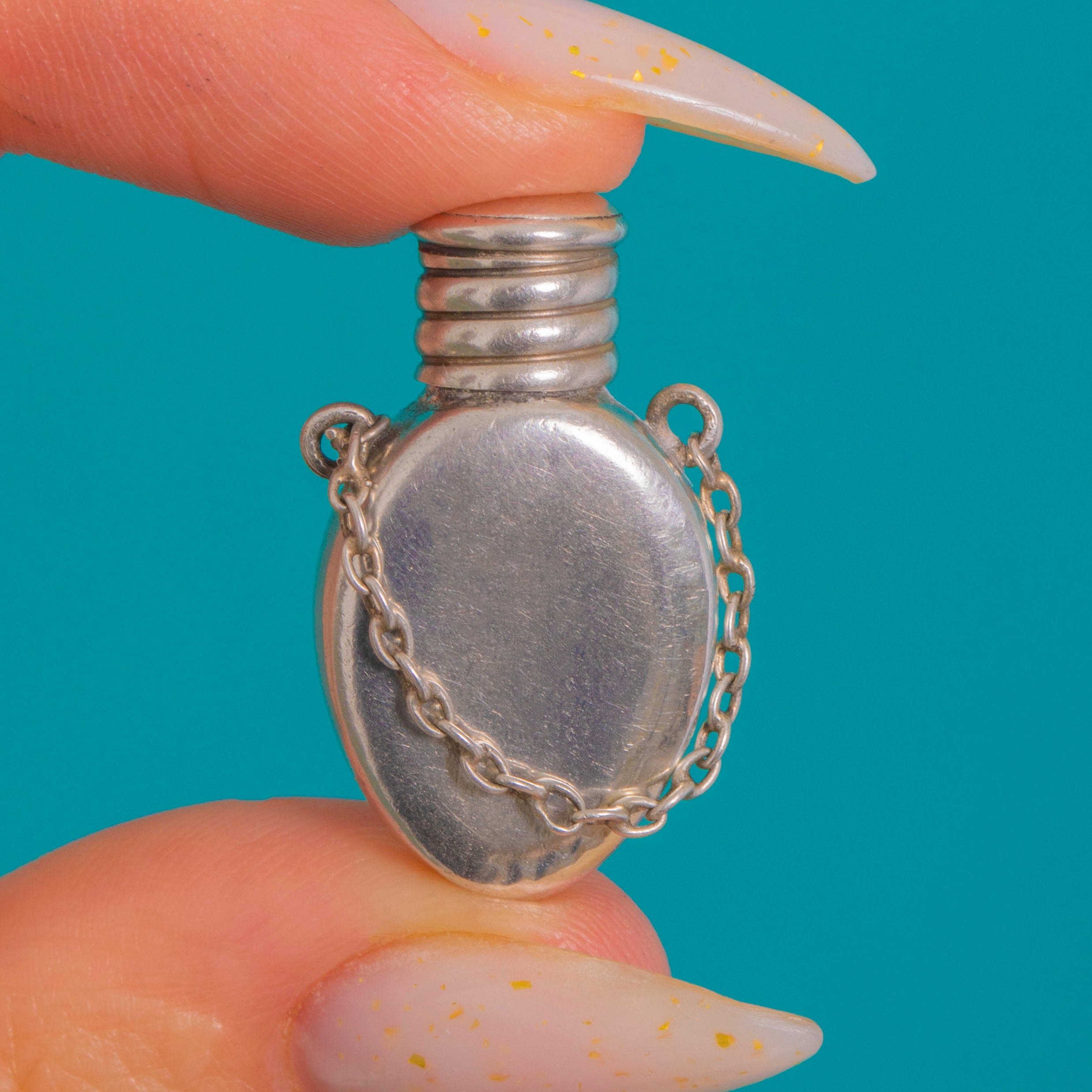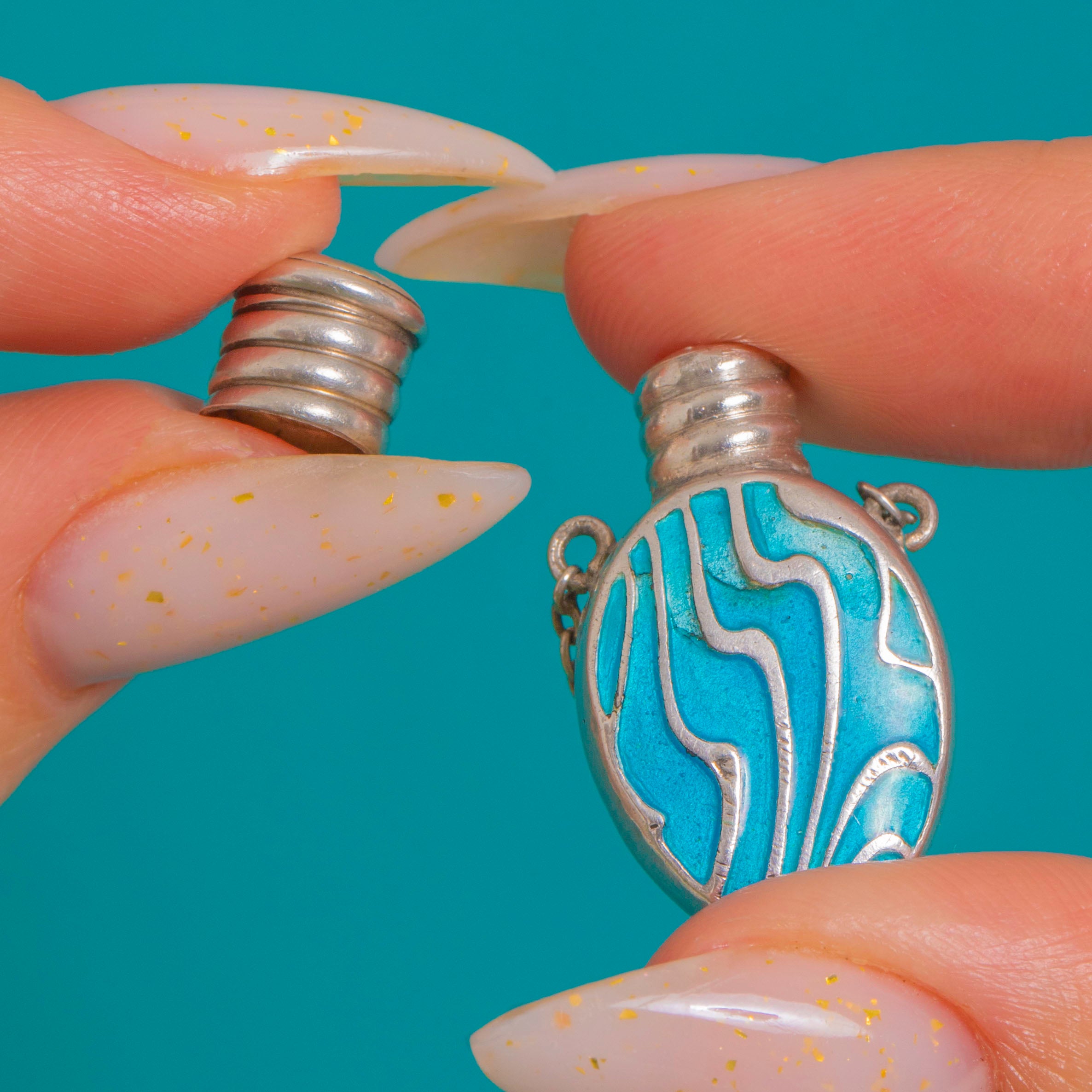 The bottle opens, making it a charming antique “scent keeper” to wear on a chain, ribbon or chatelaine-inspired styling. A perfect little conversation piece for lovers of Arts and Crafts jewellery and Enamelwork.