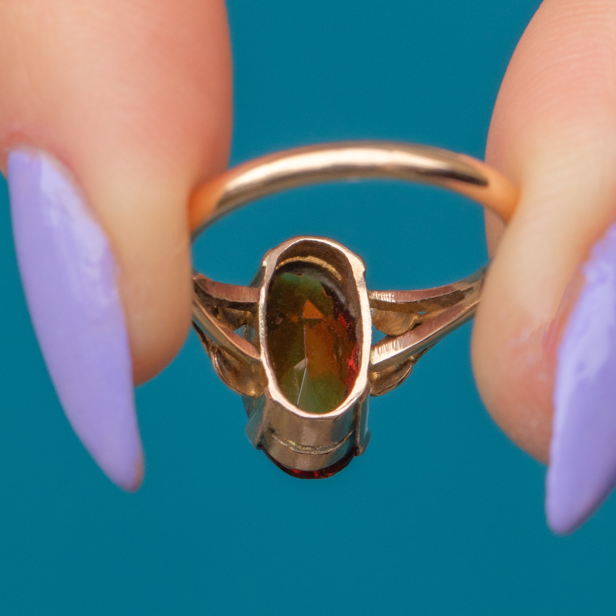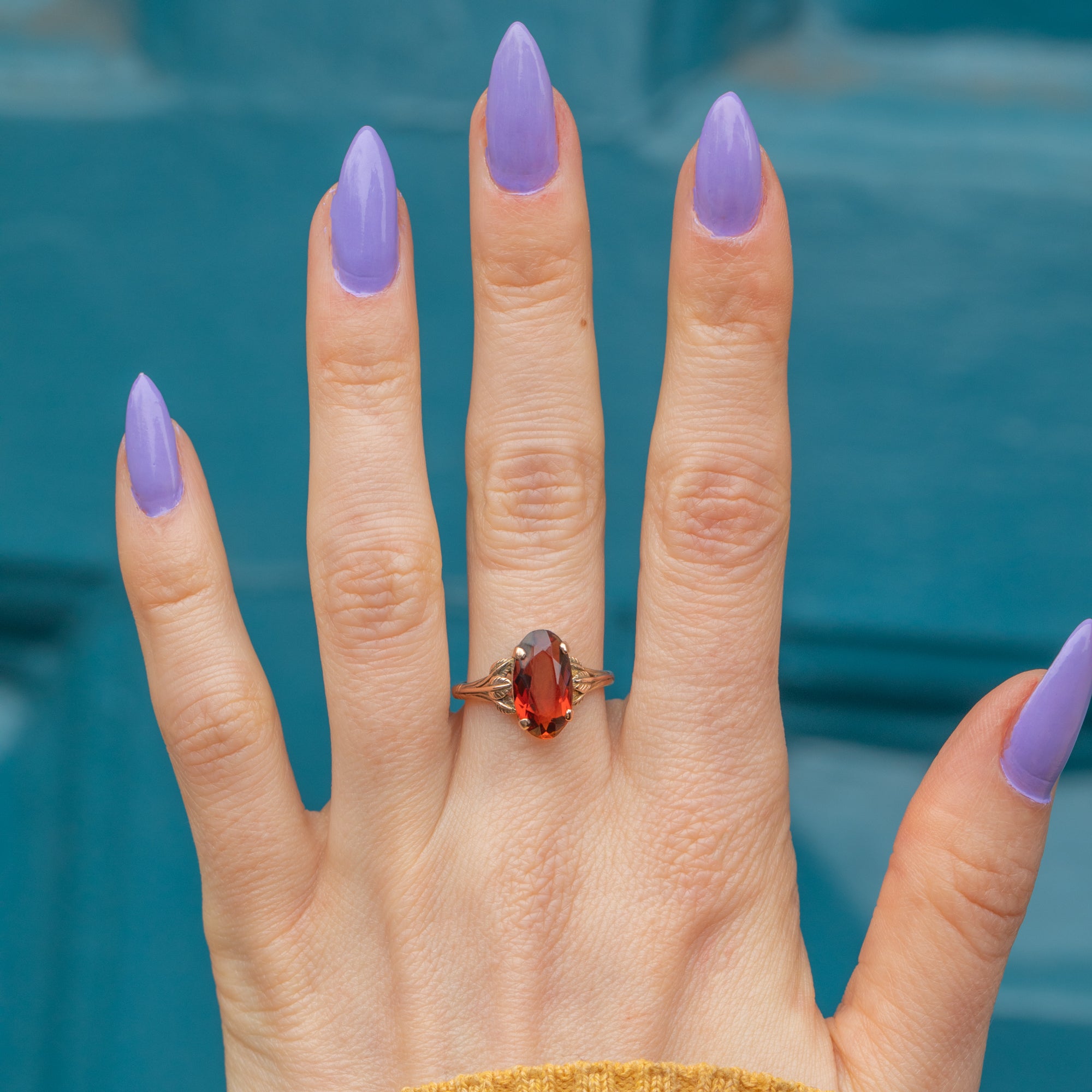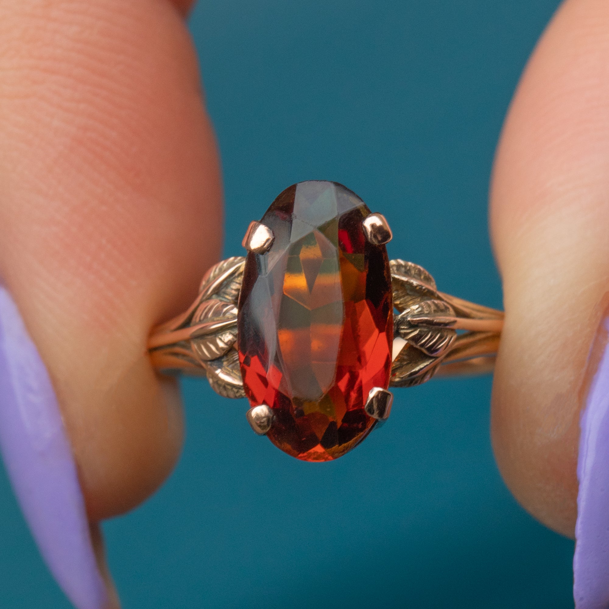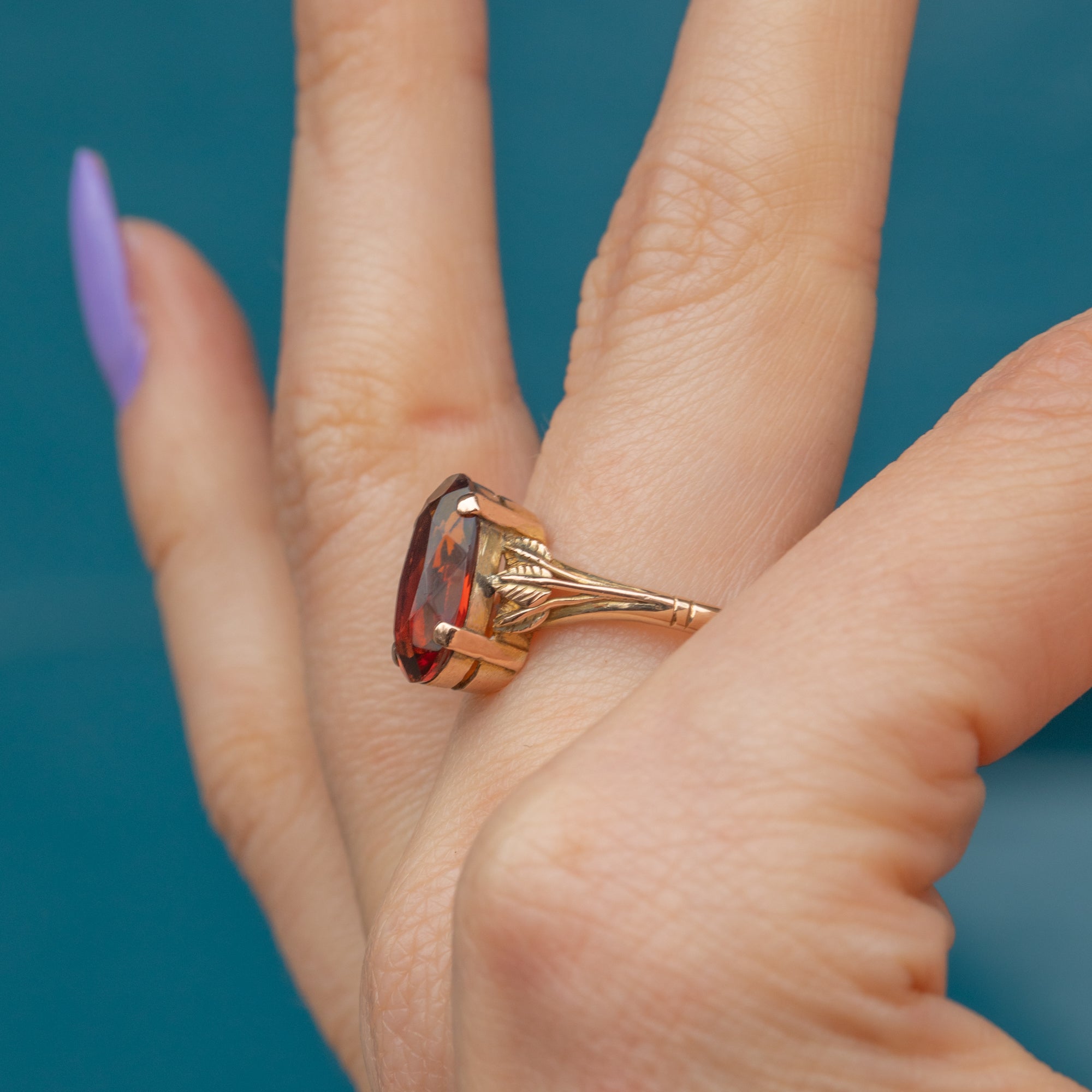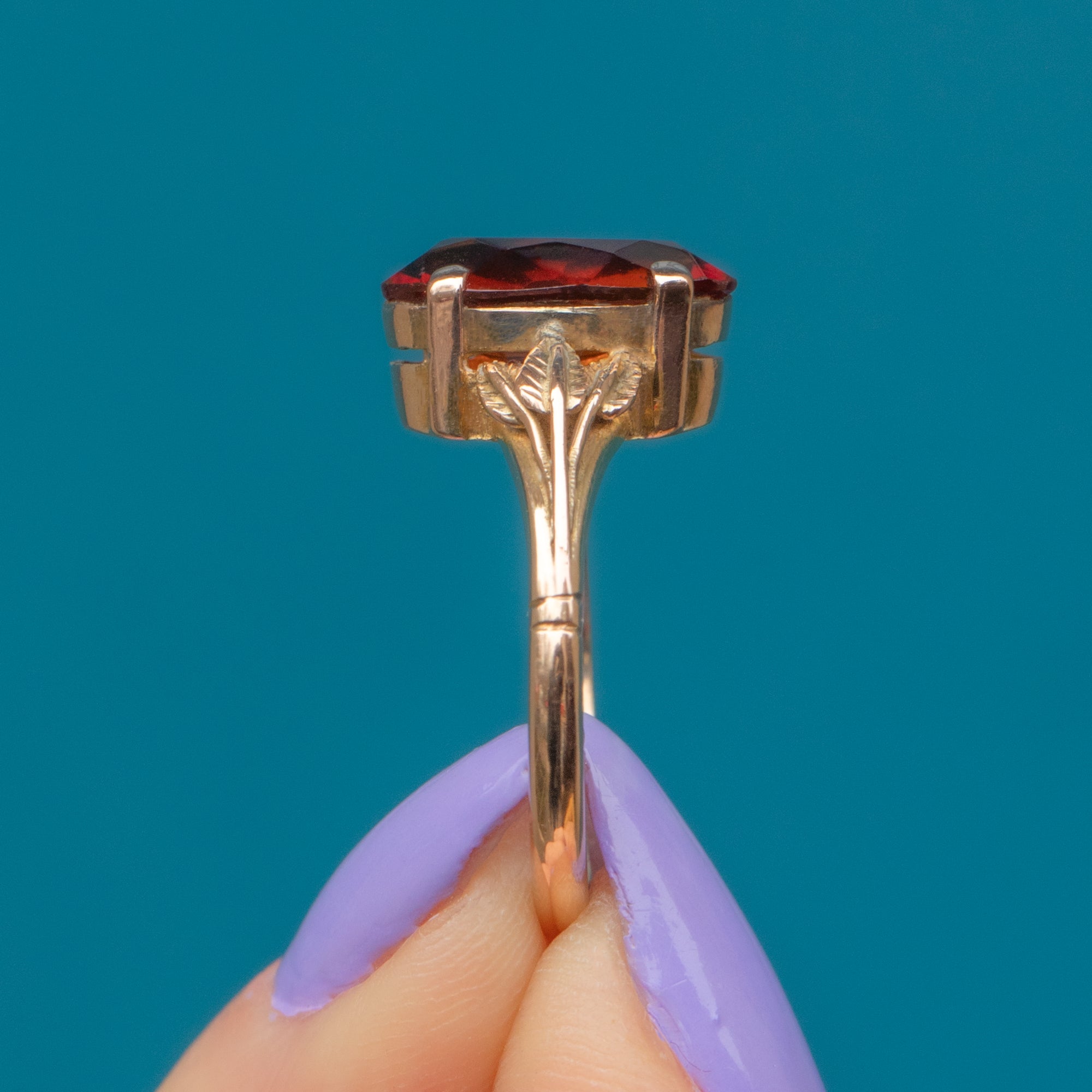 The Citrine is held proudly from the finger in a double basket setting that allows the light to stream through the gem from every angle. The shoulders are decorated with orante leaves, perfectly capturing the nature-inspired aesthetic of the Arts & Crafts movement, creating an eye-catching adornment for your hand!
