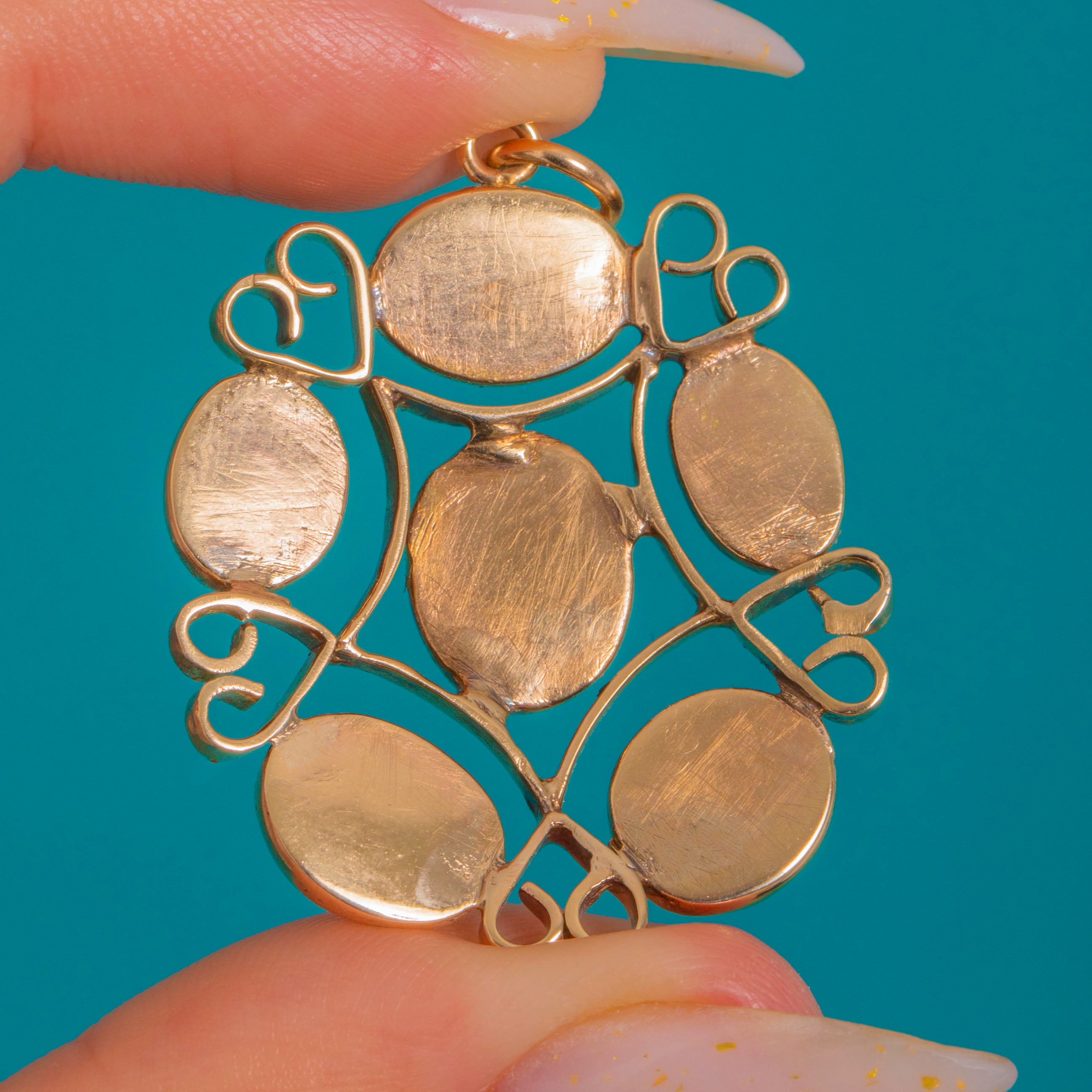 Hand-wrought in the Arts & Crafts tradition, this romantic pendant is a lacework of sinuous scrolls and tender heart-like curls, all crafted in warm 9ct Gold. Five luminous Moonstone cabochons nestle in rubbed-over bezels, their translucent bodies coming alive with soft bluish-white glow as they move.