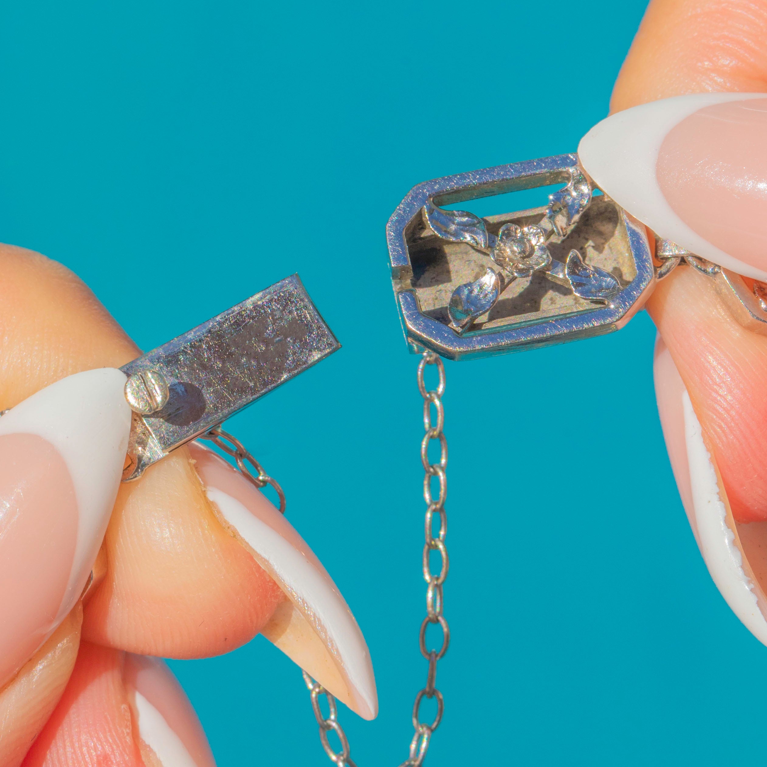 Each Opal is set within a feminine openwork design of wreath-like and floral links, alternating with more sculptural rectangular panels. Crafted in 9ct White Gold and complete with its original safety chain, this bracelet is attributed to Joseph Lawrence, one of Melbourne’s most significant early 20th-century jewellery manufacturers. Their reputation for handmade craftsmanship and bold design shines through in this striking jewel.