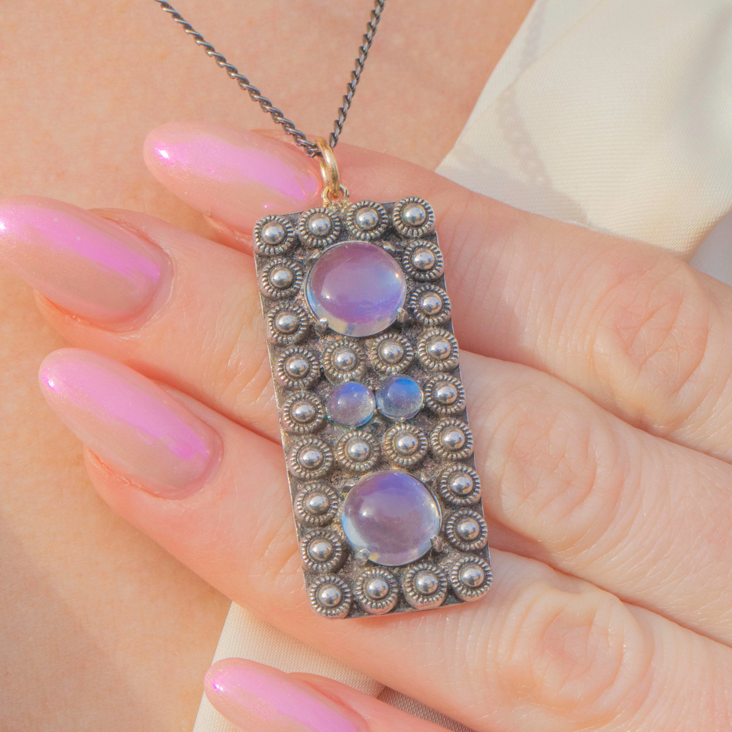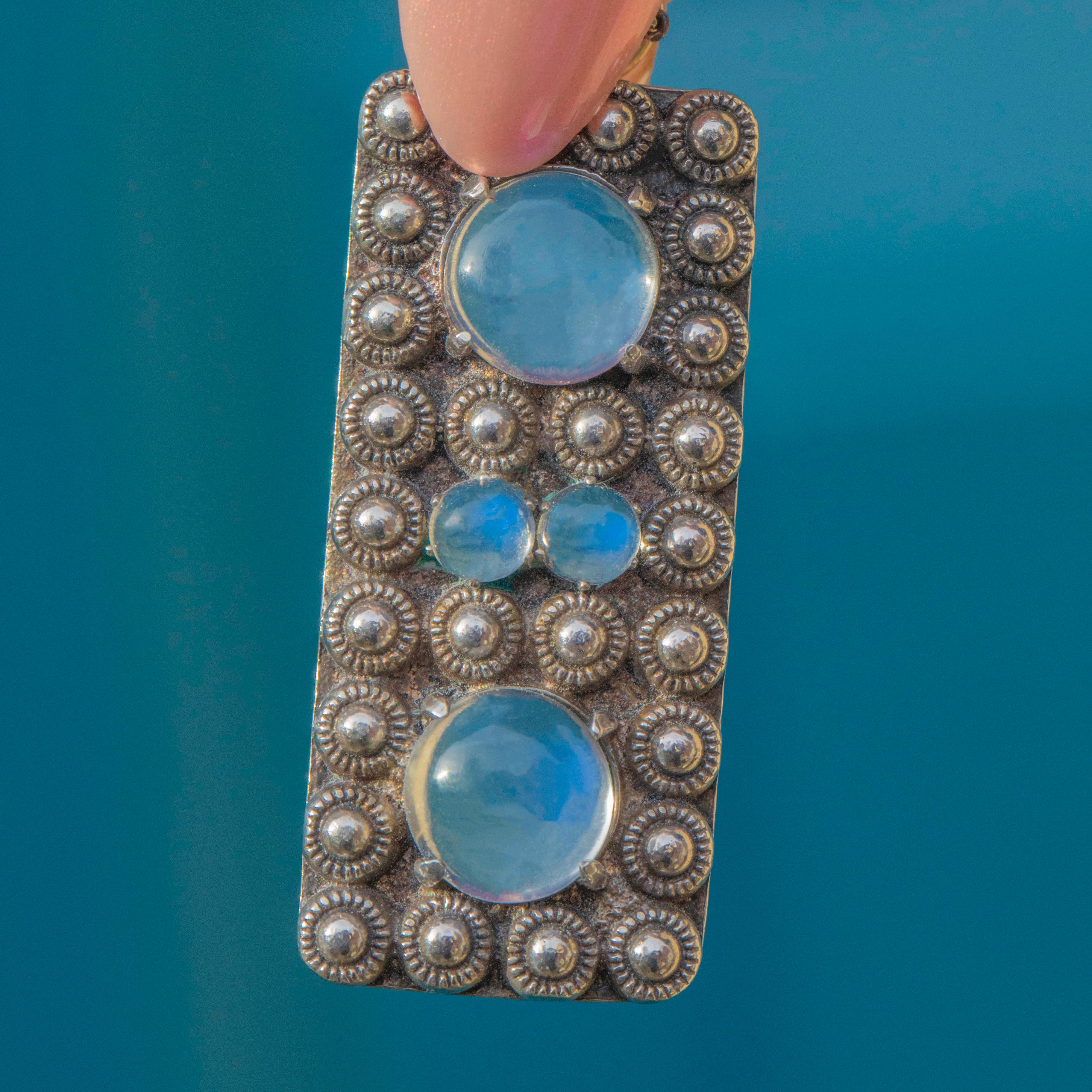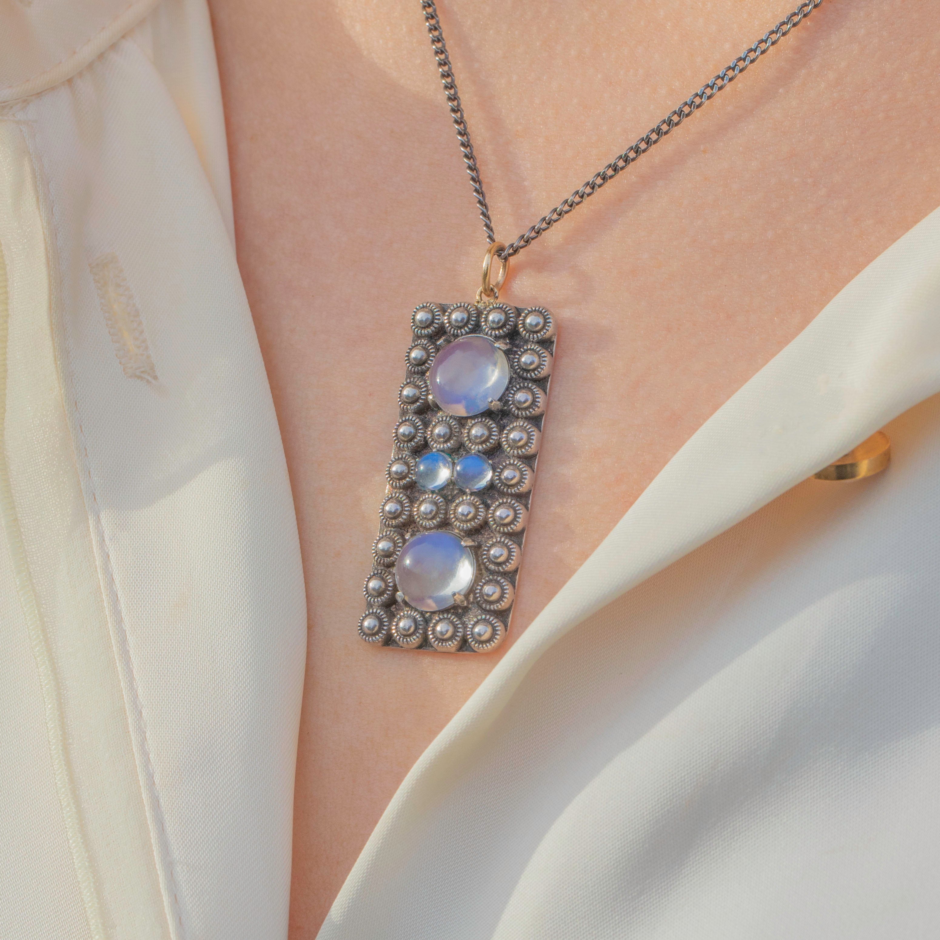 VERY GOOD-EXCELLENT. This Arts & Crafts Silver Moonstone pendant is in wonderful condition. Each Moonstone is radiant and set securely within its Silver setting. There is some slight wear to the back of the pendant commensurate with age, however this cannot be seen while the pendant is worn. The SIlver is lustrous and has accrued a light patina making the details pop and adding to her antique charm.