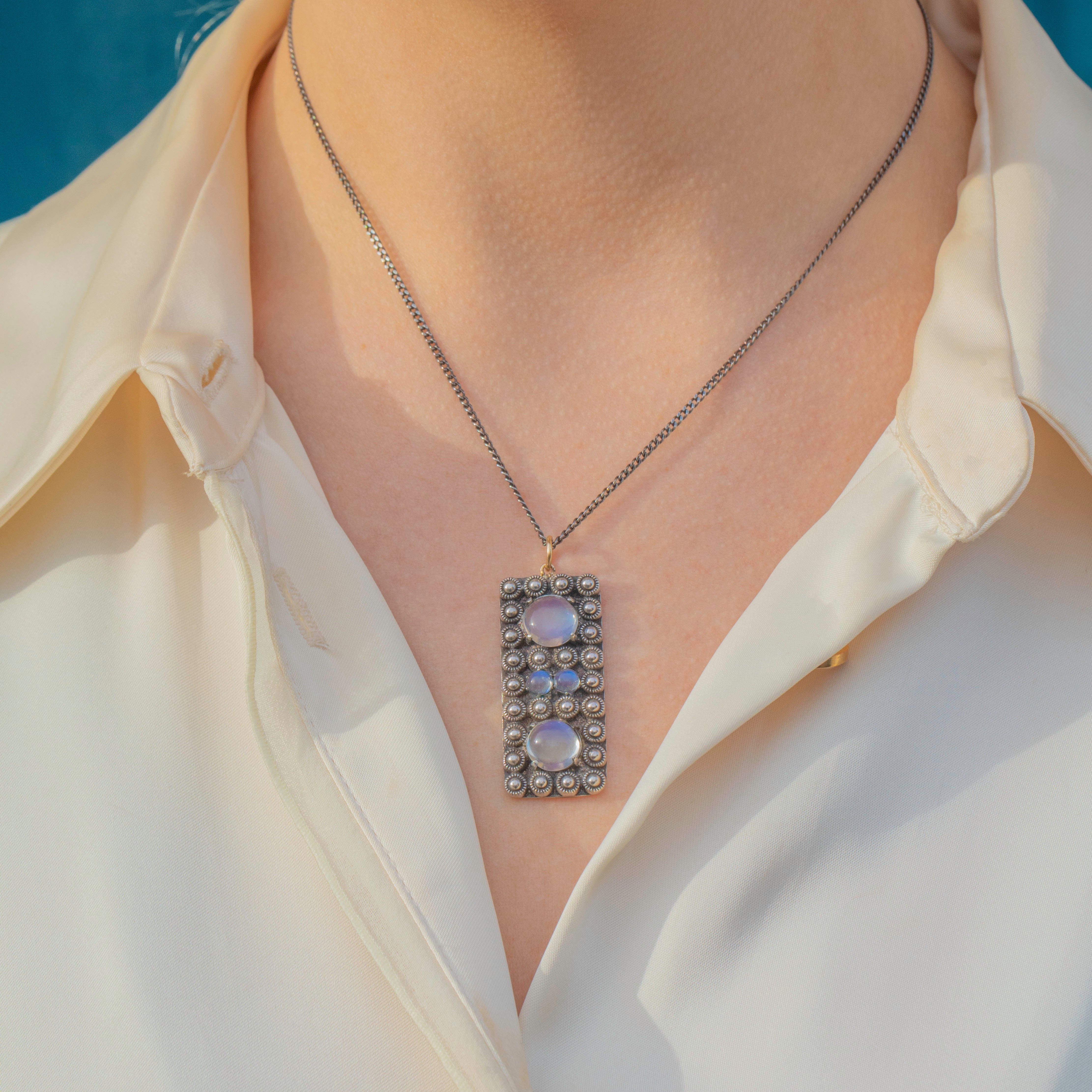 Boasting a combined weight of 3.98ct, her plump Moonstones have an ethereal adularescence that shimmers softly in the light. They are complemented by Silver settings and beaded details, in a classic Arts & Crafts era craftsmanship style.