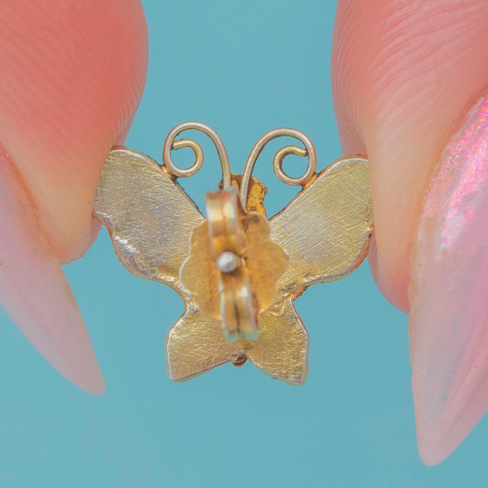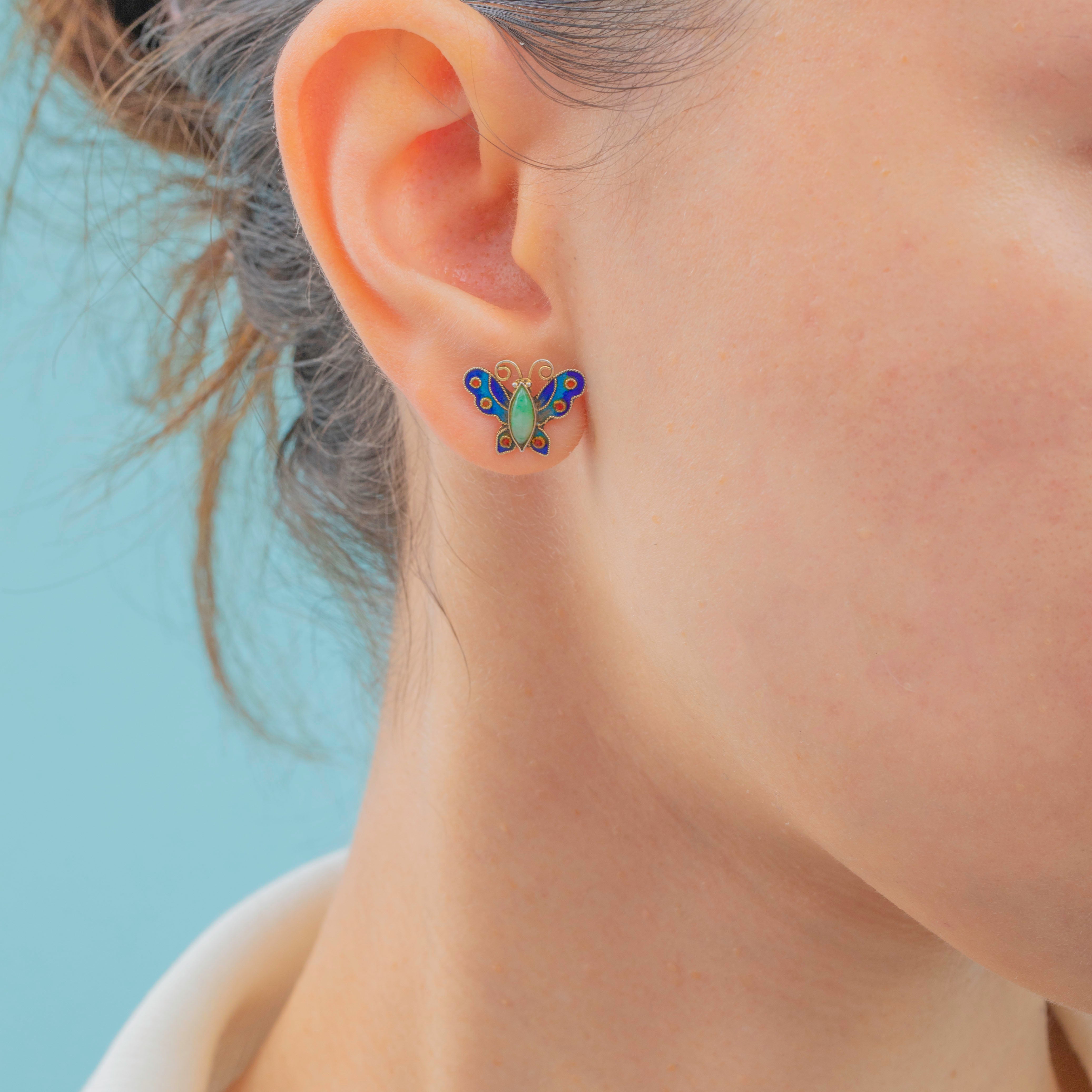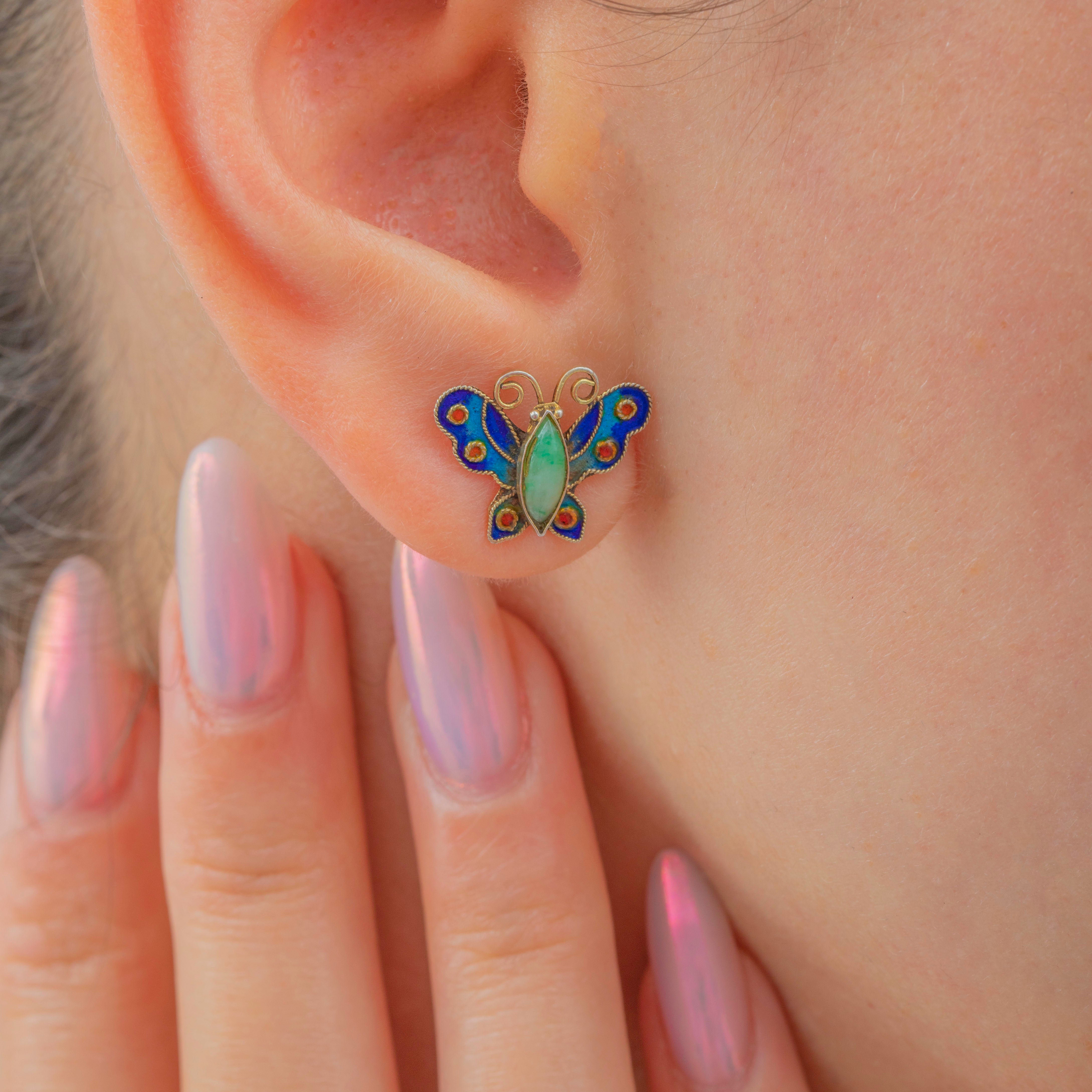 The dainty butterfly wings radiate a gorgeous, saturated blue-green hue and fiery orange Enamel details. Complete with ornately formed antennae, these butterflies are an exemplar of Arts & Crafts era craftsmanship and will look adorable fluttering upon your lobes.