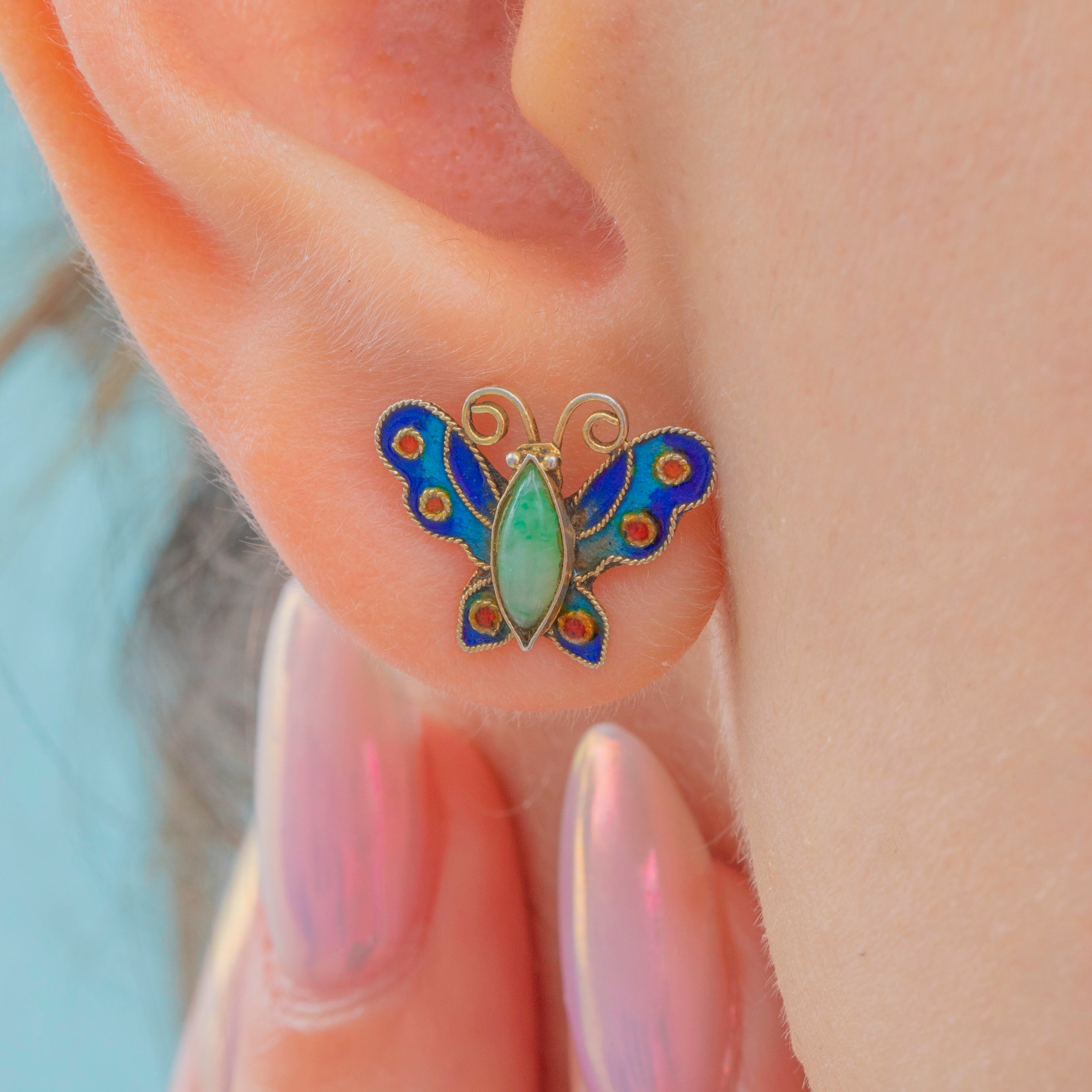 EXCELLENT: The Jade stones are in wonderful condition and are secure in their bezels, with their surrounding Enamel wings having retained a lovely saturation. Formed intricately and secured with butterfly backs, these Arts & Crafts earrings can be worn with confidence!