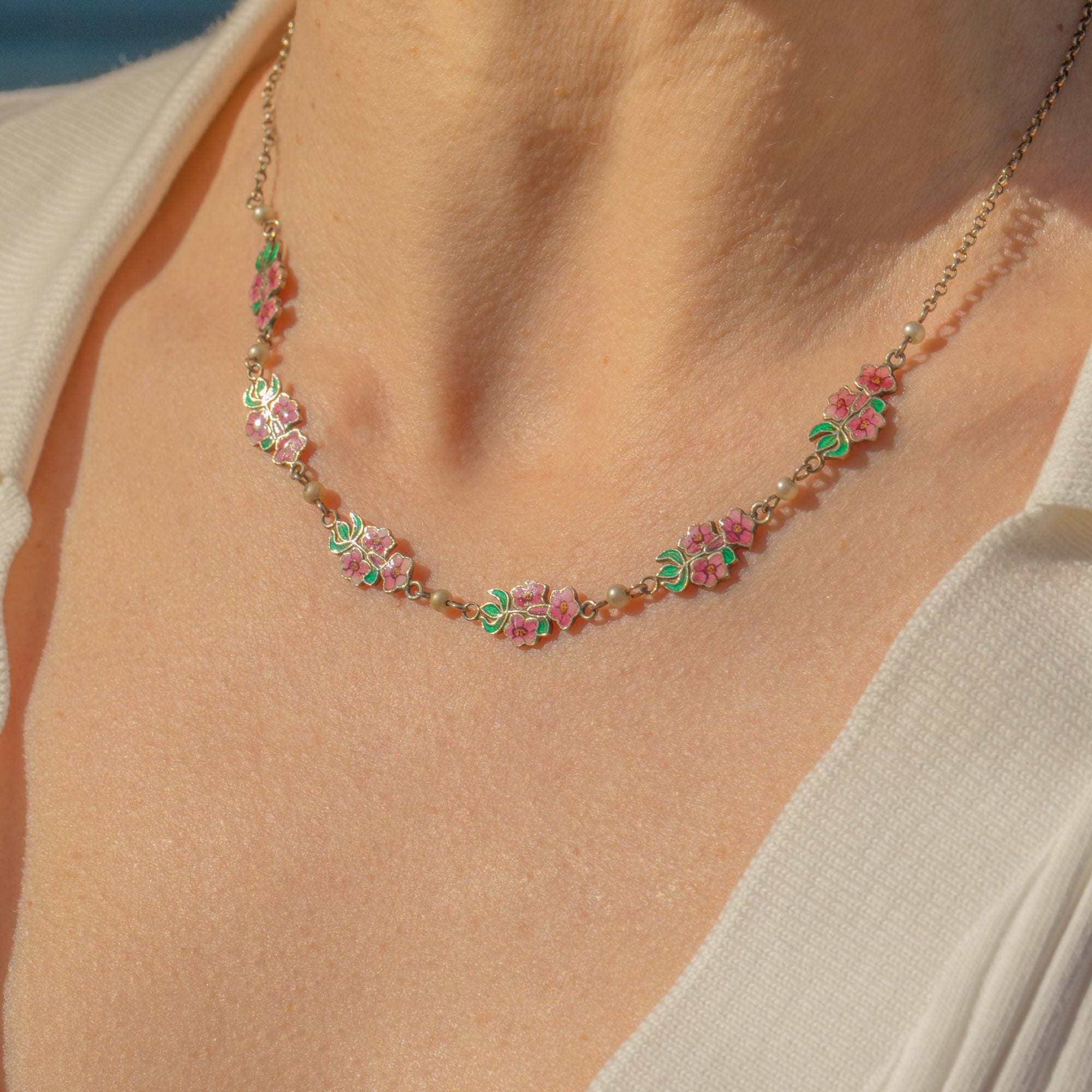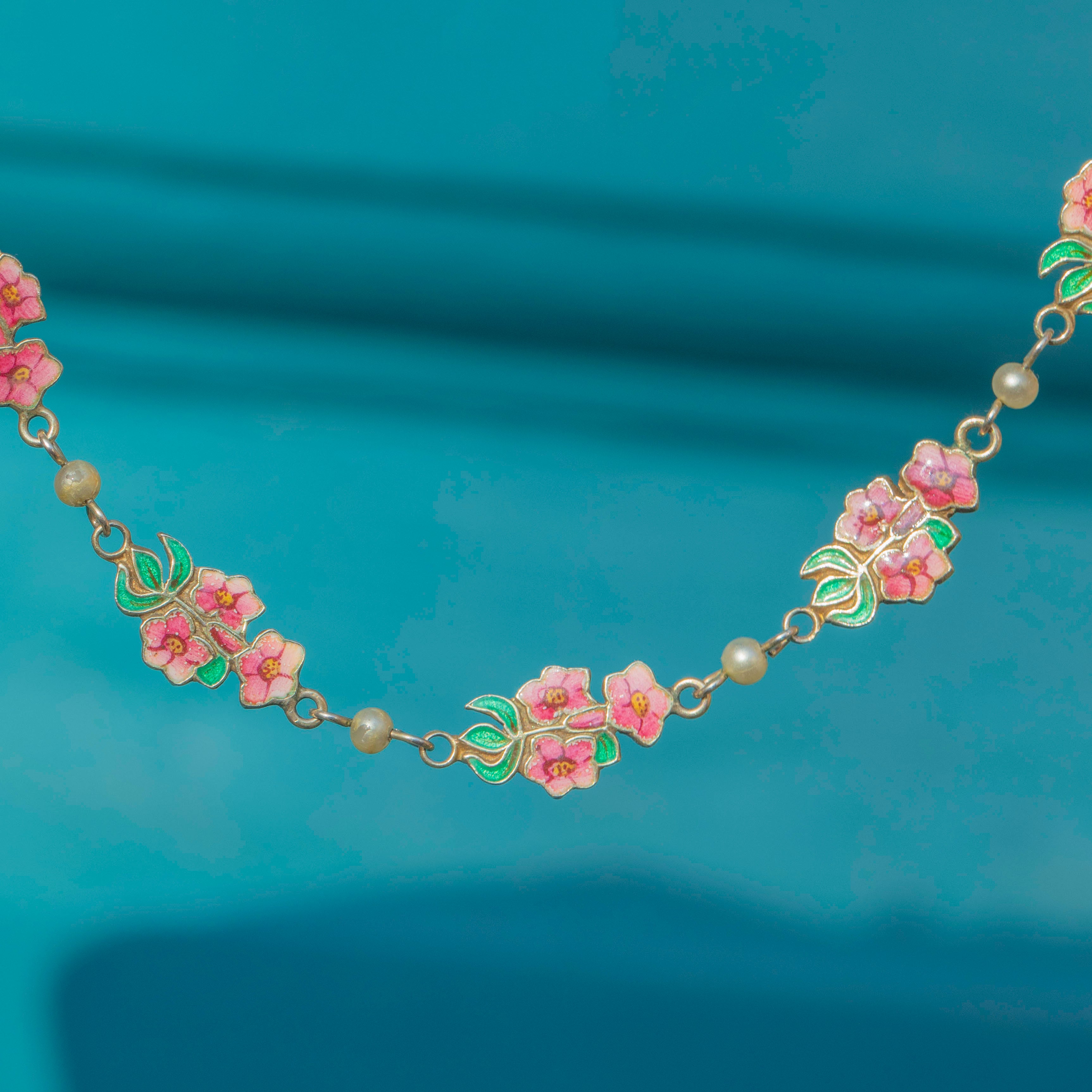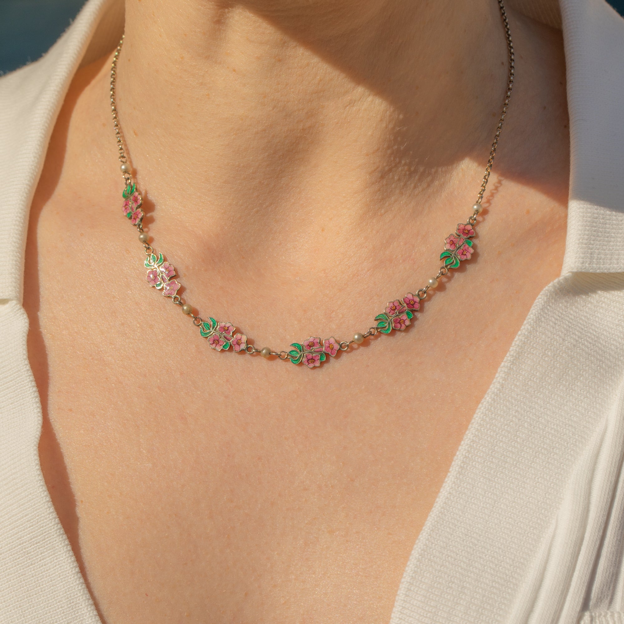 The exquisite craftsmanship and orante details are a hallmark of Arts & Crafts era jewellery, with its nature-inspired design and delicate features. The colour combination of fuchsia pink flowers and bright green leaves accompanied by iridescent Pearls creates an eye-catching piece and is the perfect accessory for your summer wardrobe!