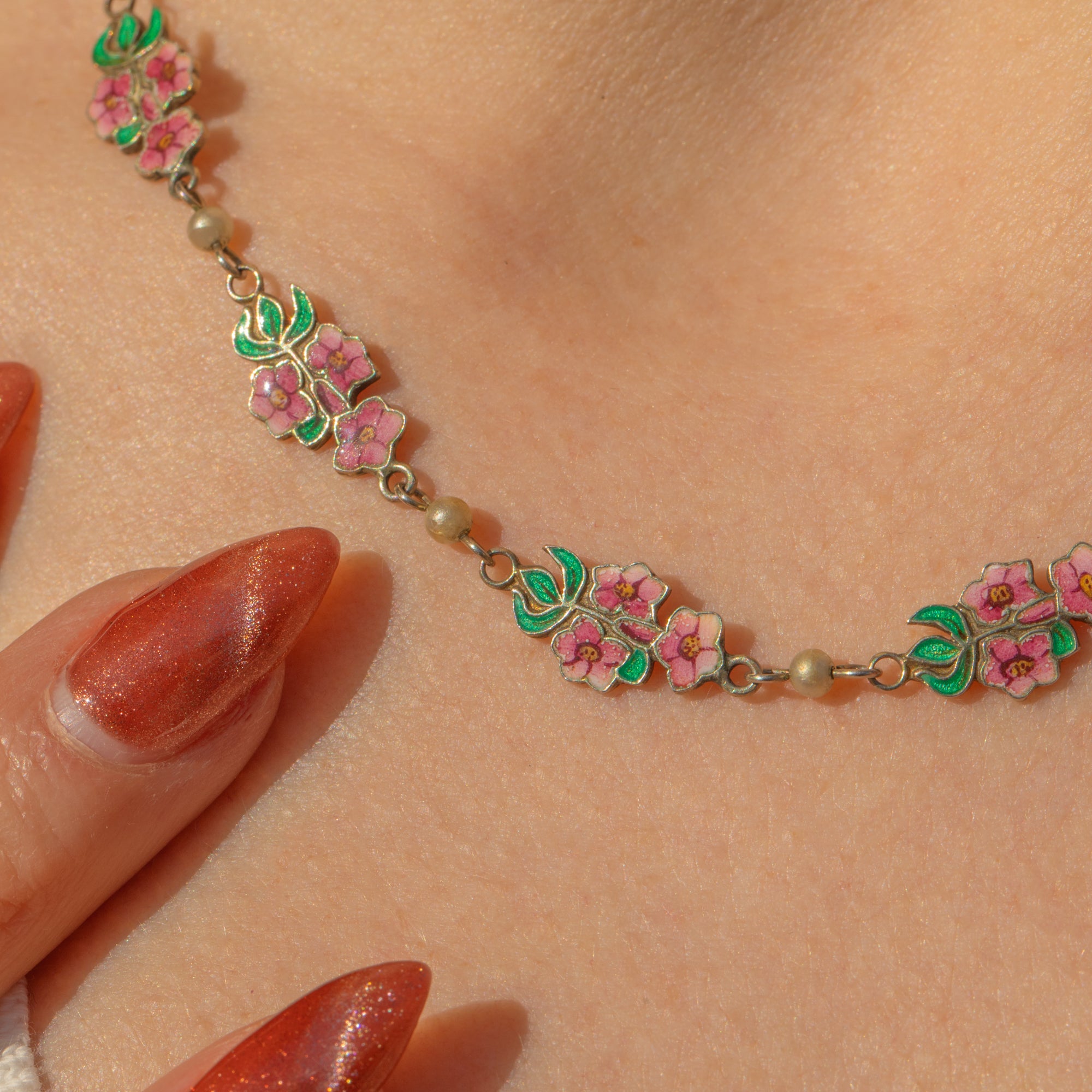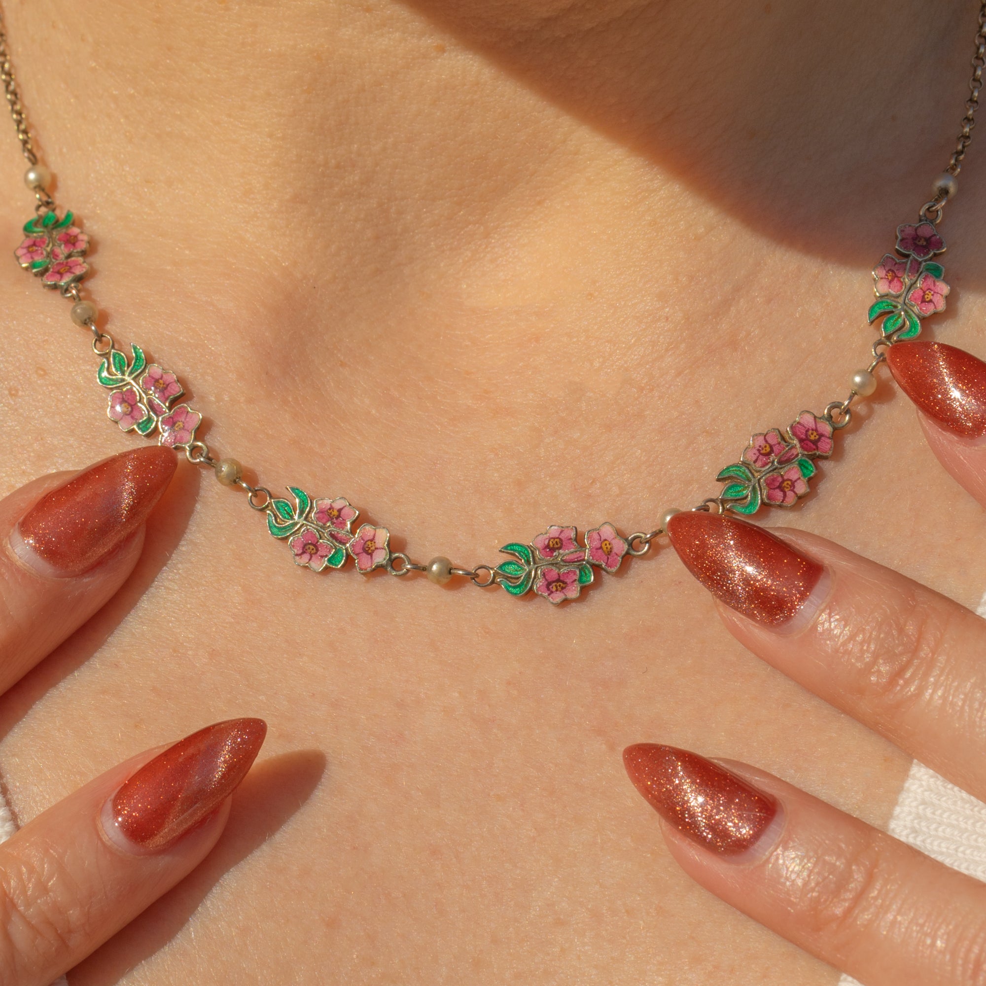 GOOD-VERY GOOD. This Arts & Crafts Silver floral Enamel necklace is in great antique condition. The Enamel work is exquisite and vibrant, with no major signs of wear. The Pearls to show some notable marks, but considering that they're fully exposed and are still securely connected after 100 years, this is easily forgiven. The Silver components are all securely affixed, with some general age-related surface wear throughout. The links are robust and the clasp provides secure wear, allowing you to enjoy this antique Enamel necklace with confidence!