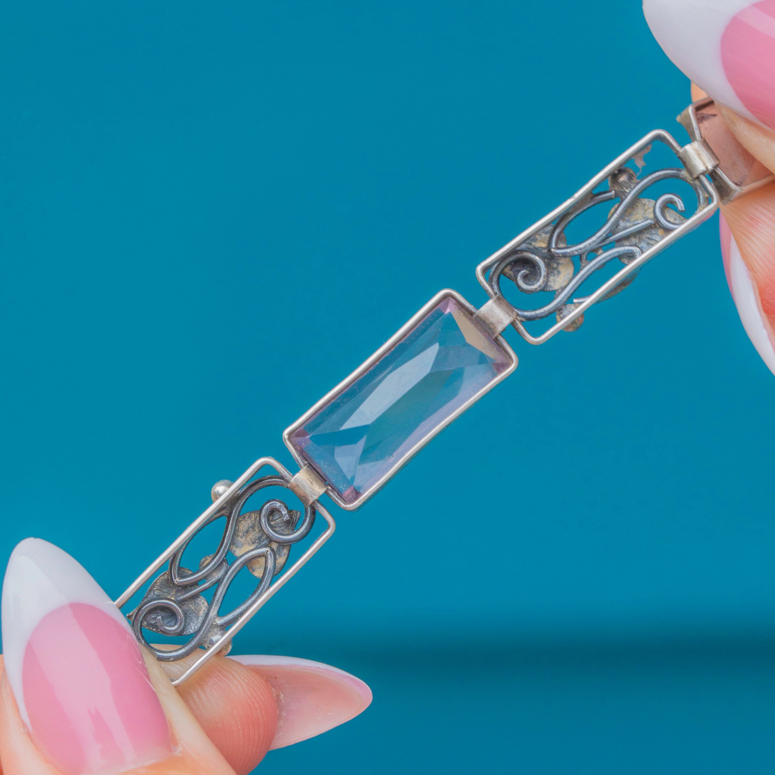 VERY GOOD-EXCELLENT: This antique bracelet has been wonderfully preserved, with each link remaining secure and robust. The Amethysts are radiant, with only very minor fleabites to the gemstones commensurate with age. The Silver has built a nice patina with age, and complete with its clasp in perfect working order, this Arts and Crafts bracelet can be worn with utmost confidence!