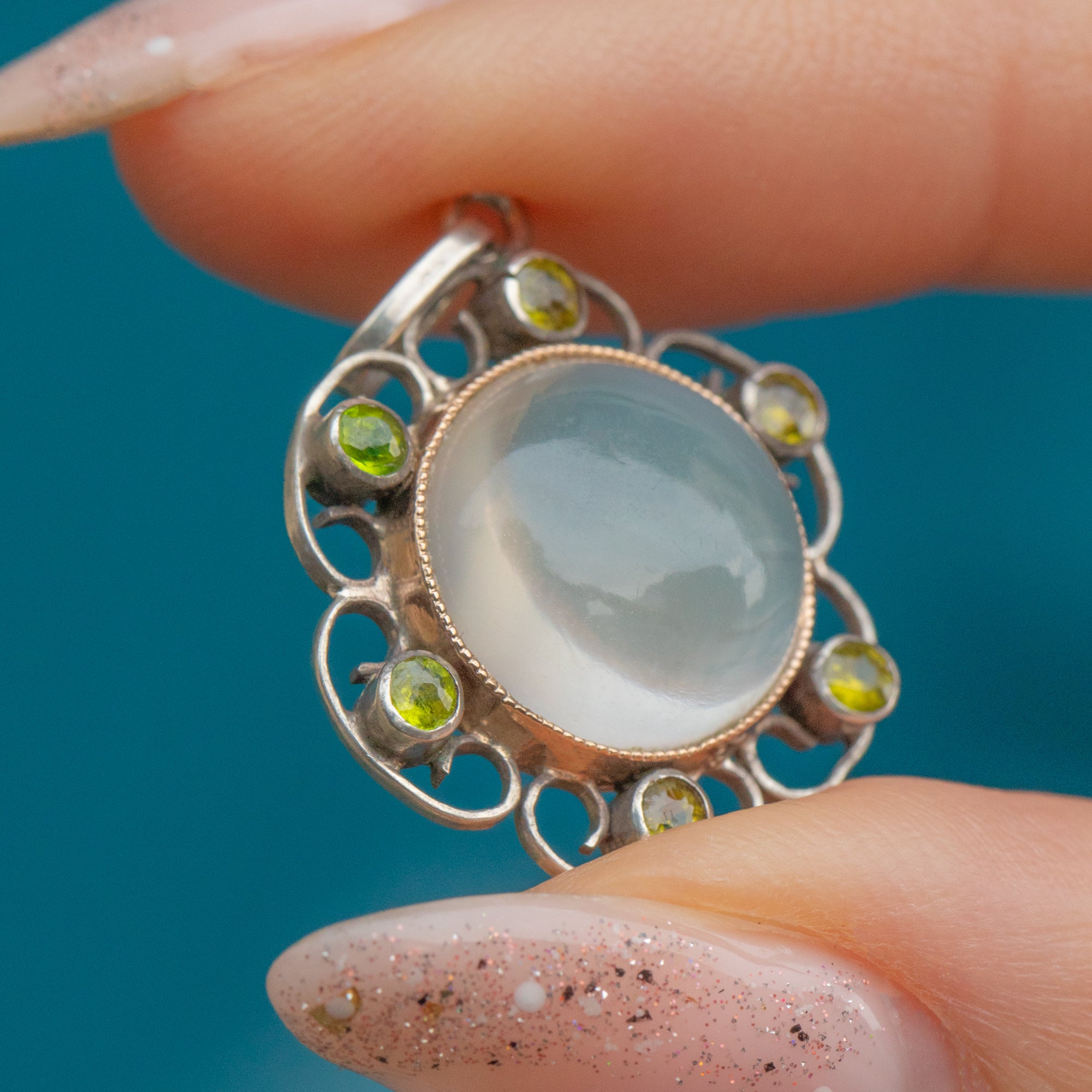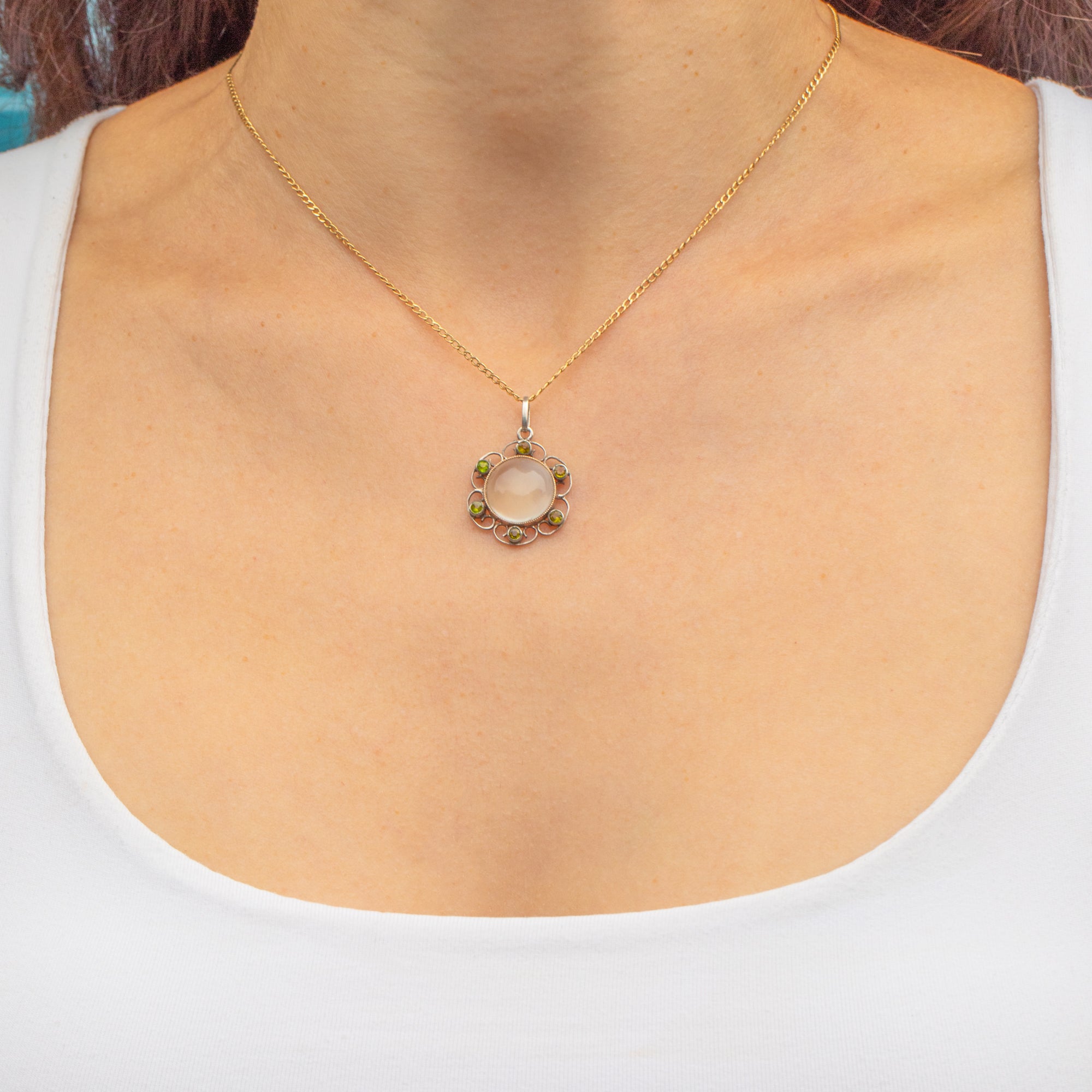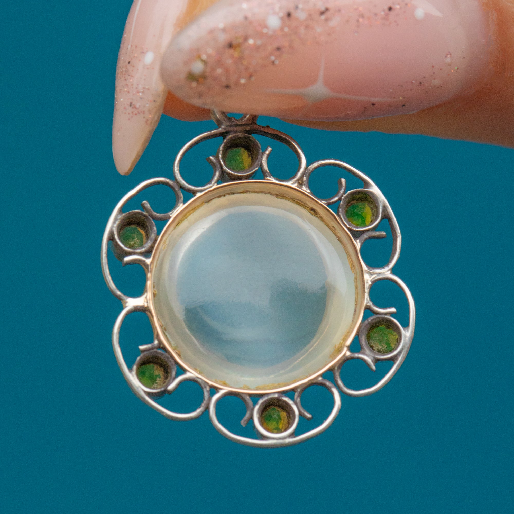 Akin to petals, her Moonstone is surrounded by green Paste inlaid amongst curvaceous Silver wire work. Simply suspend this antique Moonstone pendant from any antique chain and she will make a delightful centre piece; you'll be sure to reach for her time and time again!