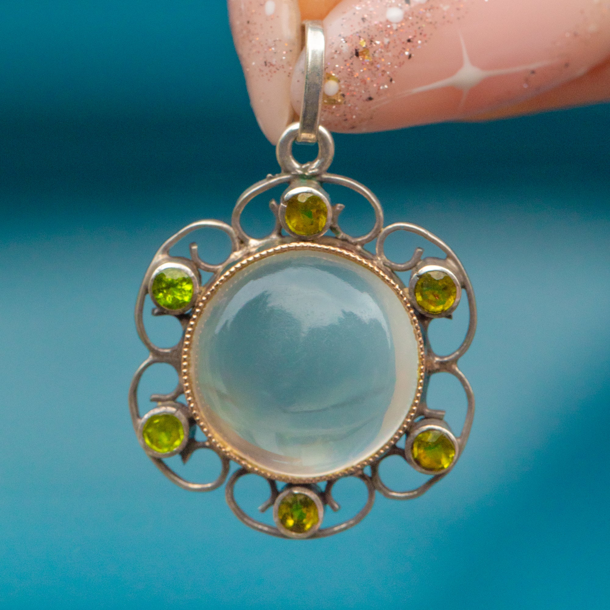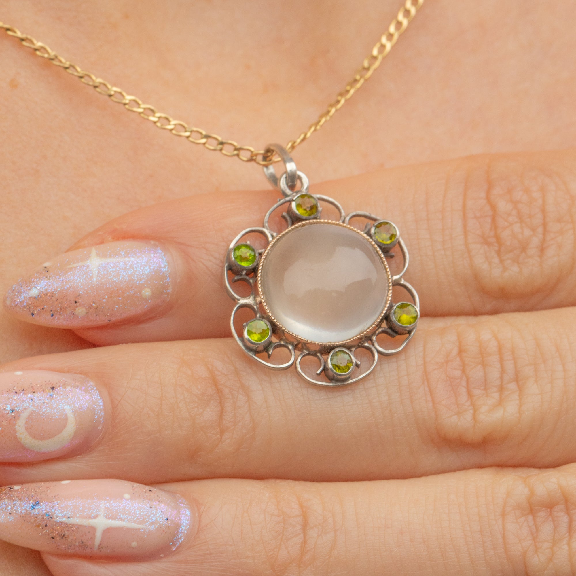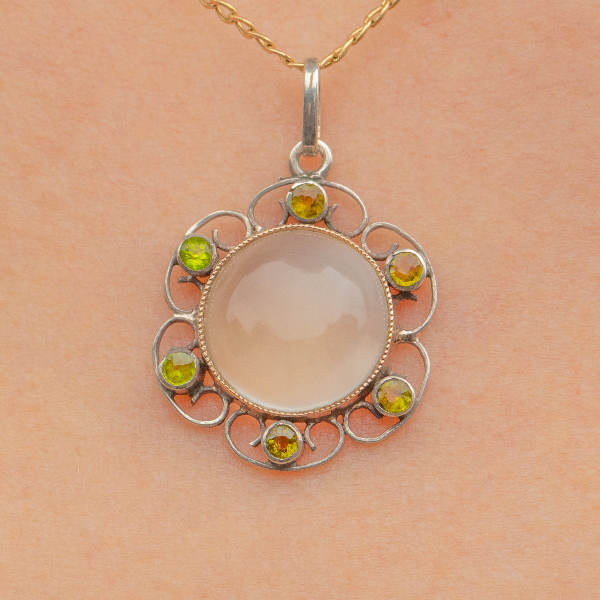 Akin to petals, her Moonstone is surrounded by green Paste inlaid amongst curvaceous Silver wire work. Simply suspend this antique Moonstone pendant from any antique chain and she will make a delightful centre piece; you'll be sure to reach for her time and time again!