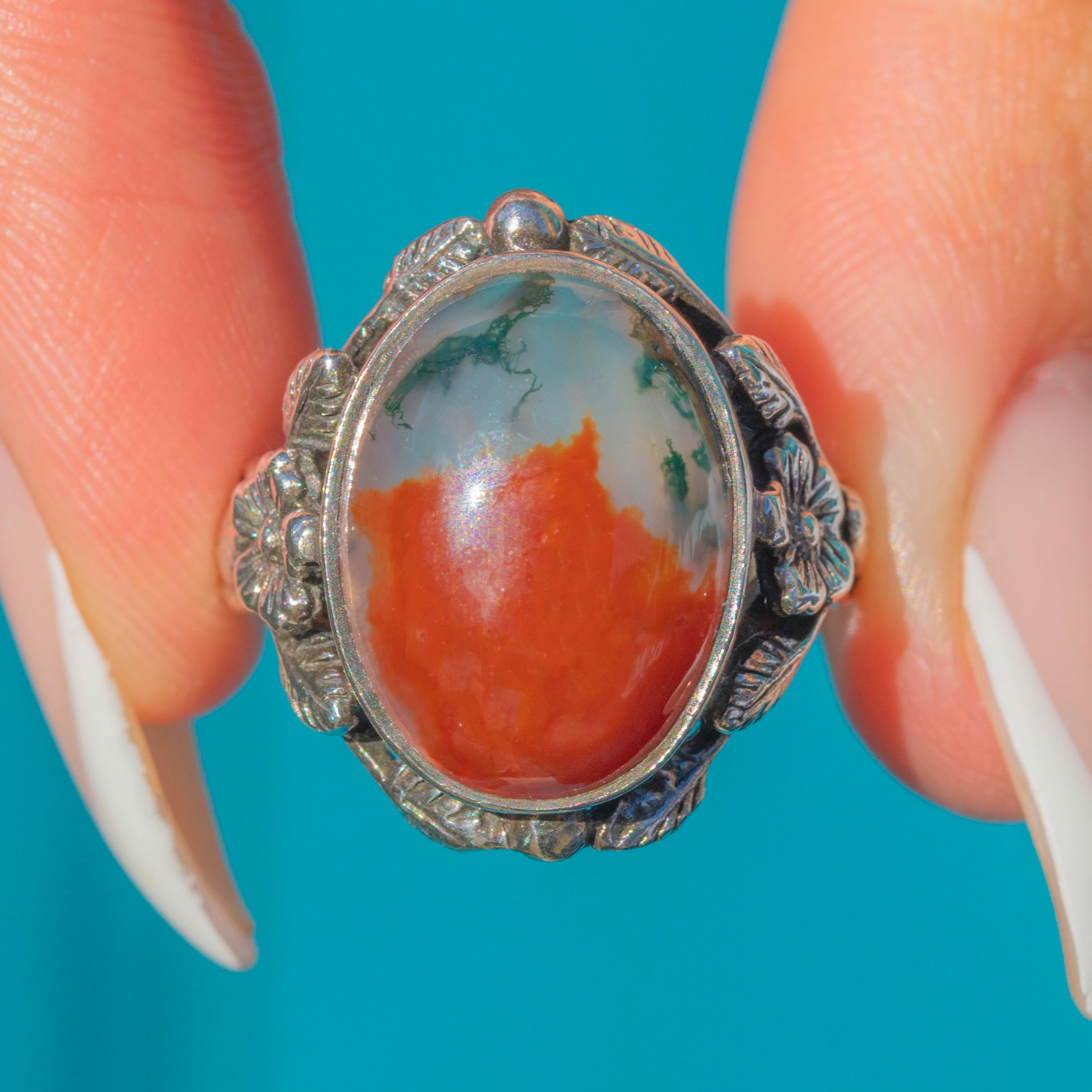 An exceptional Arts & Crafts ring by celebrated designer Bernard Instone, set with a striking Moss Agate cabochon. The natural inclusions within the Agate create a unique, fern-like landscape that makes every stone one-of-a-kind. Its domed cabochon cut enhances the depth and beauty of the gemstone, which glows warmly against the aged Silver setting with delightful floral detailing.