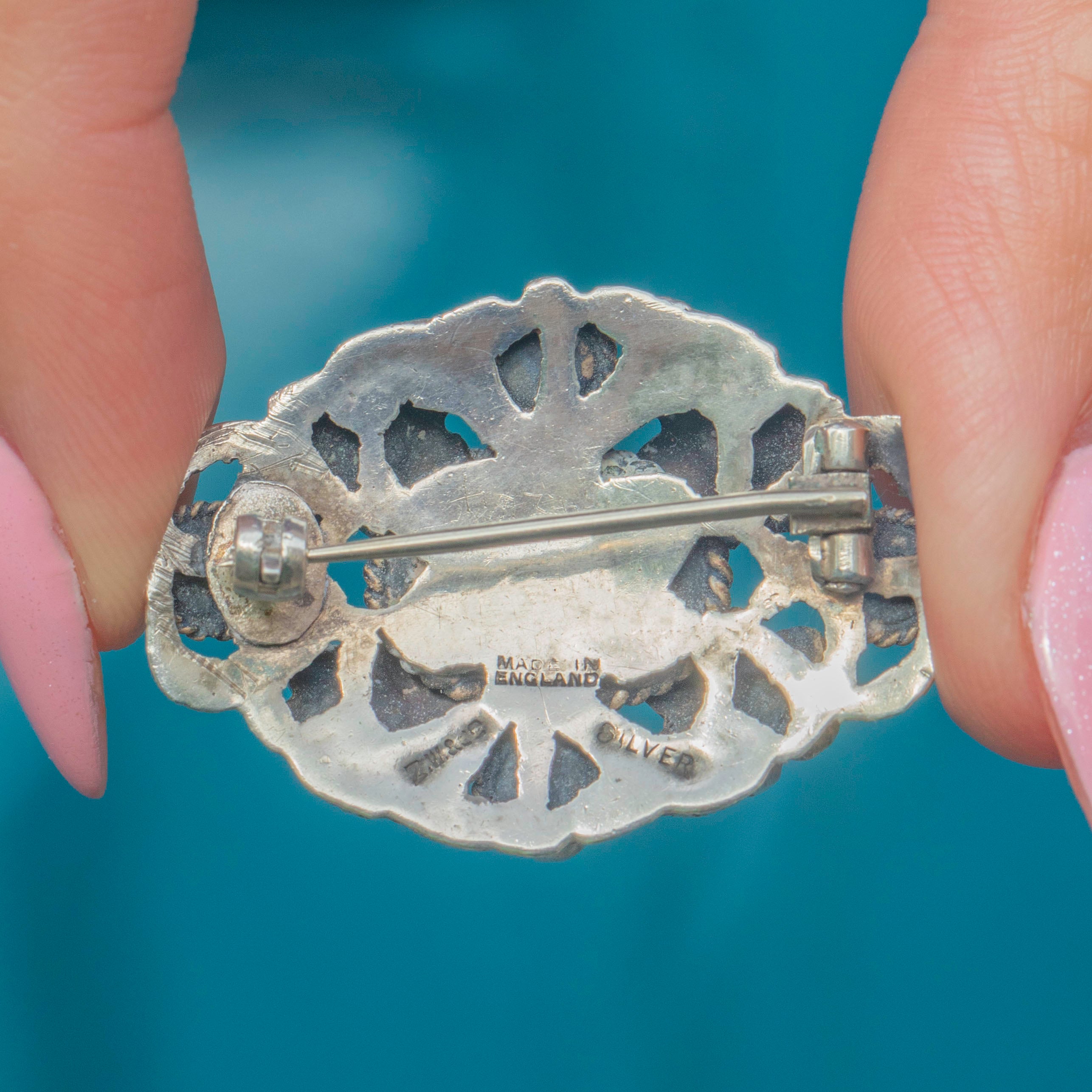 The hallmarks on the back indicate that this piece was crafted by Zoltan White, a celebrated Arts & Crafts jeweller renowned for his Austro-Hungarian influenced designs. In true Arts & Crafts era style, this antique brooch is heavily decorated with nature-inspired motifs, creating a stand-out piece.