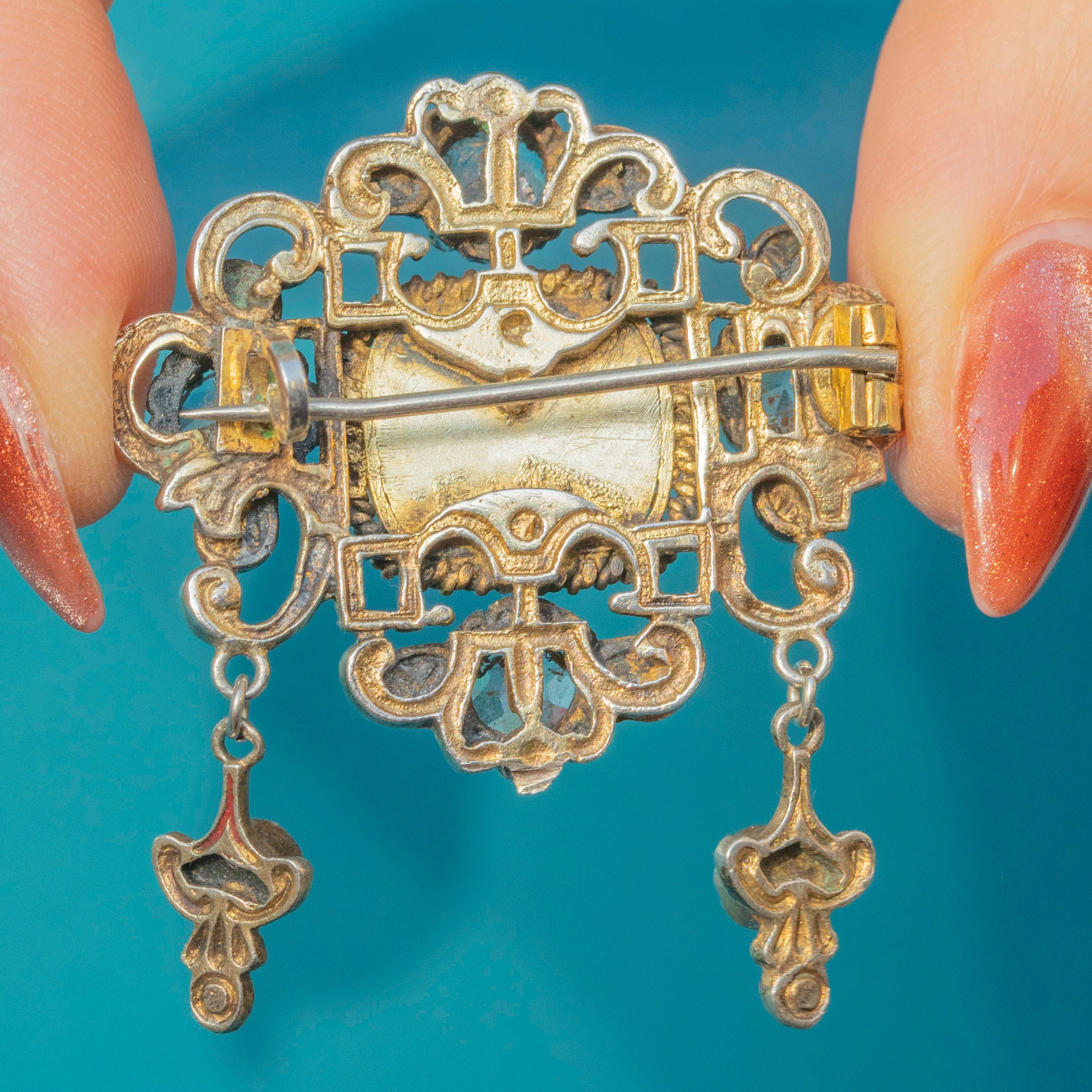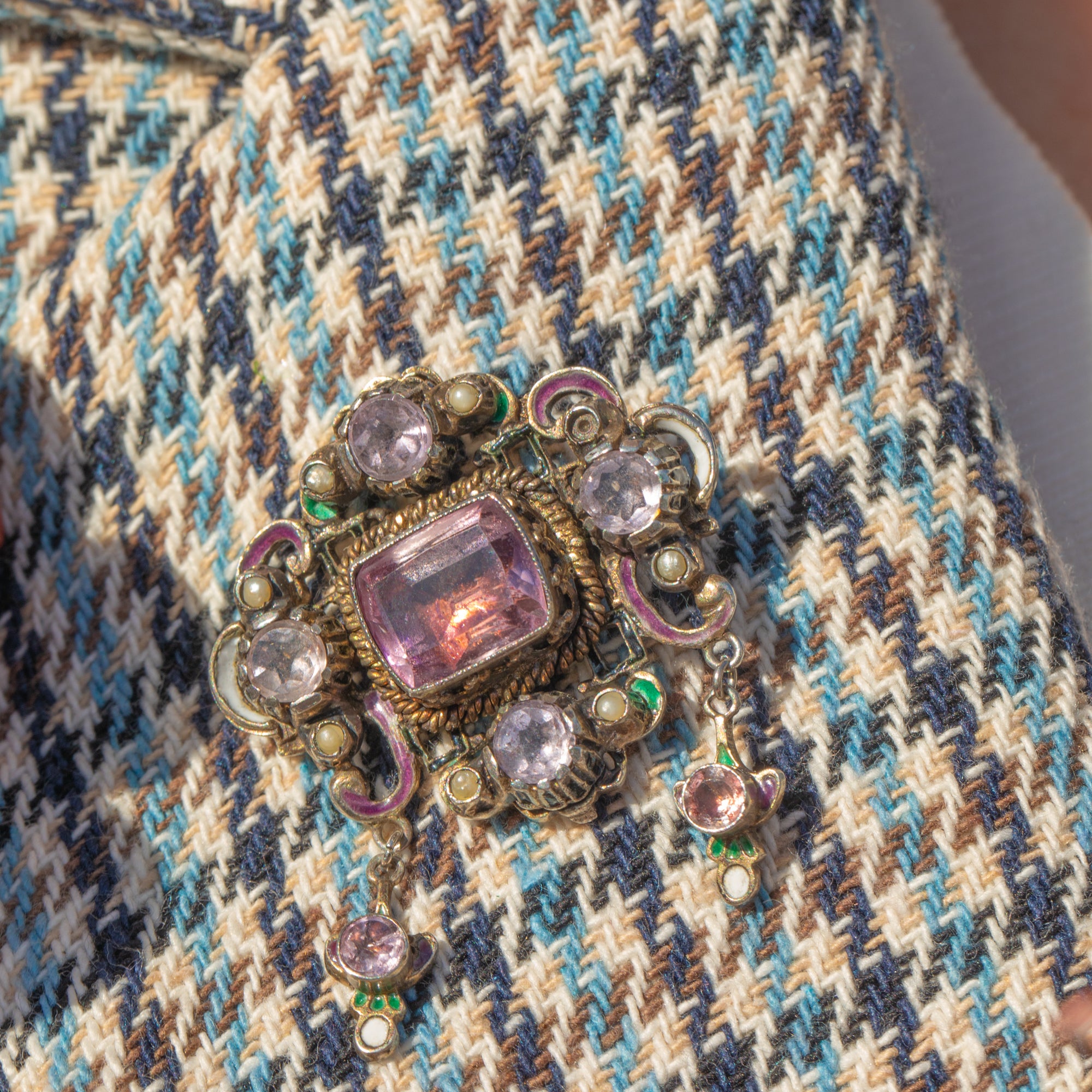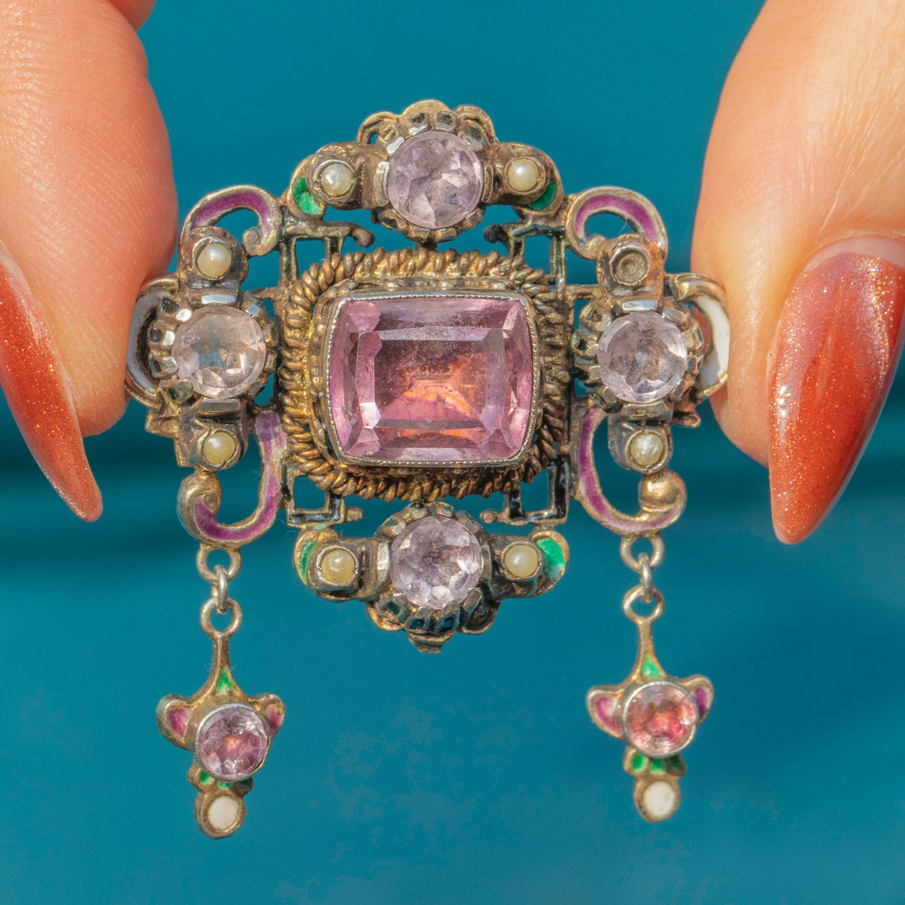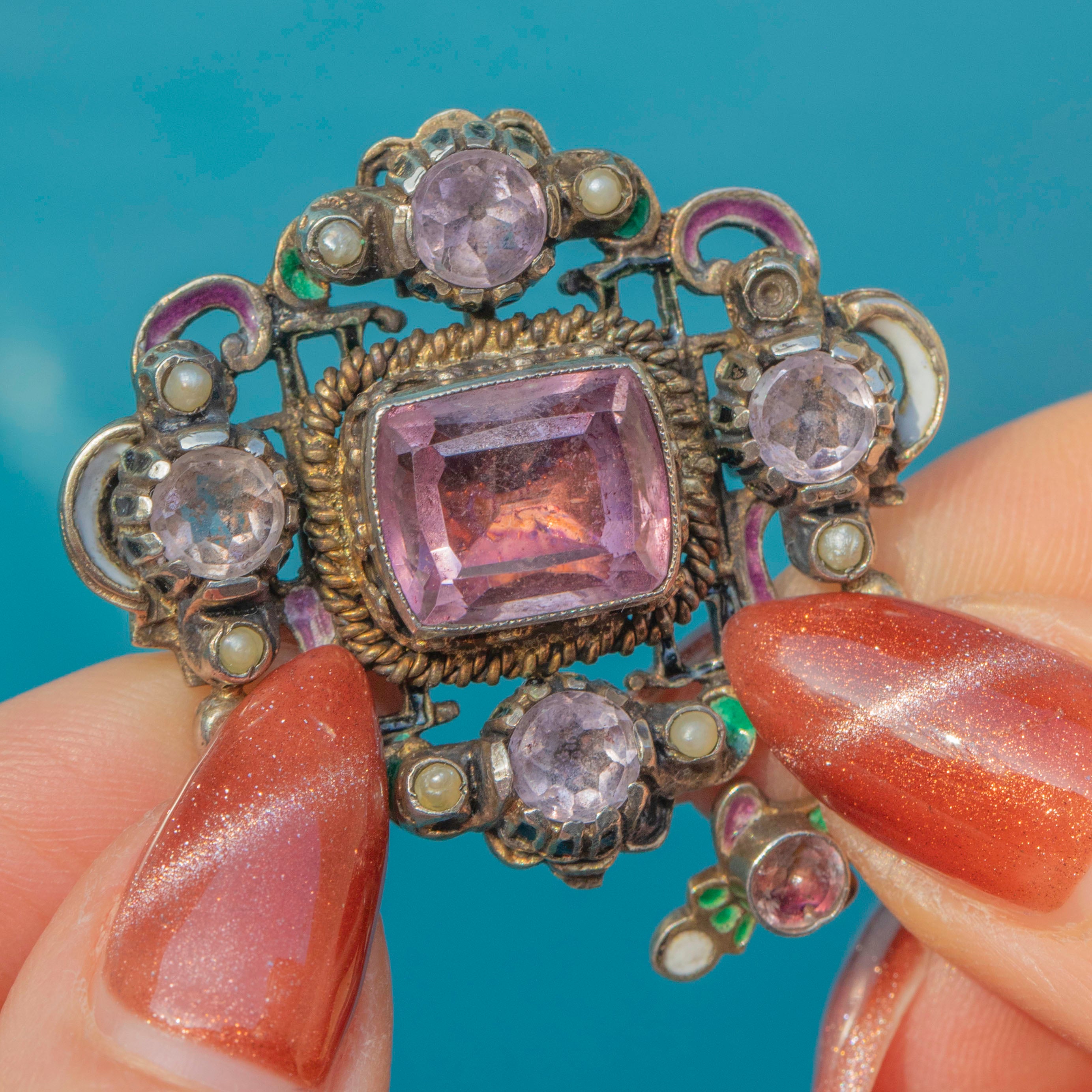 This Austro Hungarian Enamel Amethyst Pearl brooch is a wonderful and beguiling piece of 19th-century jewellery! Inlaid with regal foiled Amethysts, lustrous Pearls and accented with Enamel, this spectacular Gothic pendant will instantly transform you into a divine sorceress!