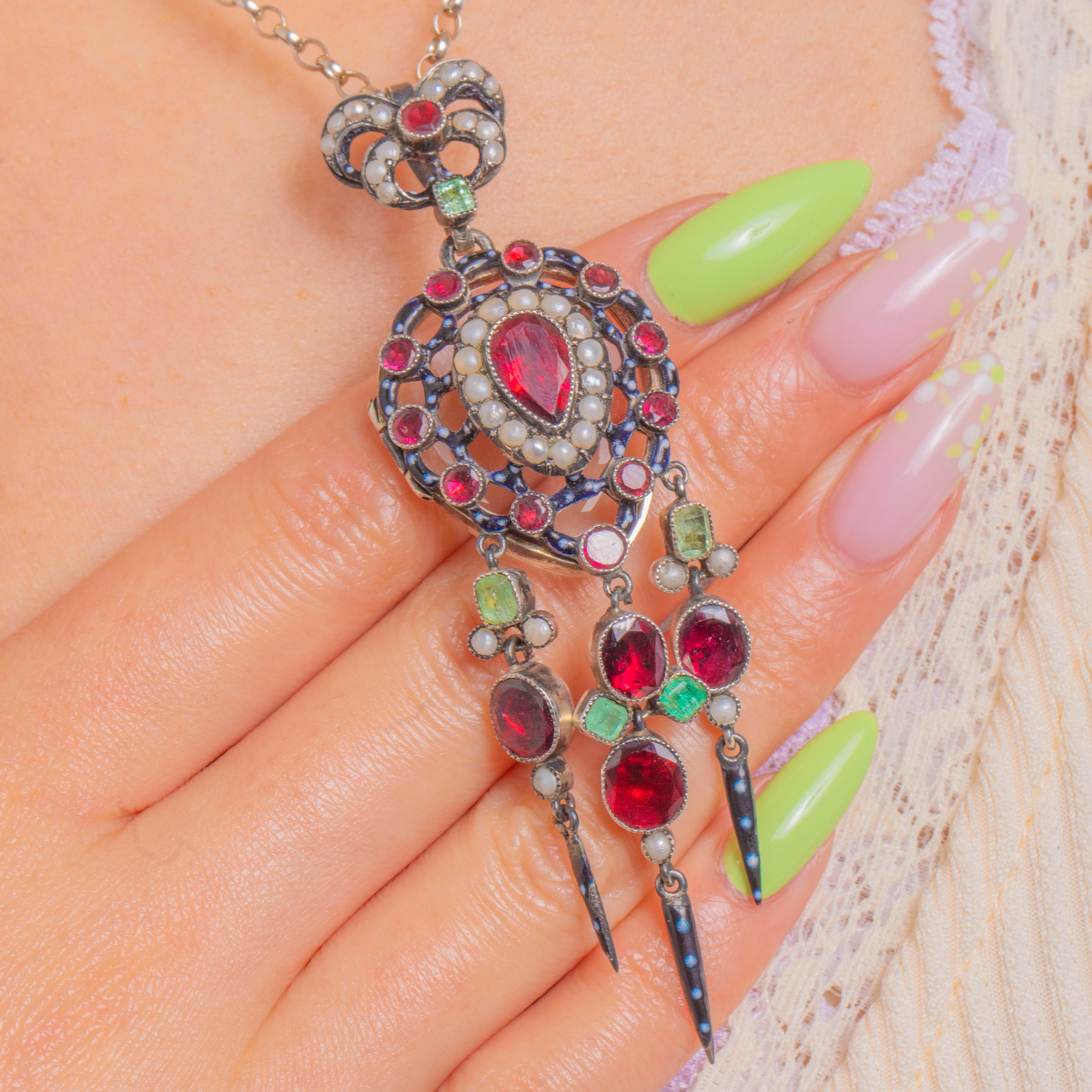 Austro-Hungarian Garnet Emerald Pearl Enamel Silver Pendant
