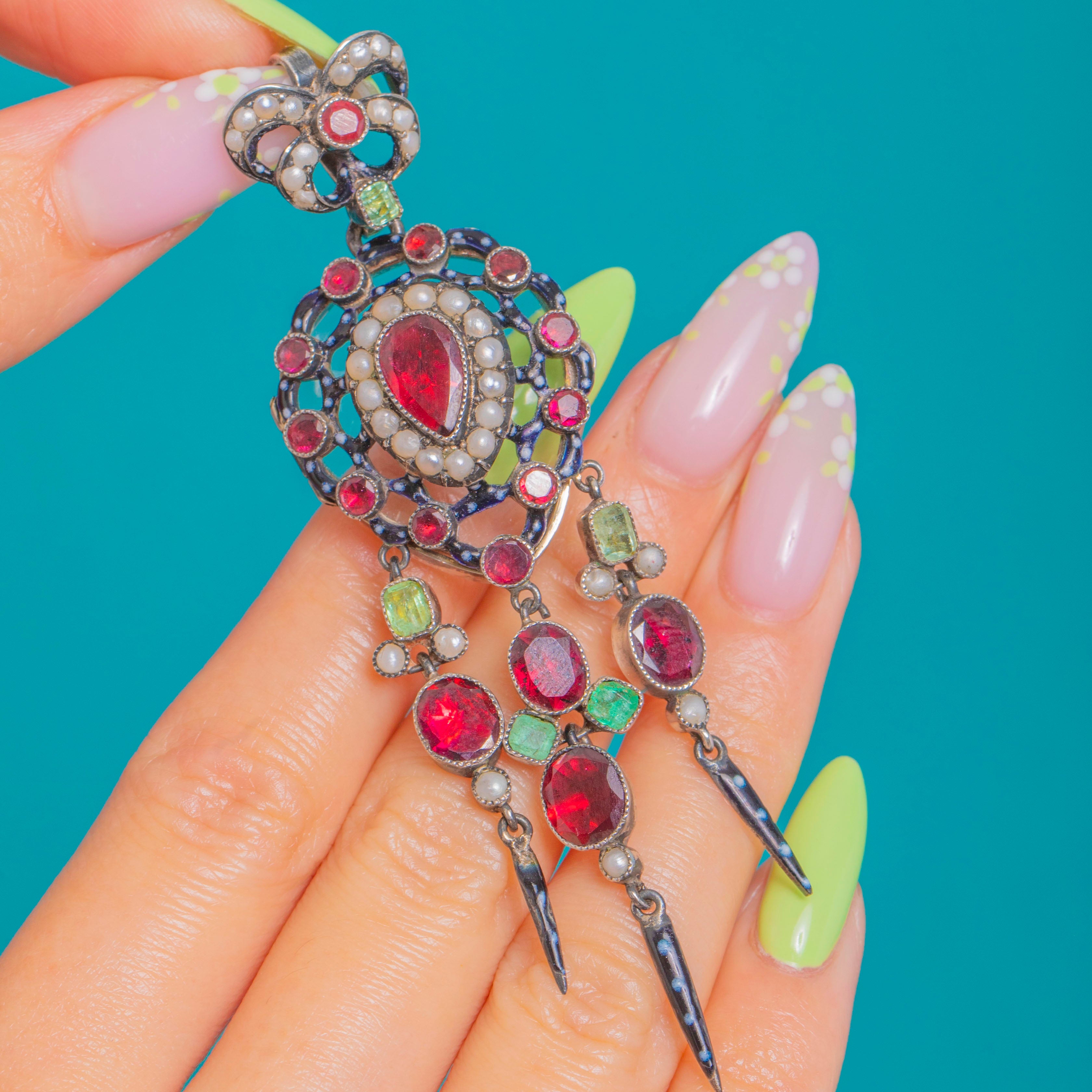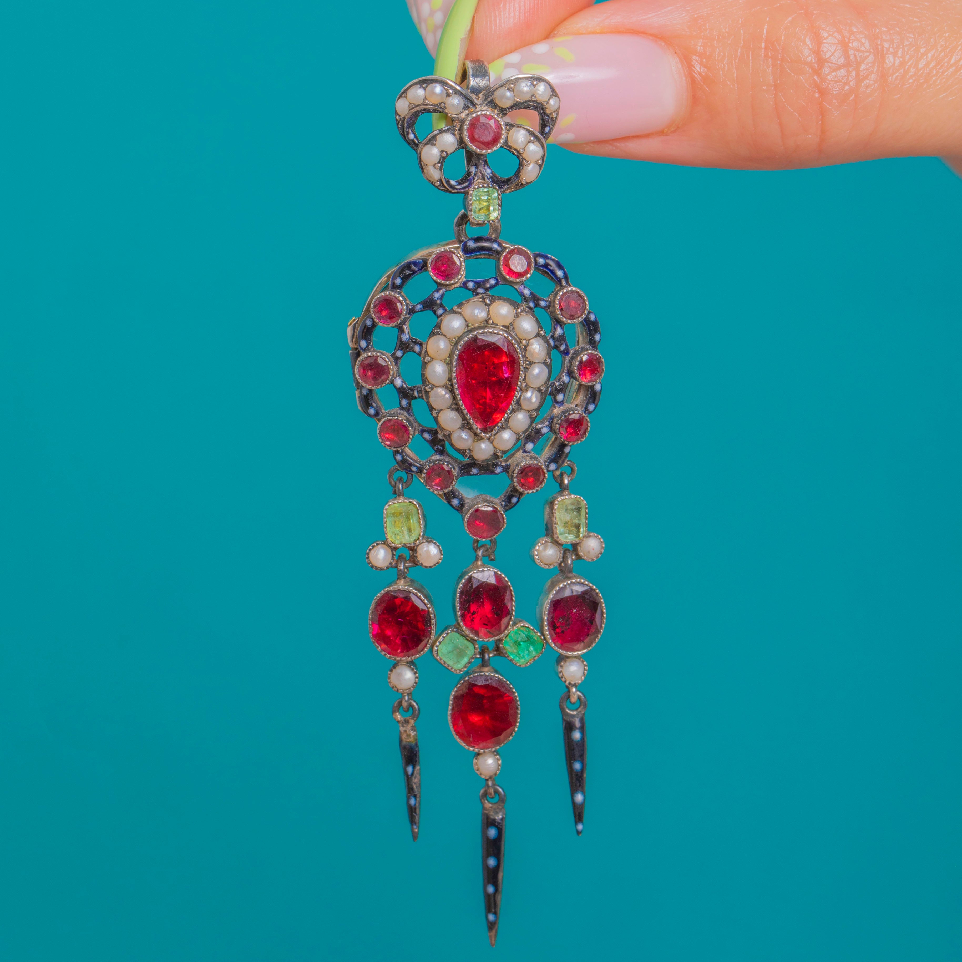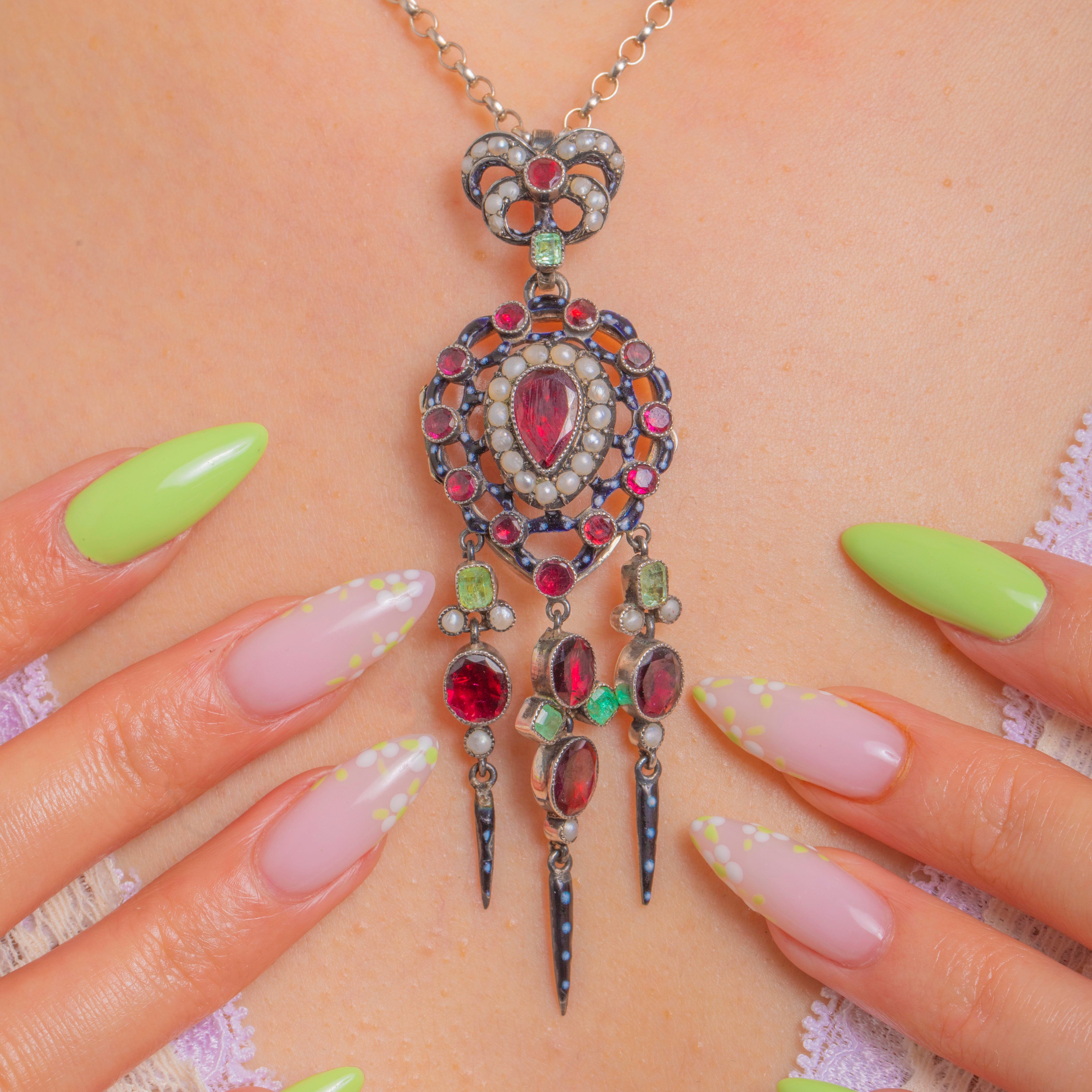 A sumptuous Austro-Hungarian Silver pendant alive with colour, texture and movement. At its heart glows a pear-cut Garnet framed by a halo of creamy Seed Pearls and further deep red Garnets, all arranged beneath a decorative bow. Three articulated girandole drops sway below, each terminating in a tapered enamelled spike for a dramatic, elegant finish.