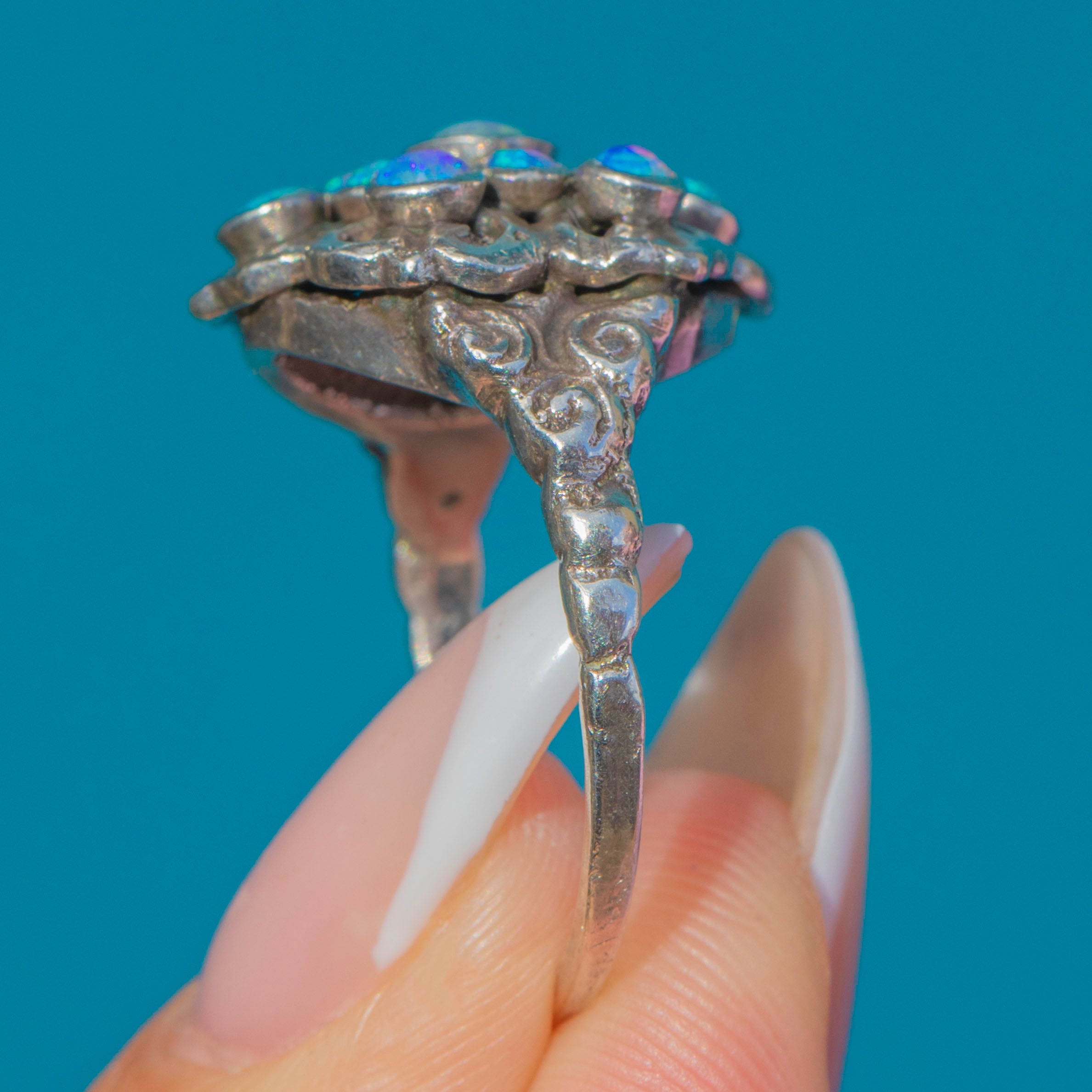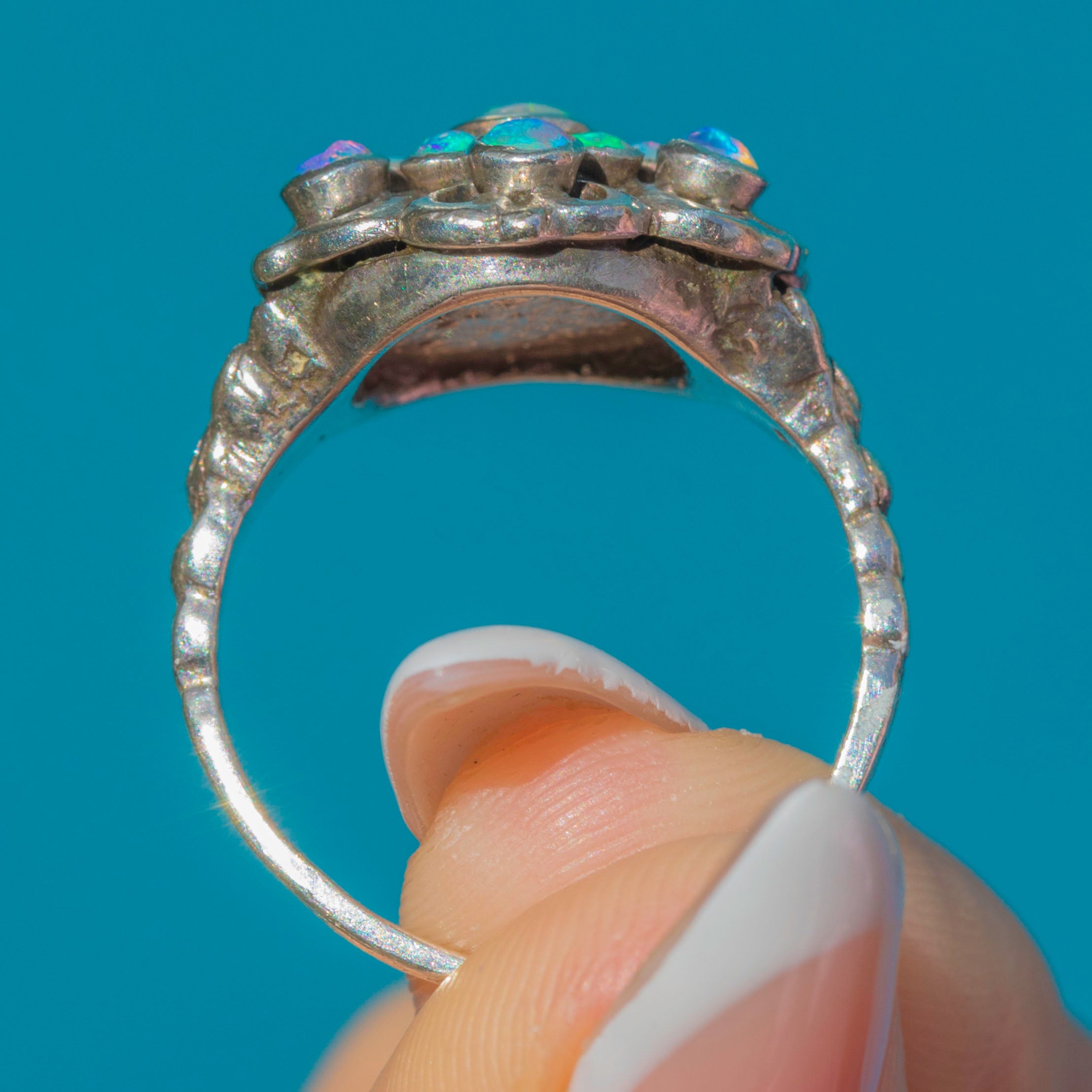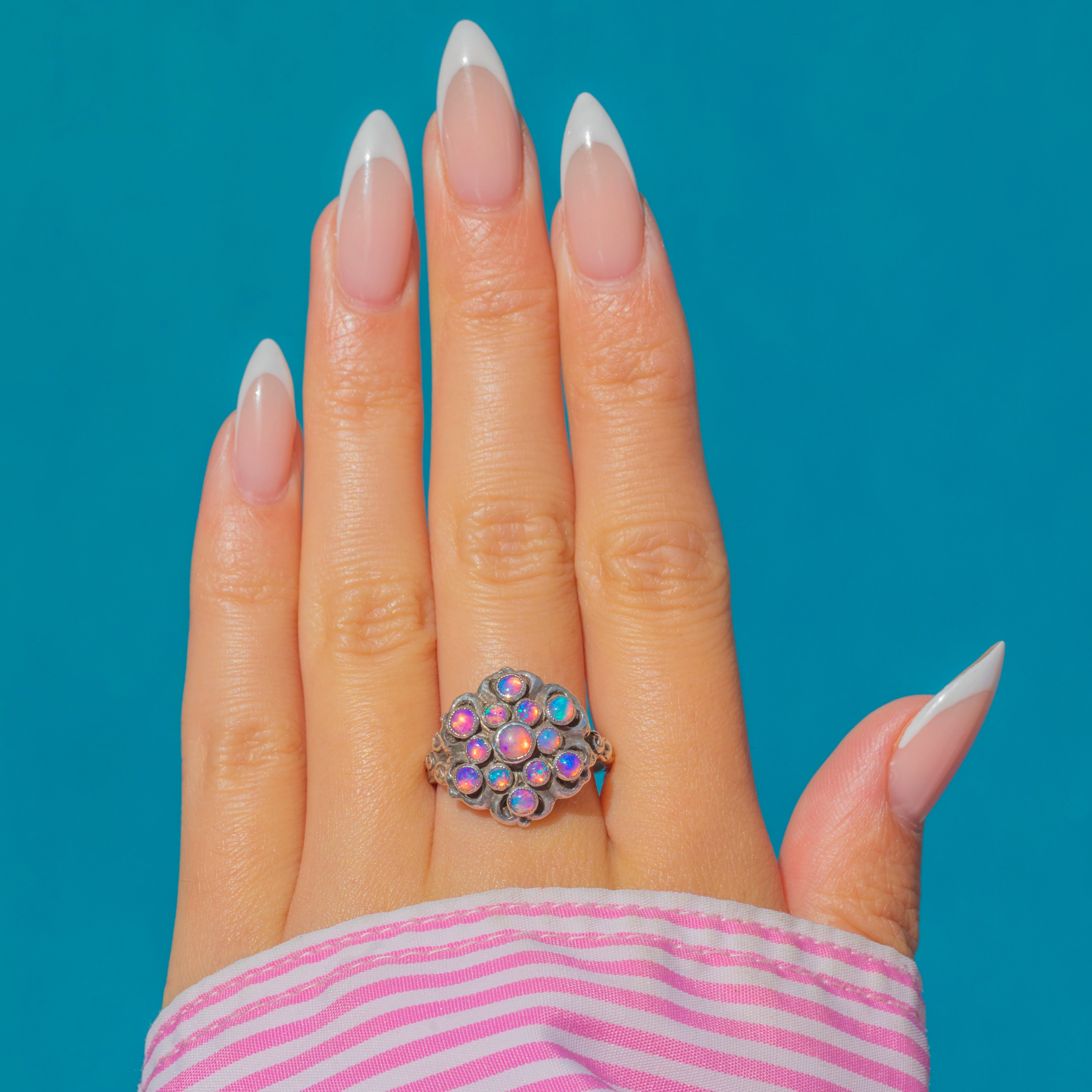 EXCELLENT: The Opaline cabochons are all secure and display strong colour play with no noticeable chips or abrasions. The silver setting and band show only light surface wear in keeping with age, with decorative details remaining well-defined. This ring has been well cared for and remains in excellent antique condition.