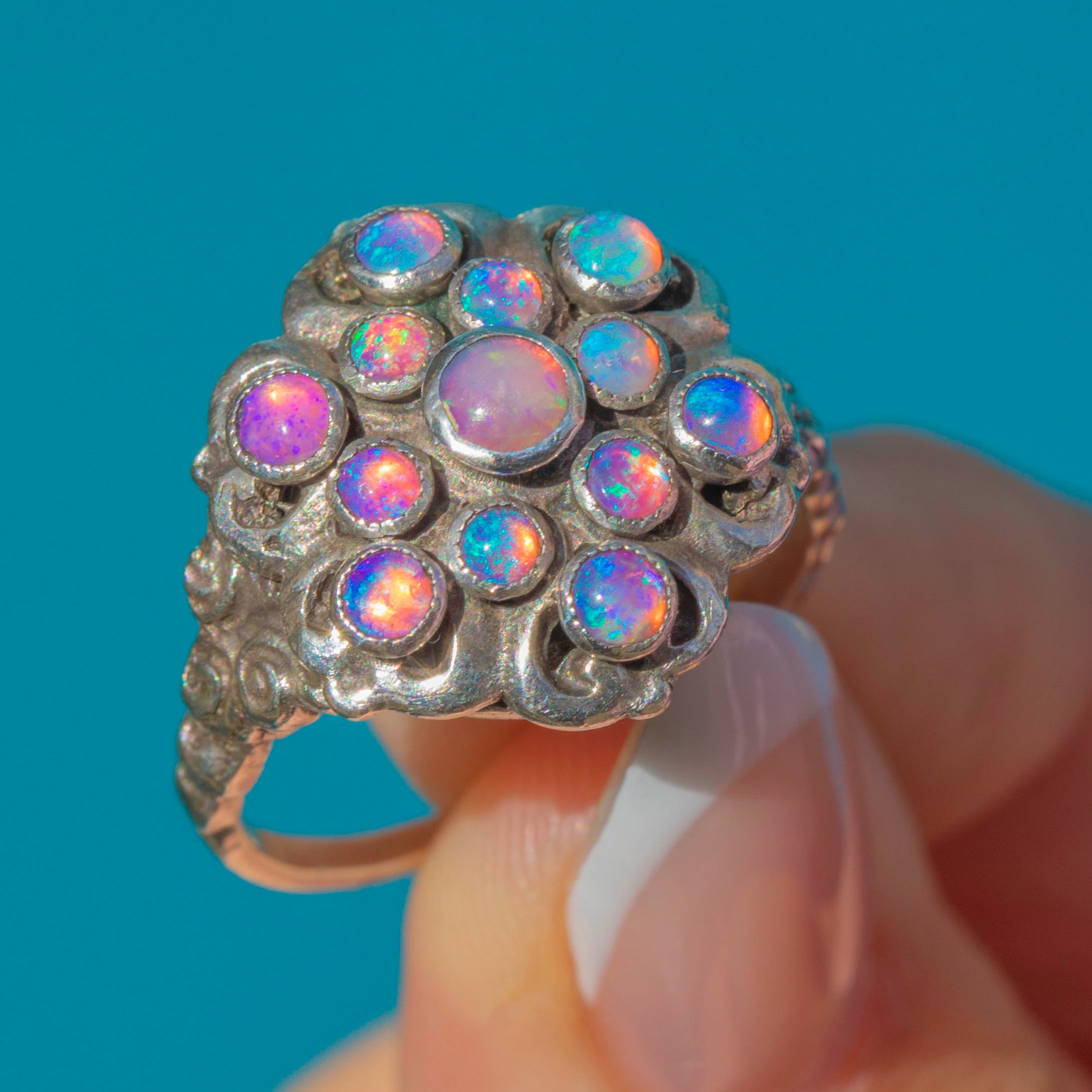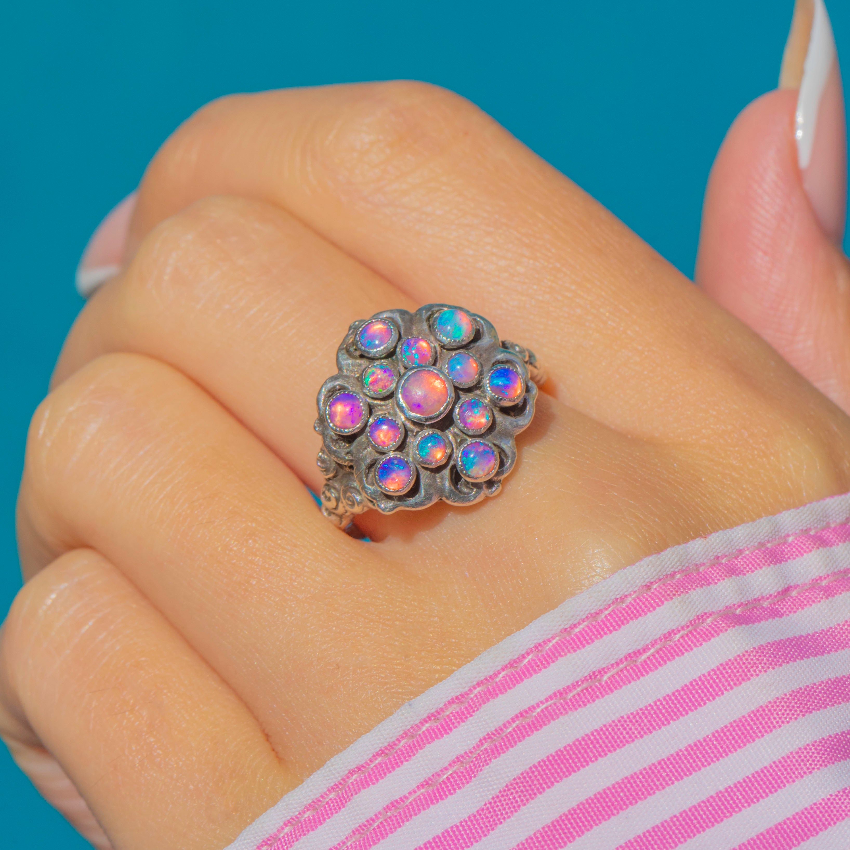 This striking Austro-Hungarian ring showcases a vibrant cluster of Dragonsbreath pink Opaline glass cabochons, each shimmering with fiery flashes of blue and violet. The decorative ring face is richly detailed with ornate scrollwork, framing the gemstones in a distinctive, highly textural design. Bold yet romantic, this piece captures the essence of Austro-Hungarian jewellery, blending intricate metalwork with vivid glasswork to dazzling effect.