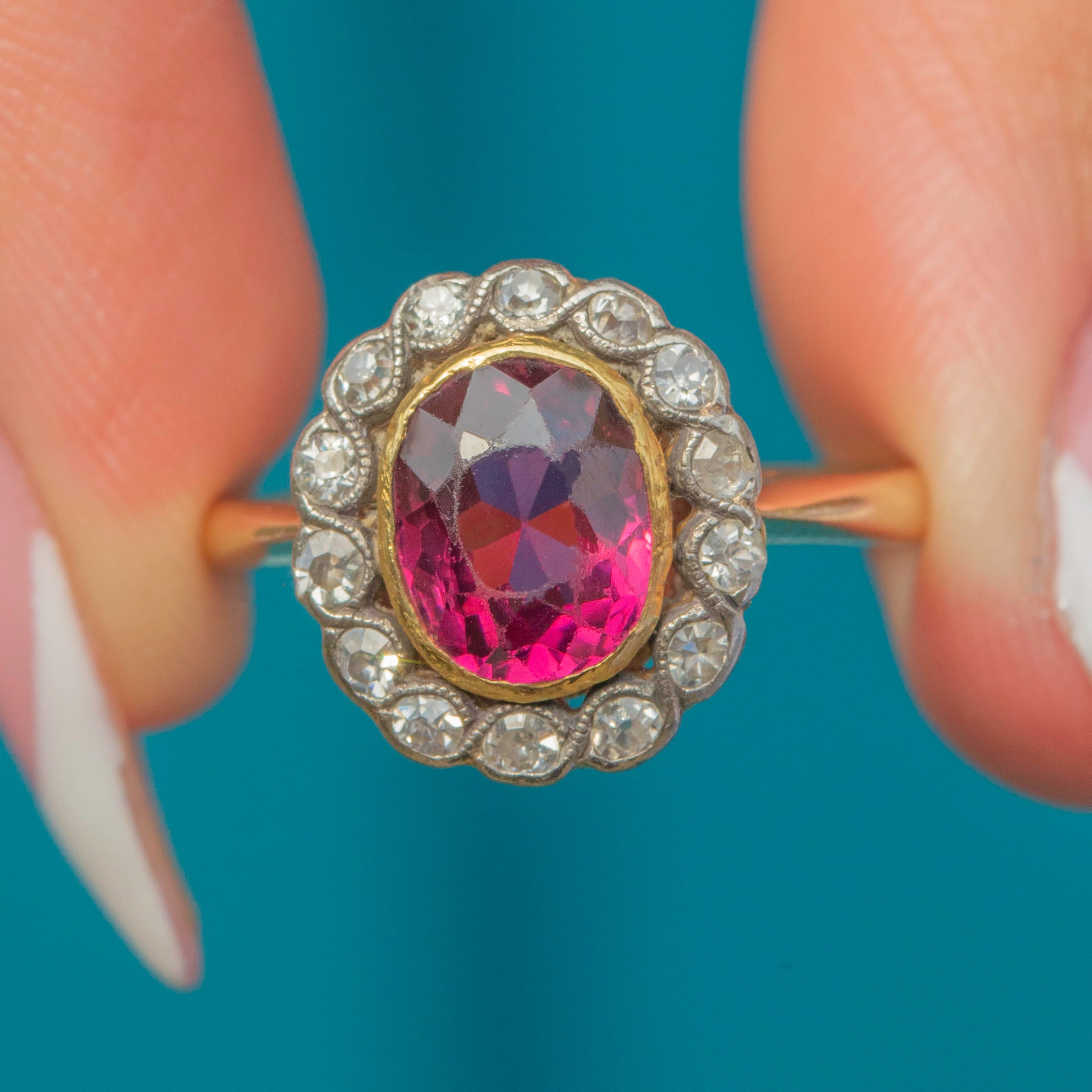 This exquisite Belle Époque cluster ring, crafted circa 1910, showcases a vivid pink Tourmaline framed by a halo of sparkling Diamonds. The oval-cut 1.55ct Tourmaline radiates a rich, saturated hue, beautifully complemented by the crisp brilliance of the surrounding Diamonds.