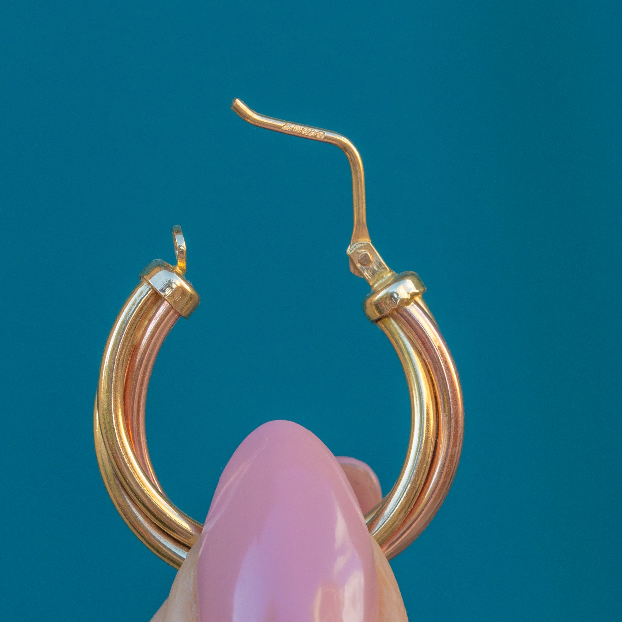 VERY GOOD-EXCELLENT. These bi-colour 9ct rose and yellow Gold hoop earrings are in superb condition. The Gold is saturated and buttery, with only minimal signs of wear, commensurate with age. They clasp securely and are comfortable to wear, with a playful swing, making them the perfect go-to pair of hoops.