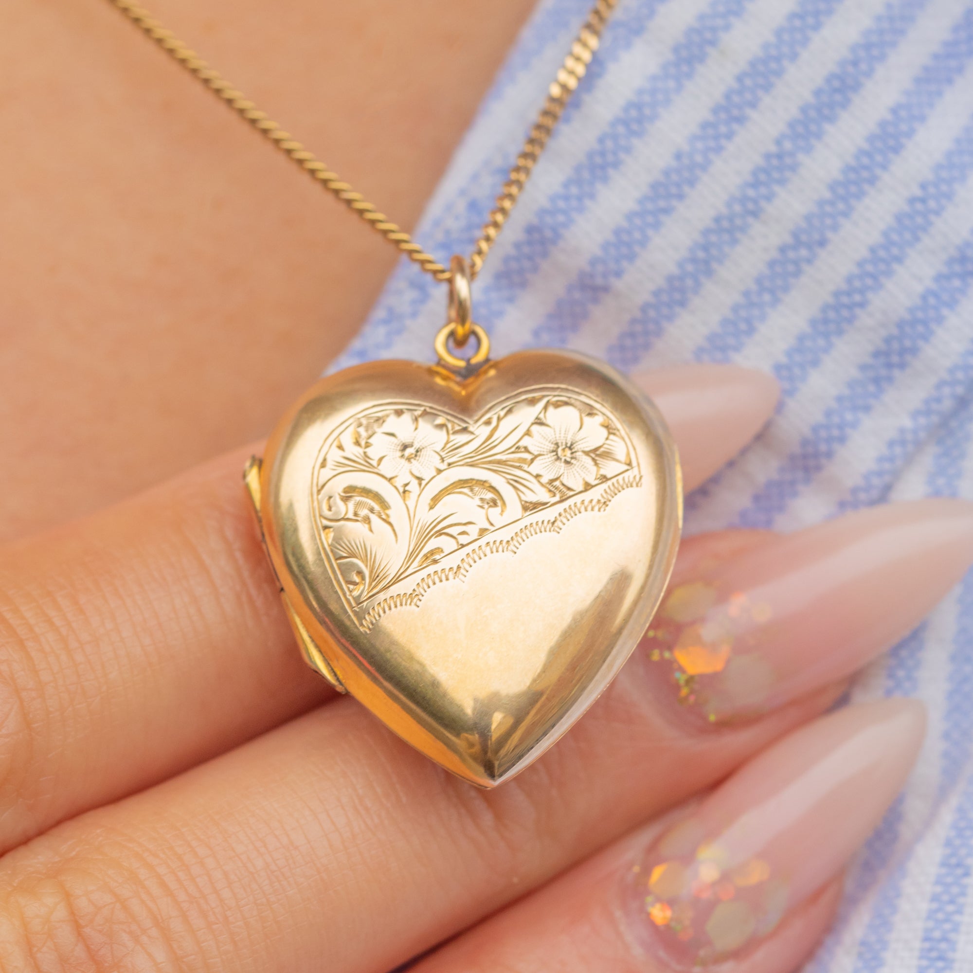This antique Edwardian locket has a bold, puffy profile that gleams in bright yellow 9ct Gold. The diagonal design is particularly eye-catching, with one half plain polished and the other half hand-engraved with elegant scrolls and flowers.
