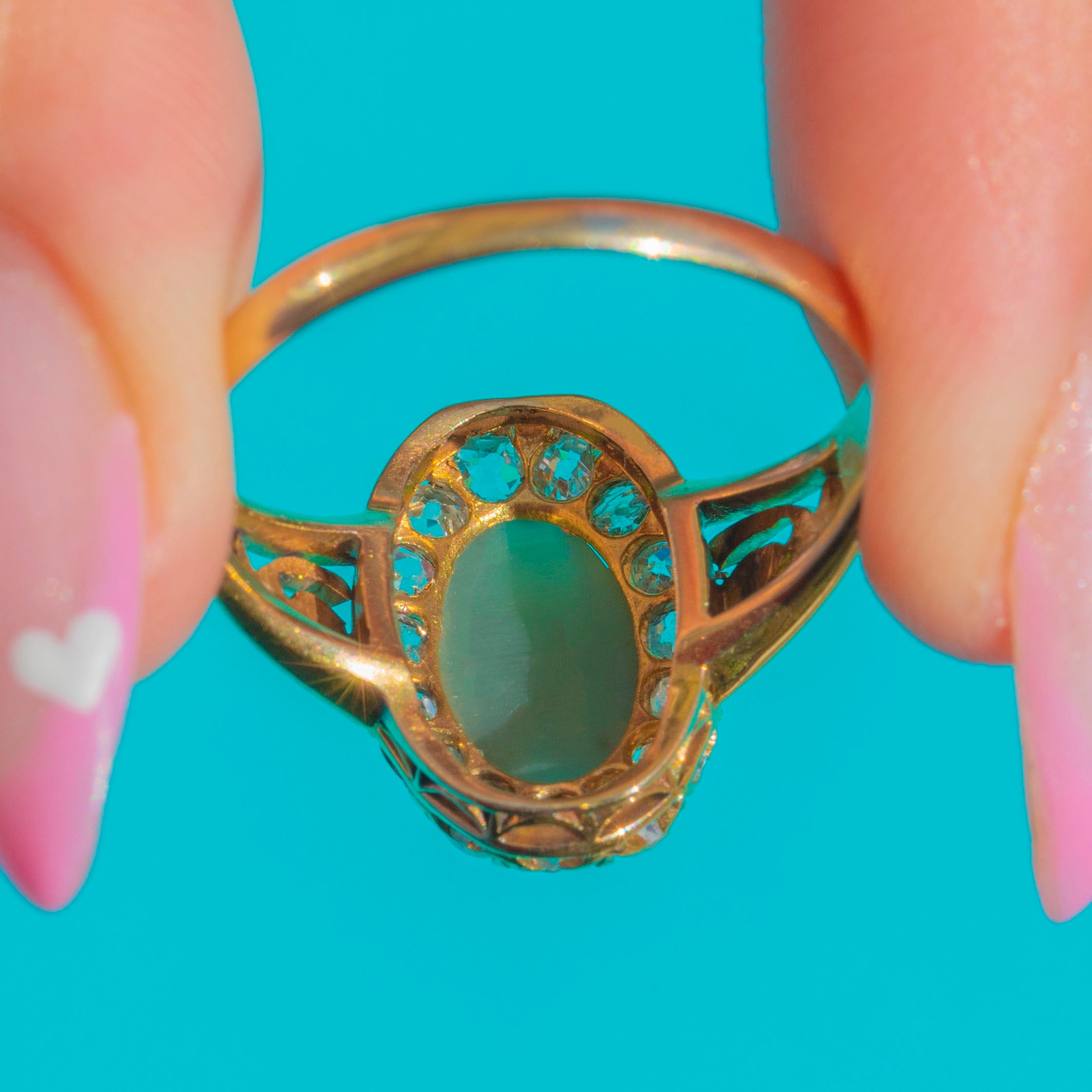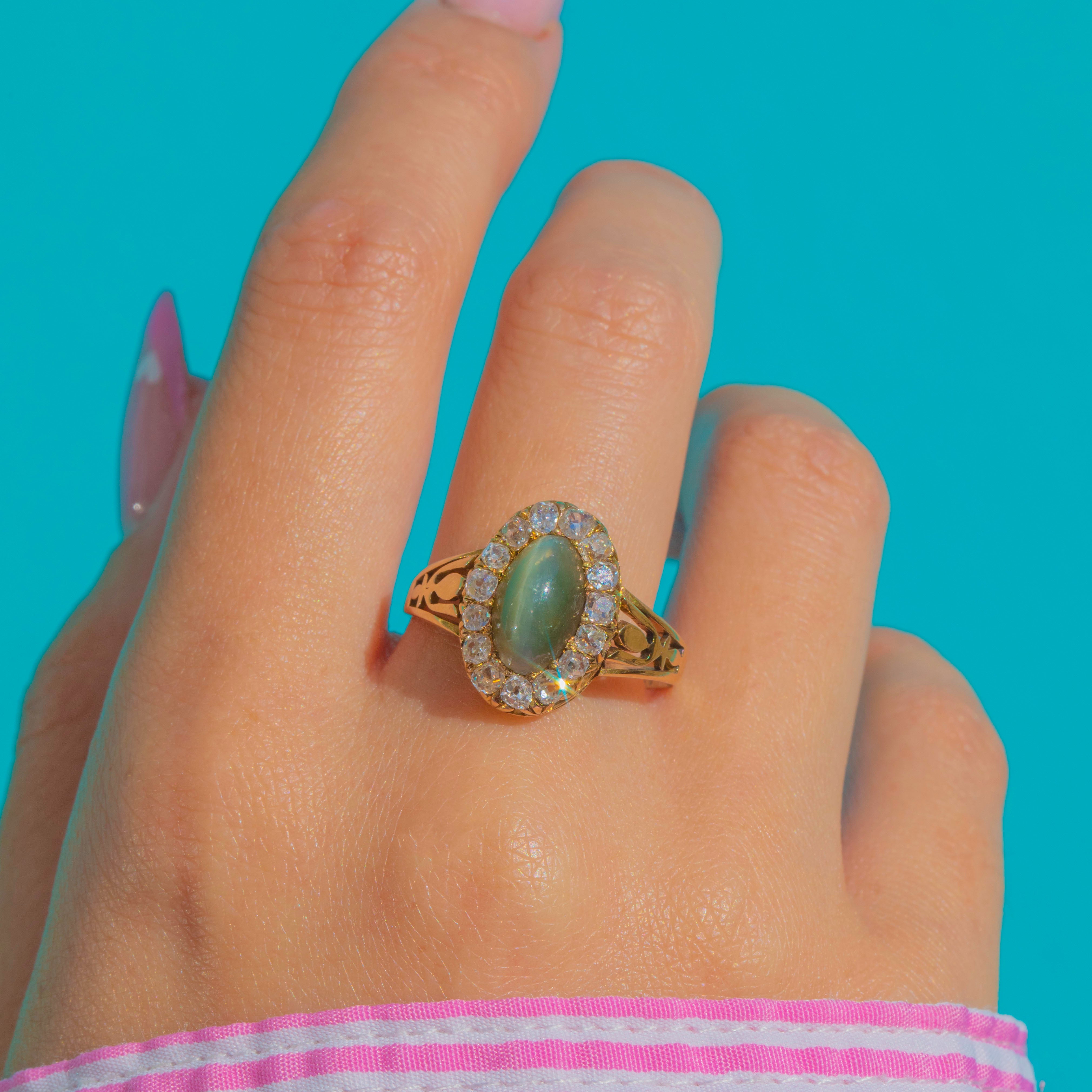 Victorian Cat's Eye Chrysoberyl Diamond Halo Ring in 18ct Gold