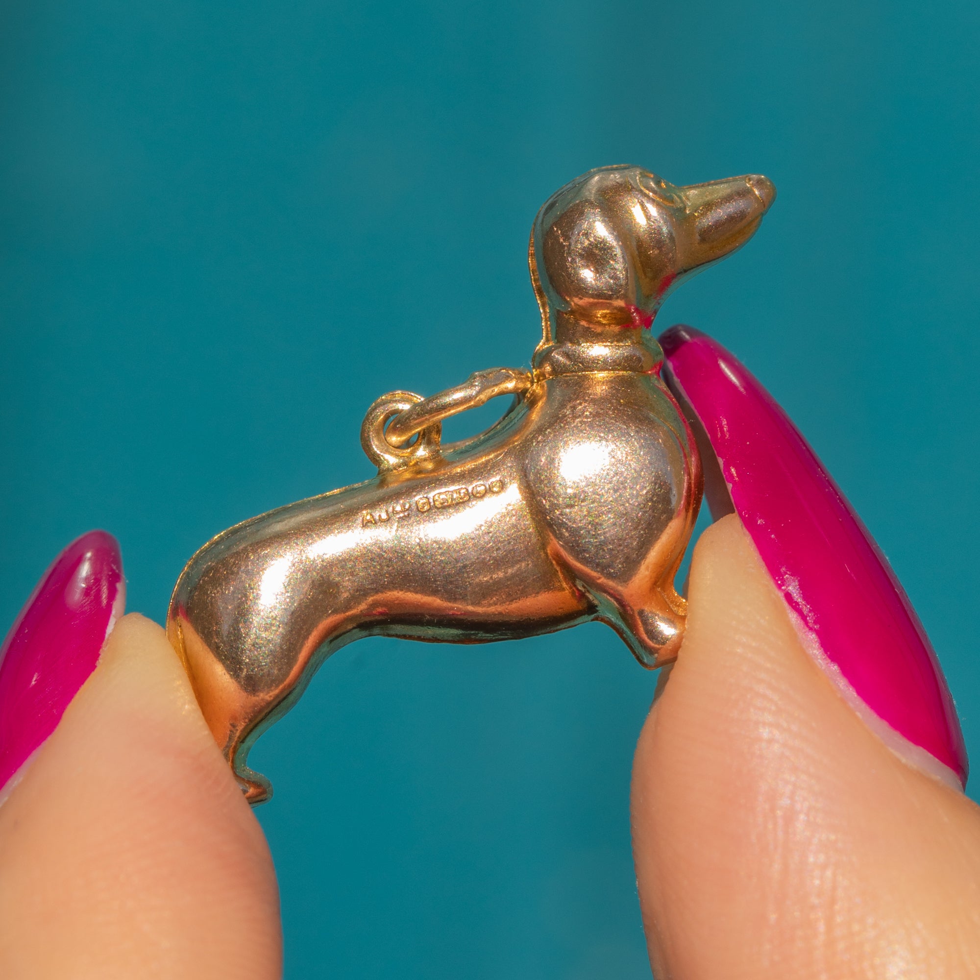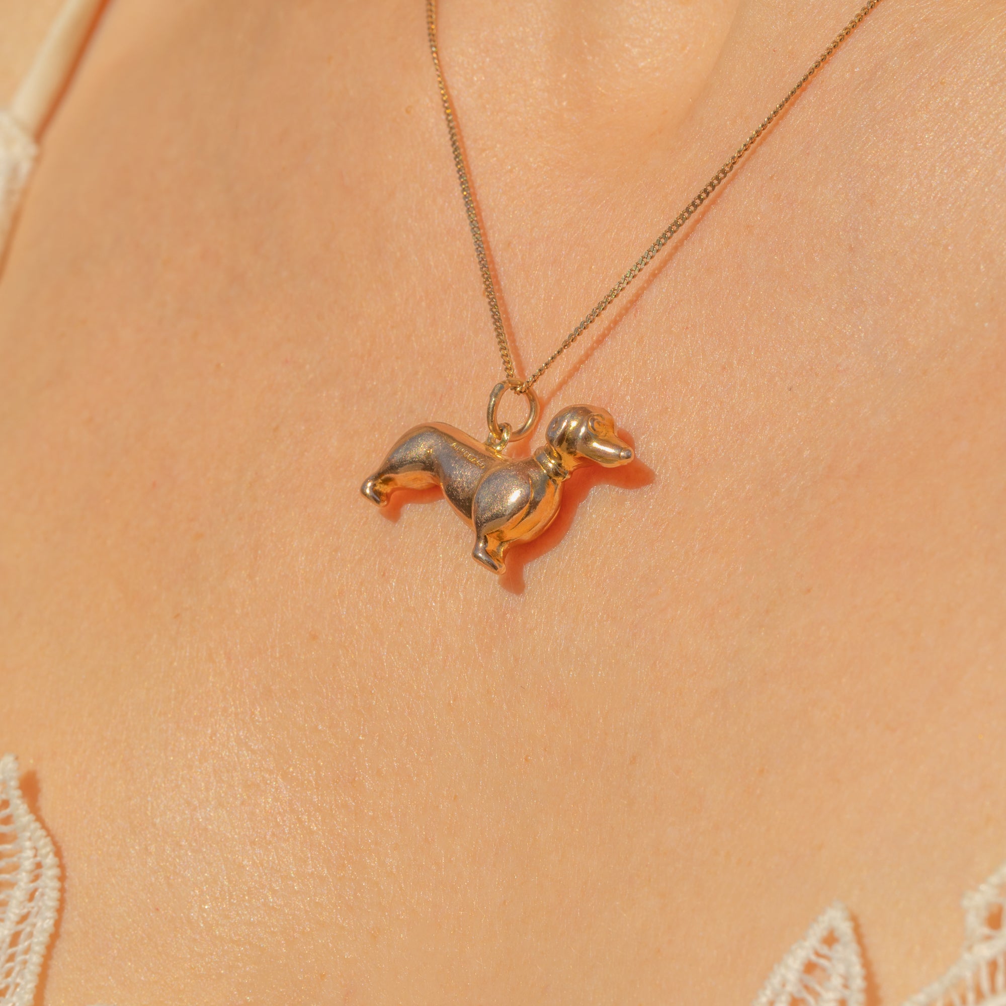Crafted entirely from glossy 9ct Gold, this vintage pendant has been formed into a cute sausage dog, she'll make a lovely companion for your collection!