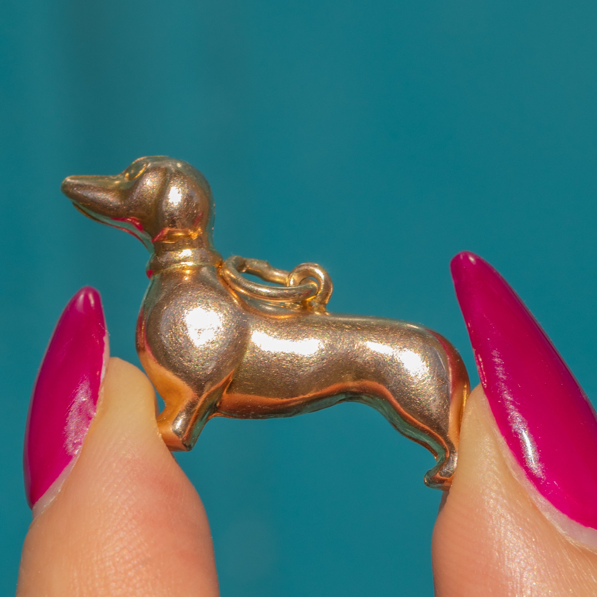 EXCELLENT: The Gold is bright and glossy, free from dings or scuffs. With a securely soldered jump ring, this vintage dachshund pendant can be worn with utmost confidence!