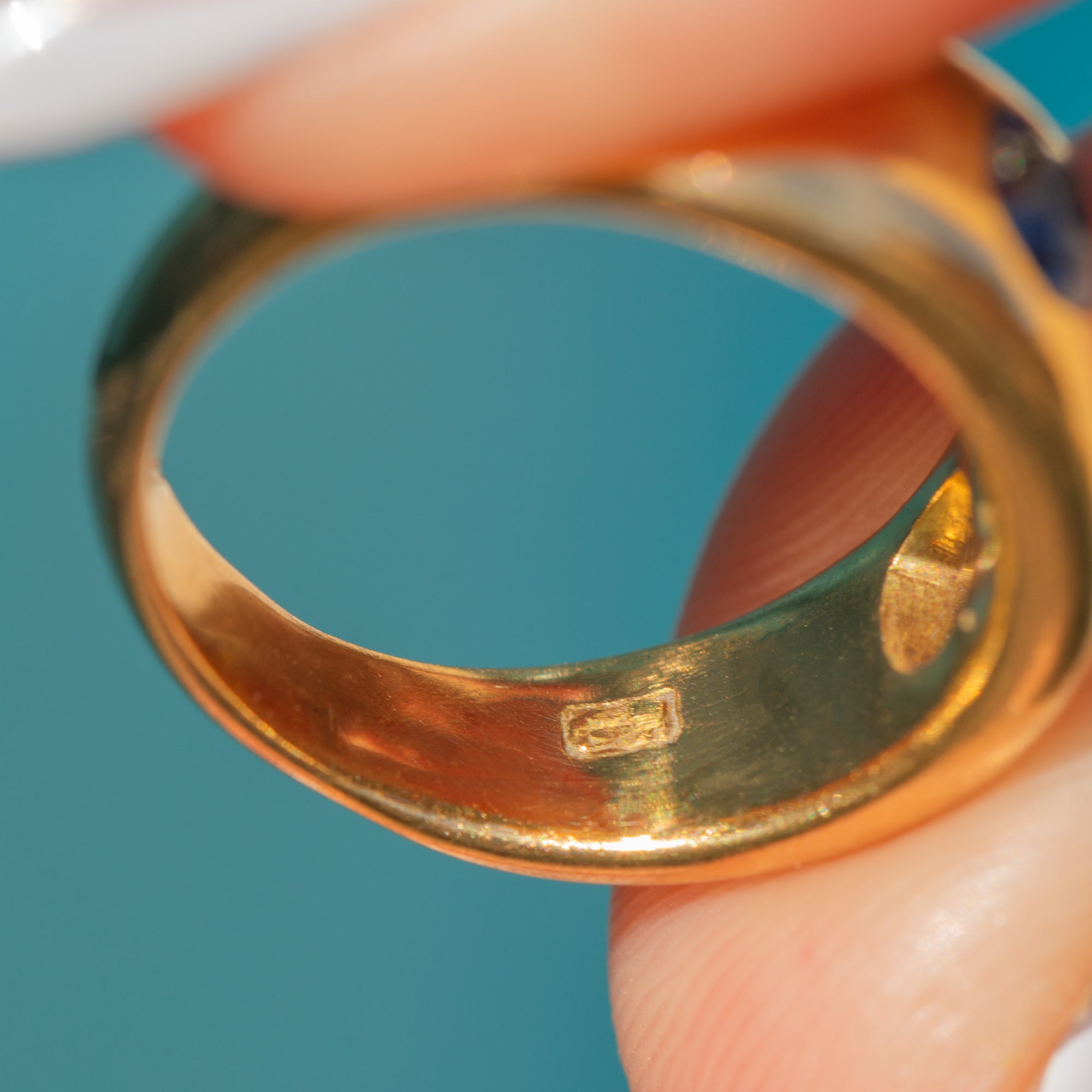 EXCELLENT: This chunky 18ct Gold flush-set Natural Sapphire gypsy ring is in excellent antique condition, retaining her original charm and character. The Natural Sapphires are securely flush-set, with no chips or damage, and the Gold band remains sturdy. There is mild surface wear consistent with age, but no significant scratches, dents, or repairs. She is delightful!