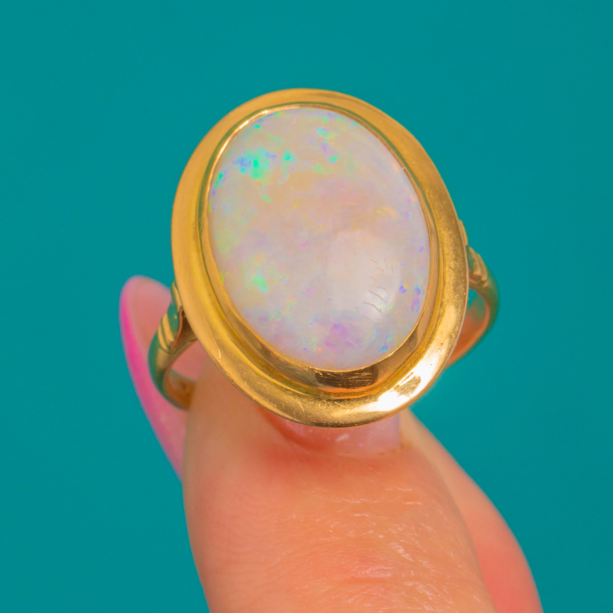 A luminous Mid-Century Opal ring in rich 18ct Gold, designed with that effortless modernist ease we adore. The large natural Opal cabochon glows with pastel play-of-colour, showing vibrant greens and blues with pretty flickers of pink and yellow as the light moves.
