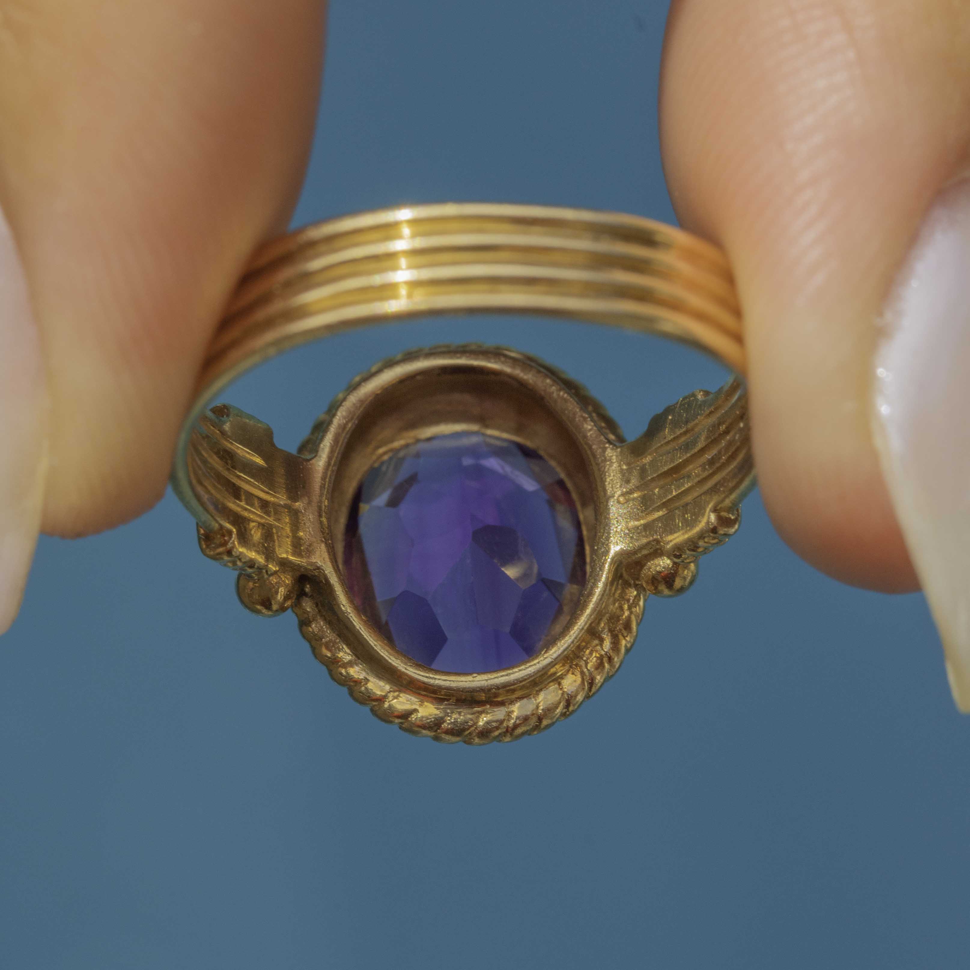 The gemstone is set in a glossy 9ct Gold bezel, haloed by textured rope details and beaded edges, and rests on a chunky band which provides ample finger coverage. Complete with a full set of English hallmarks, this Amethyst ring radiates vintage allure!