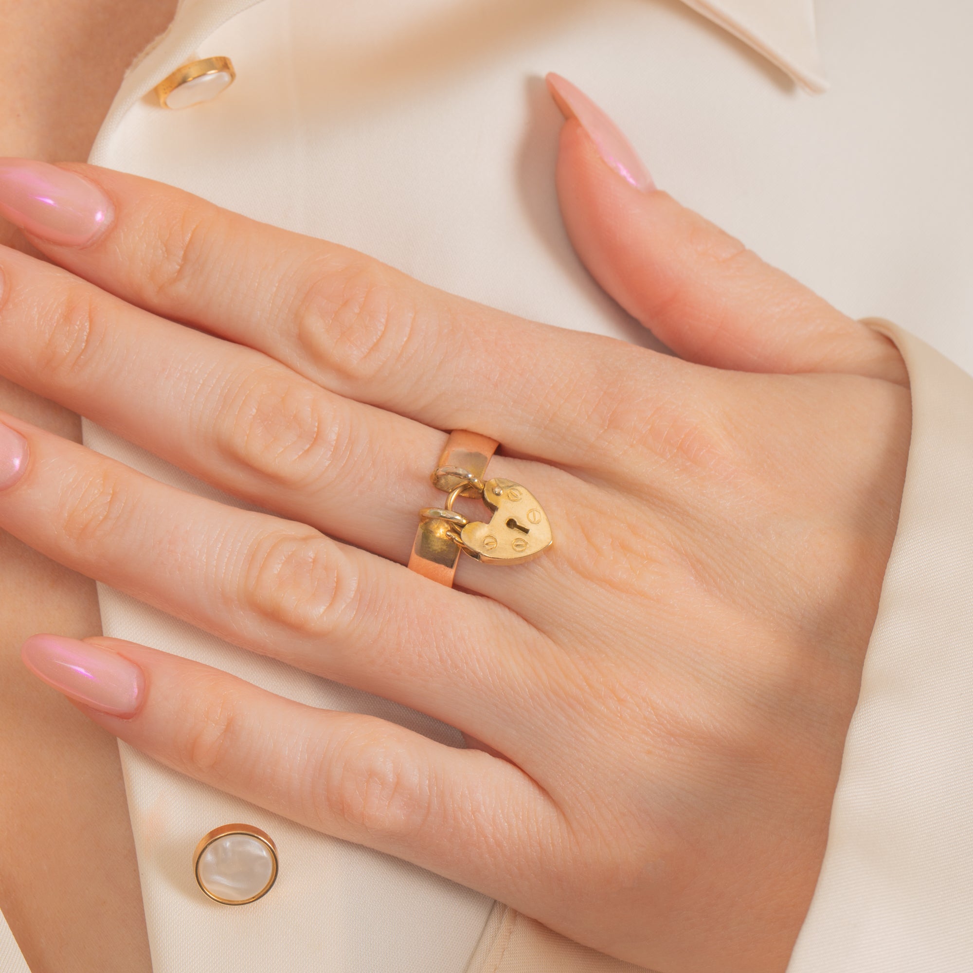 Chunky 9ct Gold Ring with Heart Padlock Charm