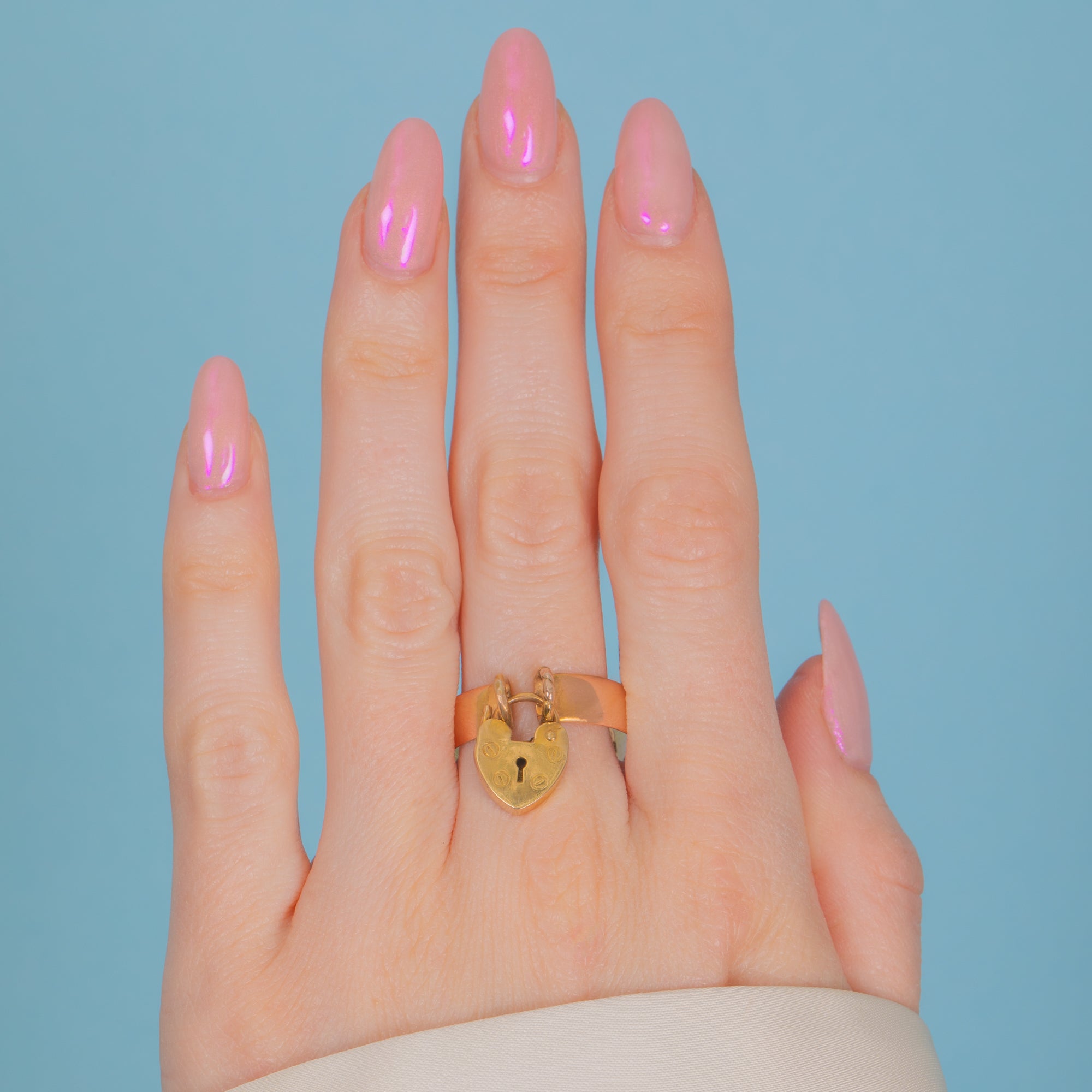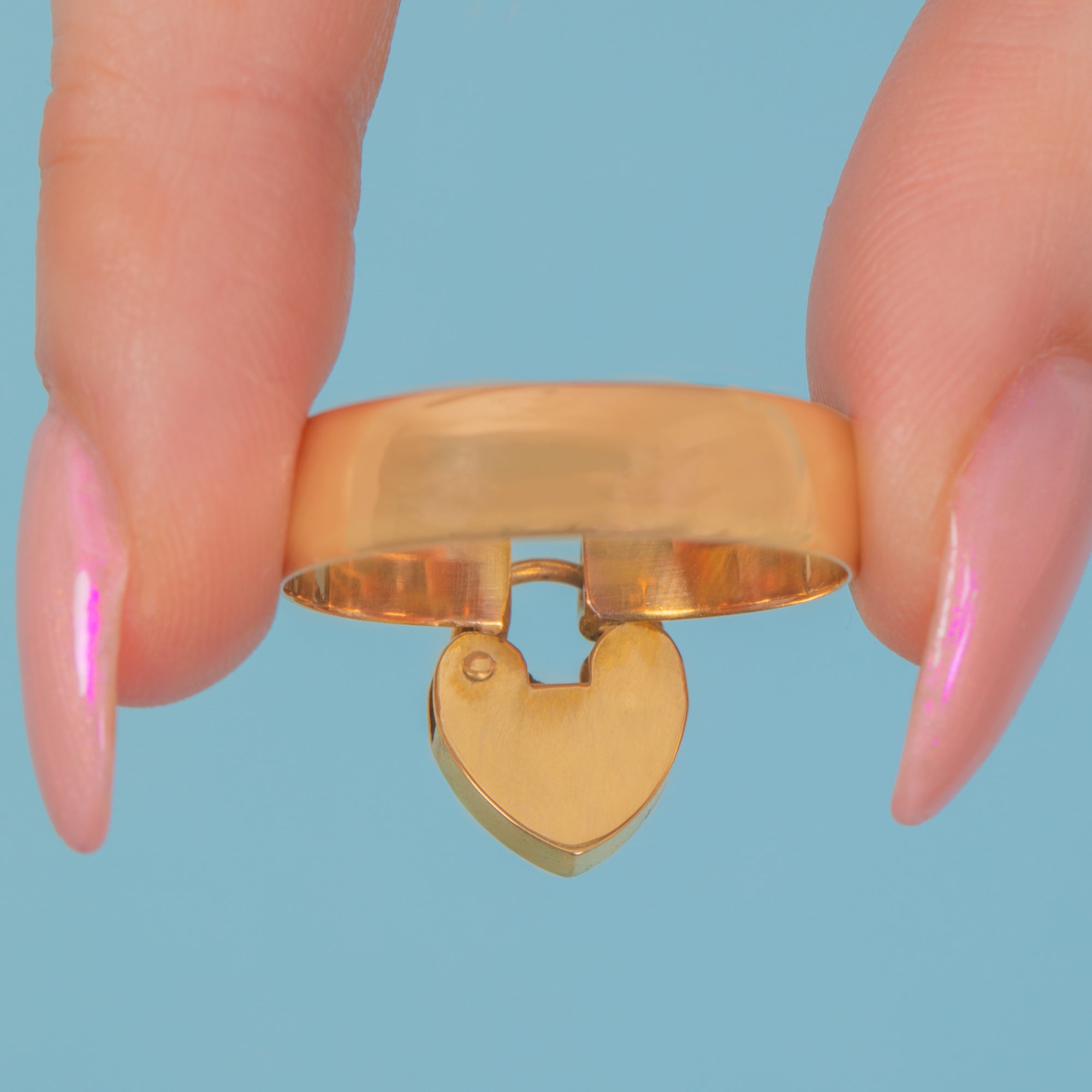 This gorgeous Victorian 9ct Gold ring, complete with a heart padlock charm, is a superb timeless piece, soon to become your newest go-to! Beautifully crafted from saturated 9ct Gold, this ring features a stunning heart-shaped padlock at her centre, symbolising eternal love and commitment.