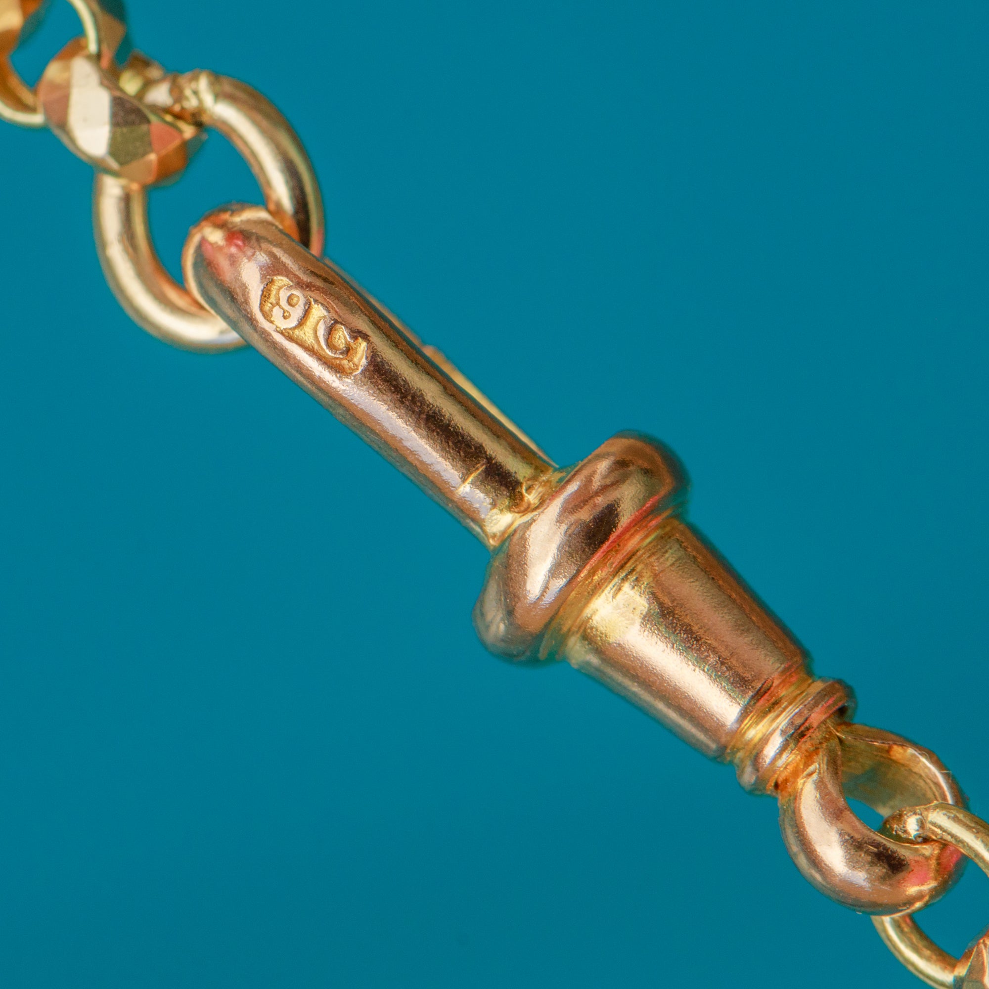 EXCELLENT: This chunky antique 9ct Gold faceted belcher chain is in brilliant condition. Each of her links is uniform and secure, with a lovely glossy sheen. With her dog-clip in perfect working order, this antique 9ct Gold chain is in excellent condition!