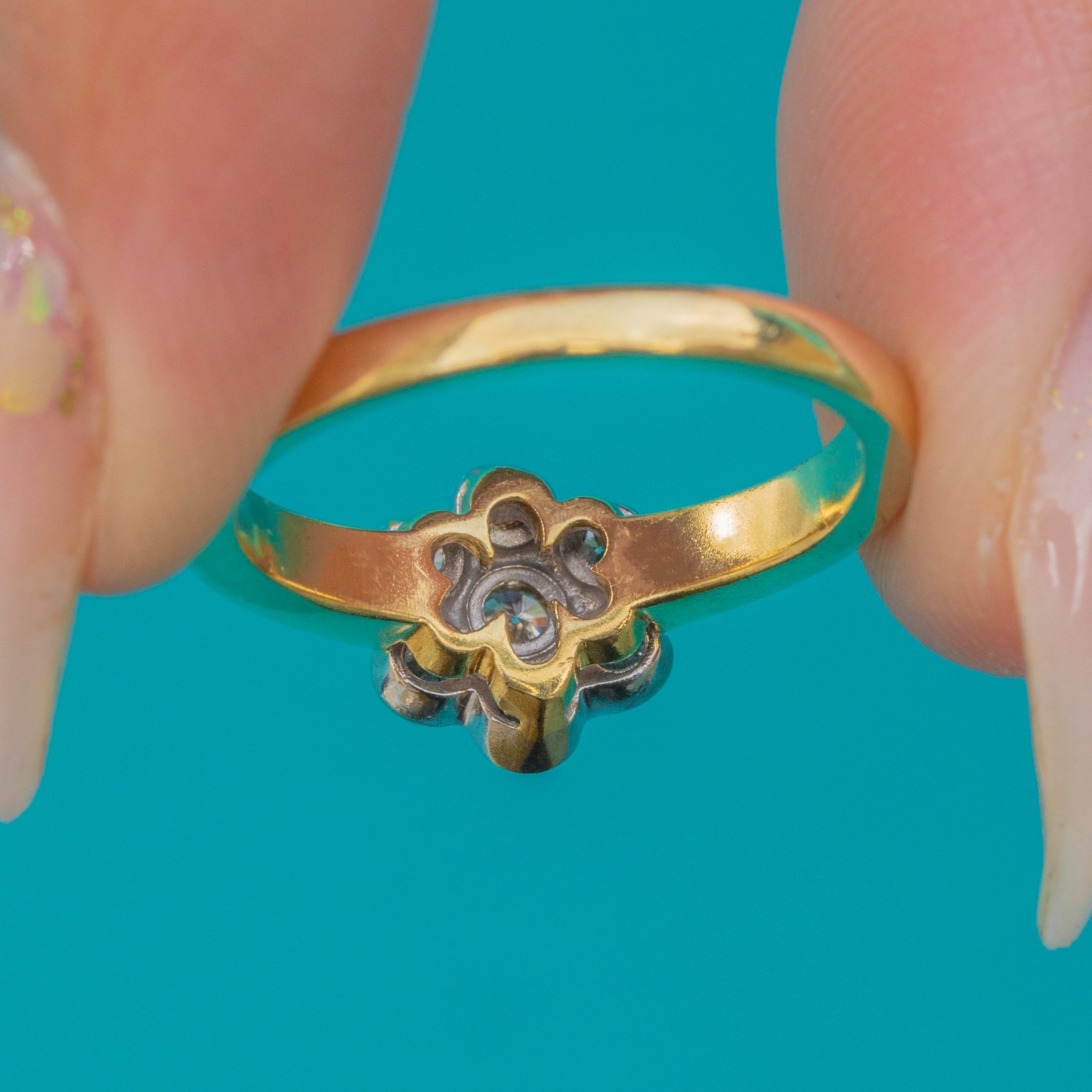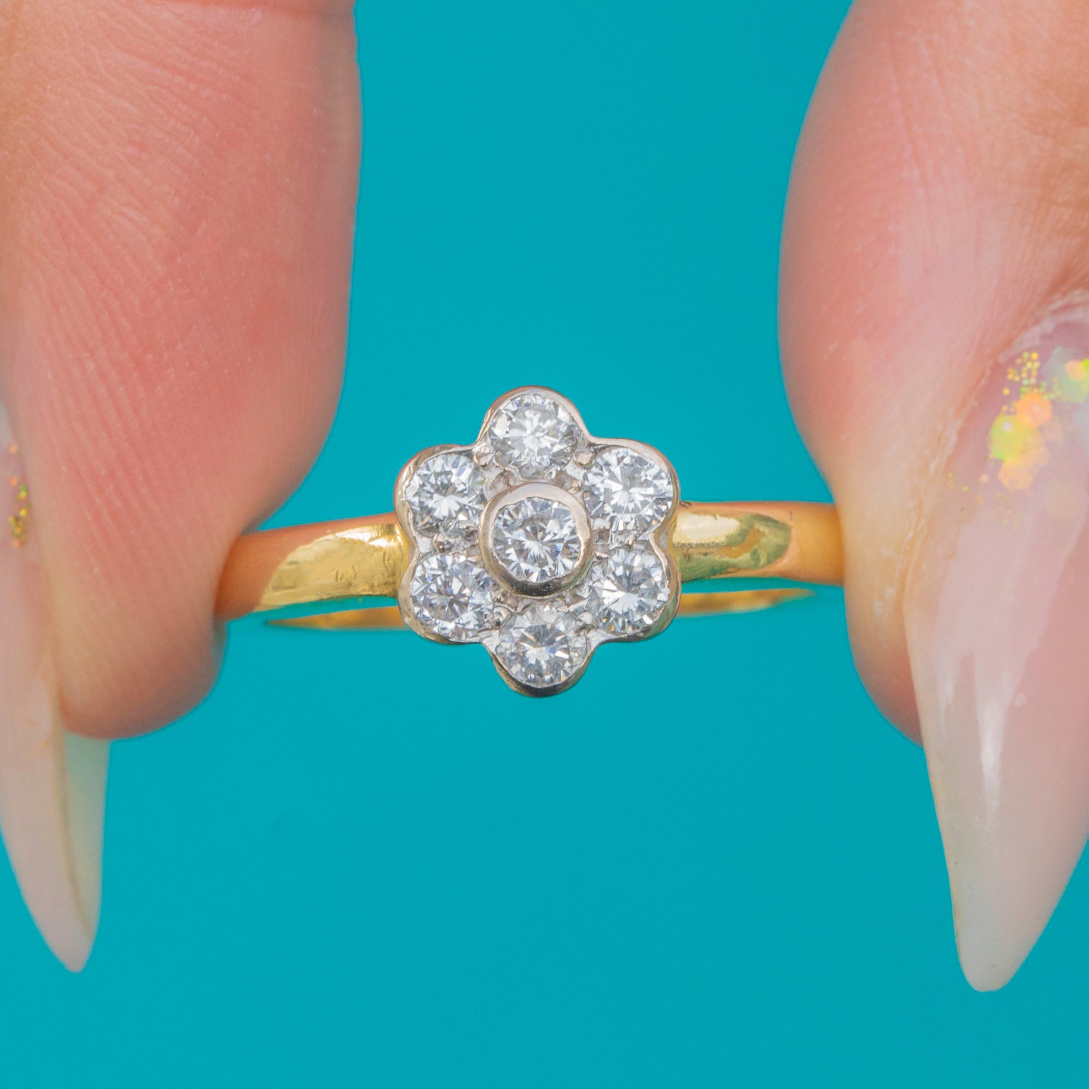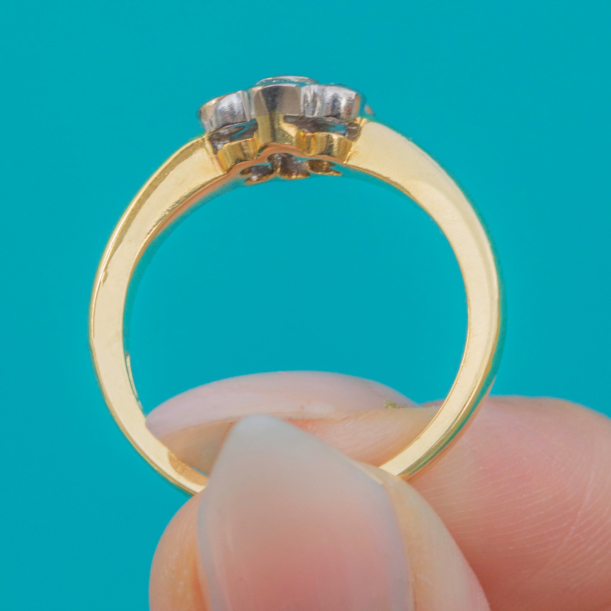 Excellent: The Diamonds are bright and well-matched, all secure in their settings. The cluster head is crisp and in great shape, and the 18ct Gold band shows only light signs of wear, retaining good thickness and durability.