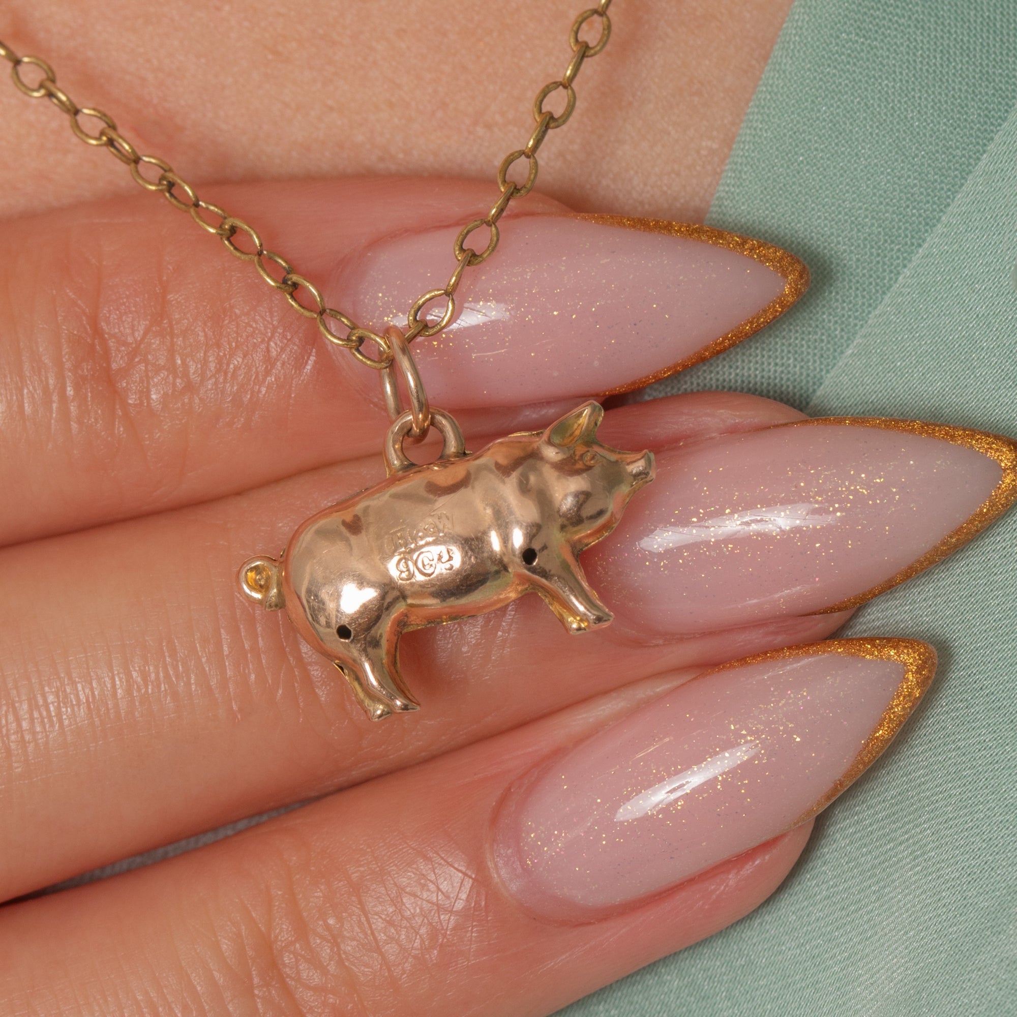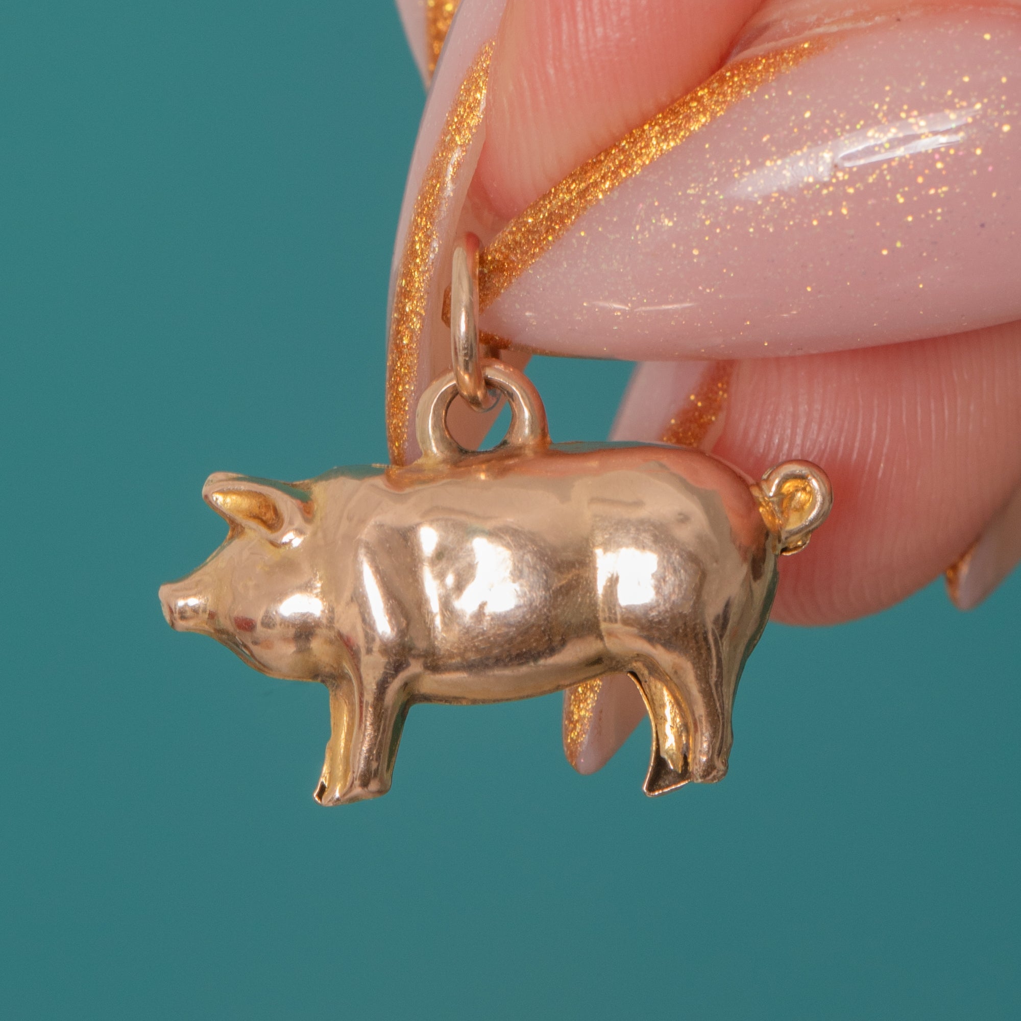 EXCELLENT: Smooth, bright Gold surfaces with a small mark visible on the Gold of the pig, consistent with gentle vintage wear. Detailing remains crisp and the jump ring is secure. A well-preserved, charming piece.