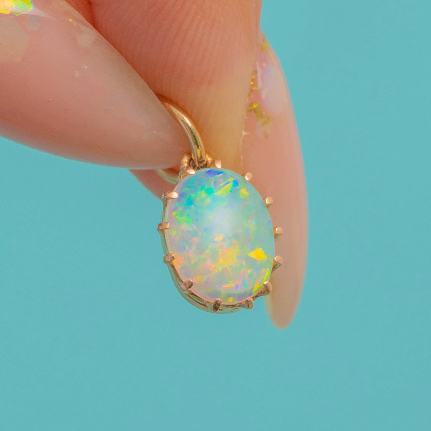 EXCELLENT: The charm is in wonderful condition. The Opal is securely set, smooth, and bright with attractive play-of-colour. The Gold claw setting and jump ring are sturdy, making this a wearable and well-preserved Victorian piece.