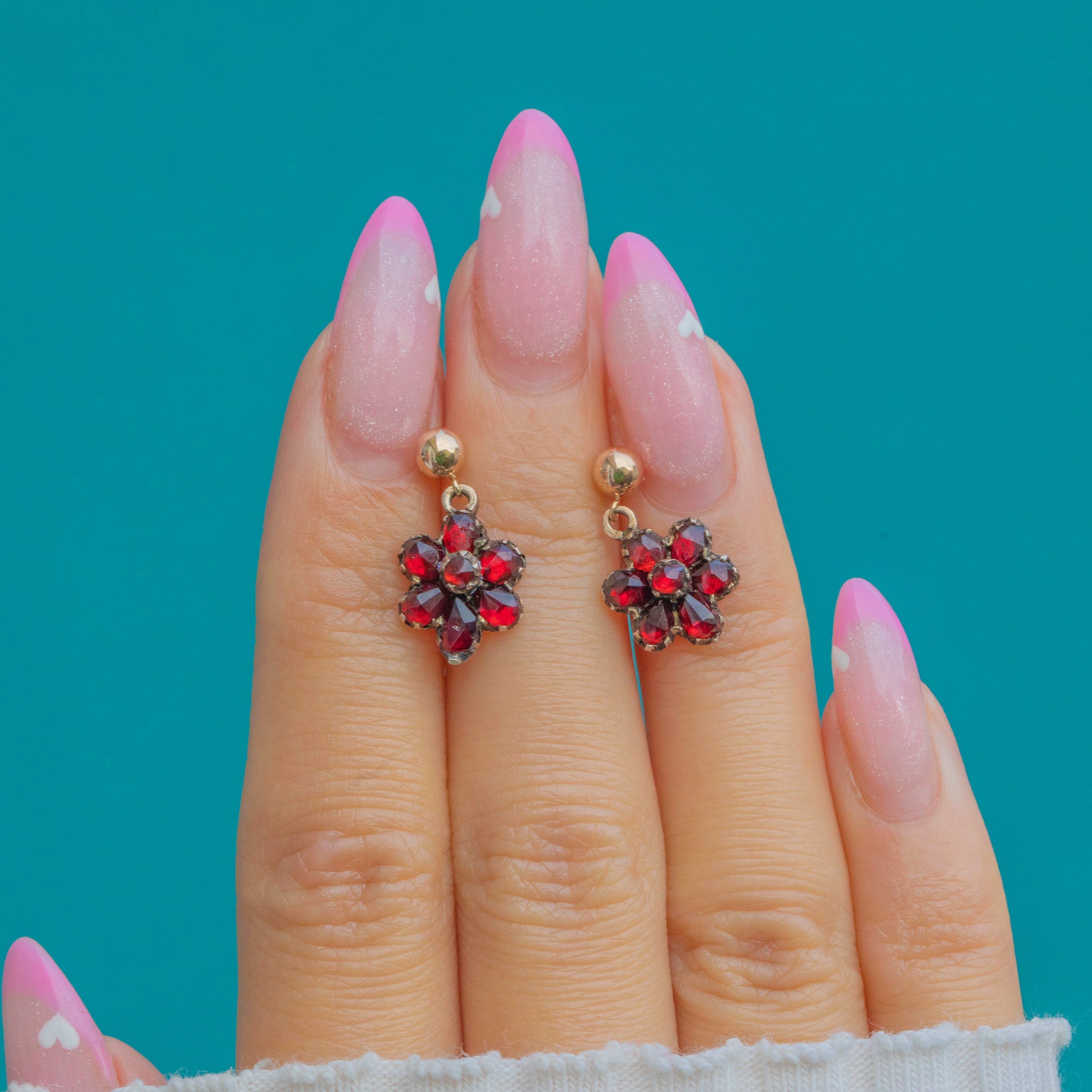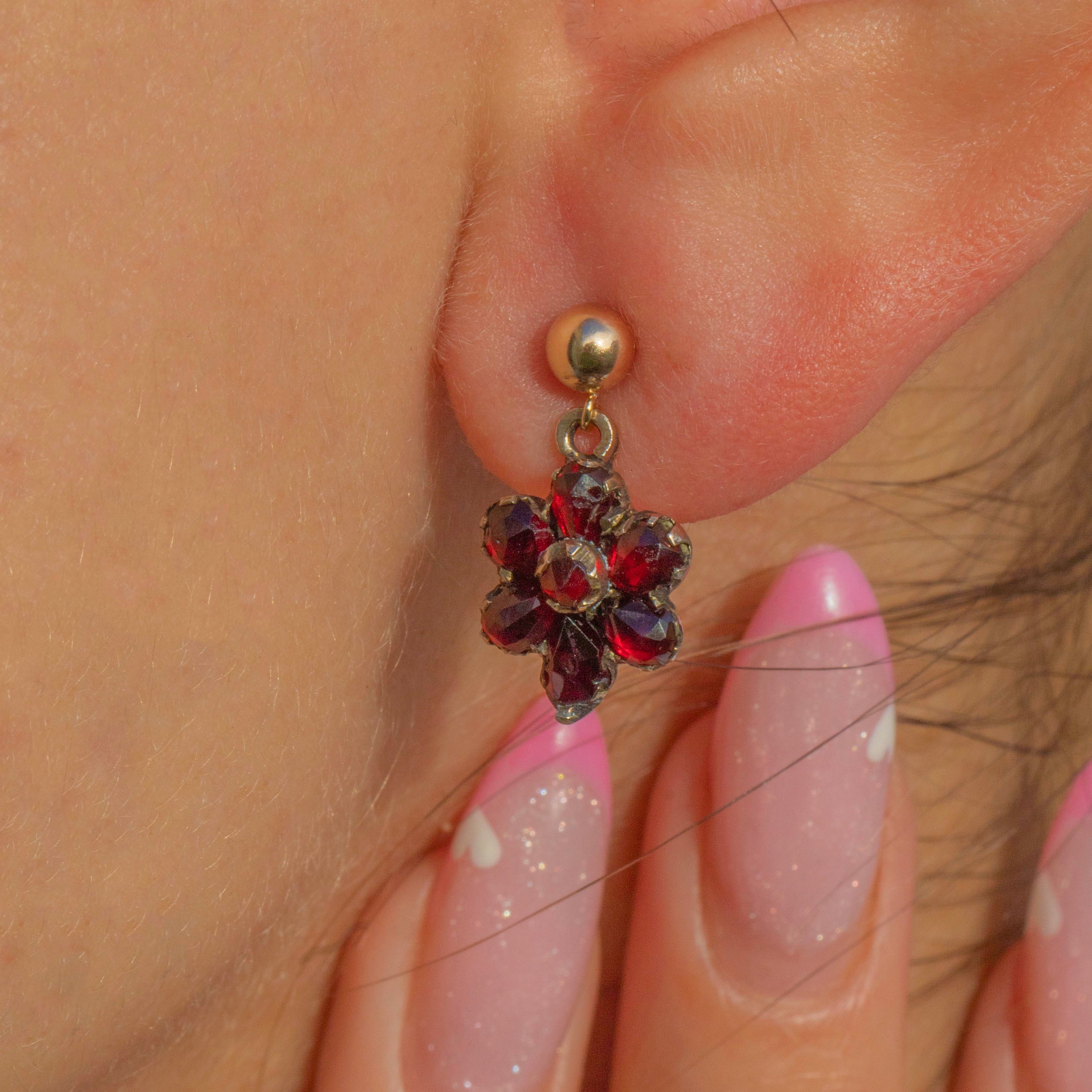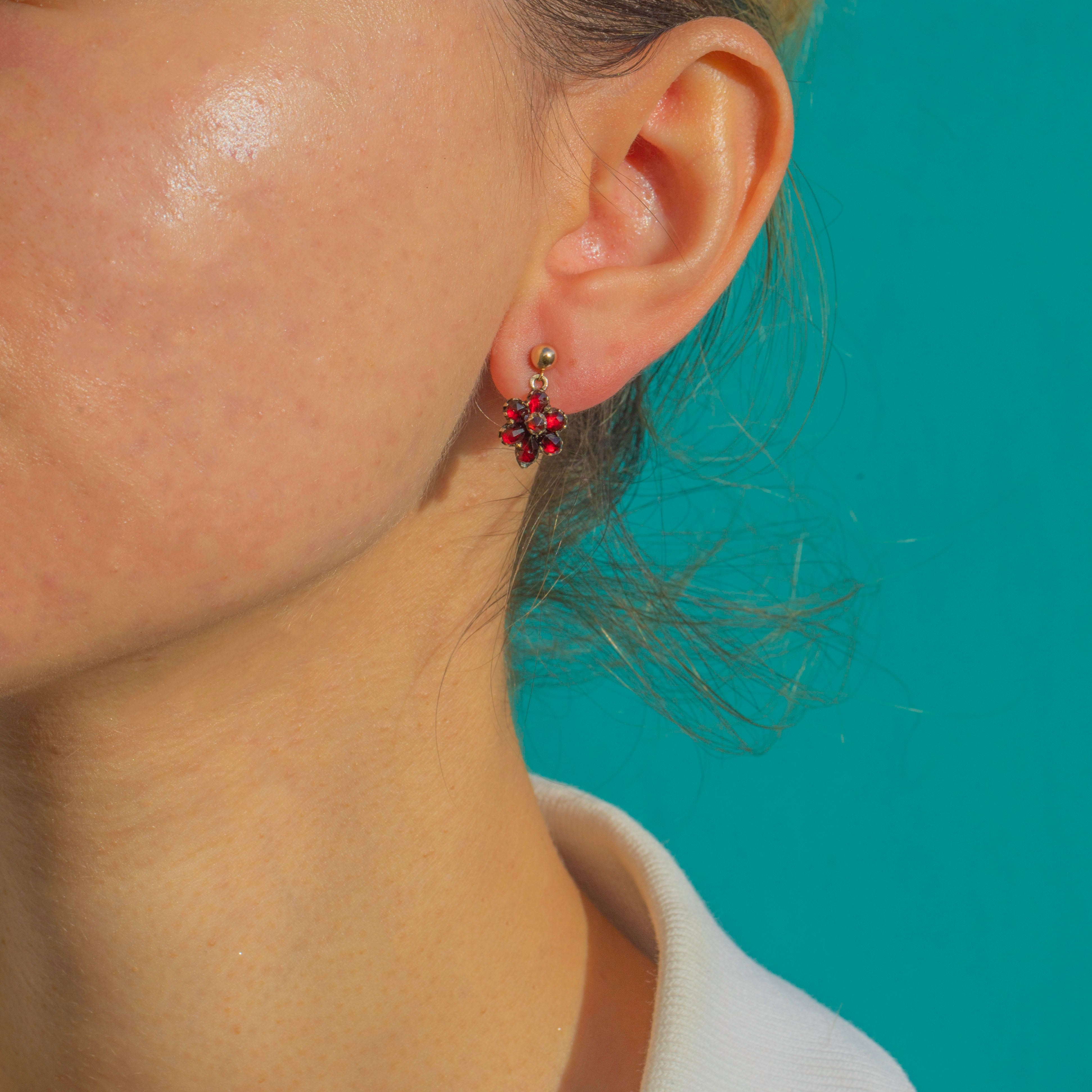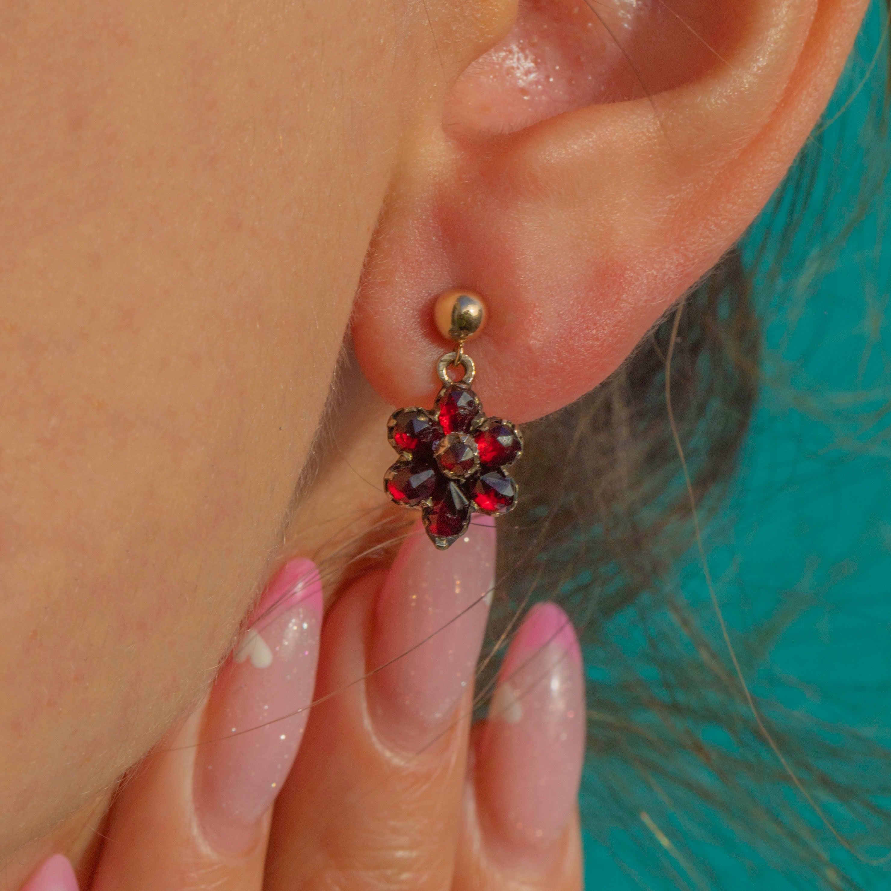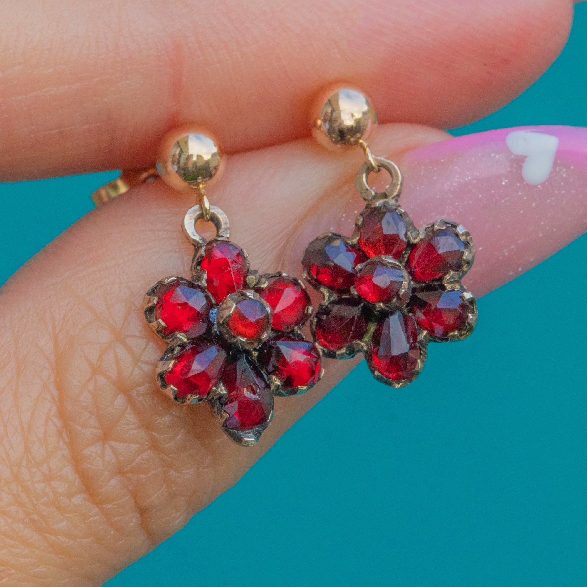 These beautiful antique earrings are crafted from warm Garnet Gold, each set with glowing red Garnets arranged in a delicate flower motif.