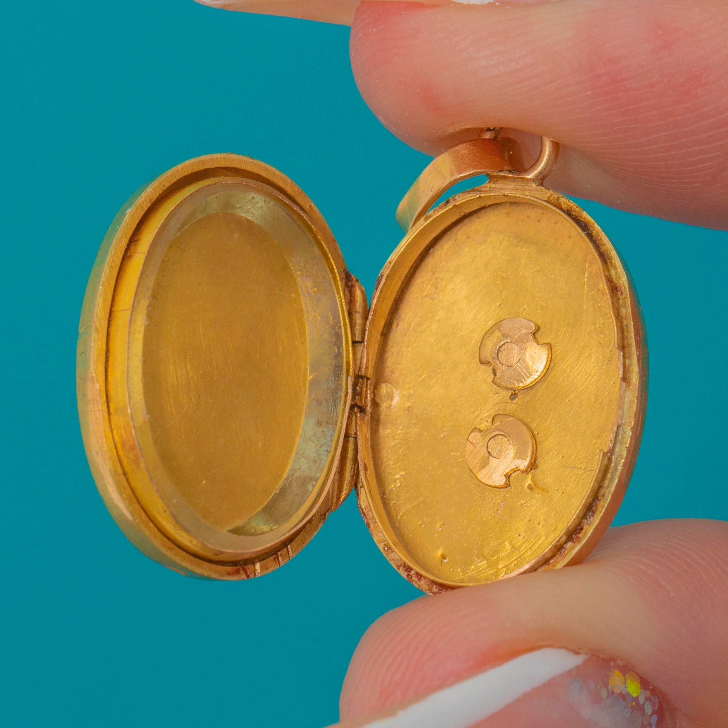 HALLMARKS: Two French Eagle’s Head hallmarks for 18ct Gold just inside the lip of the locket, French Maker’s Marks on the hasp.