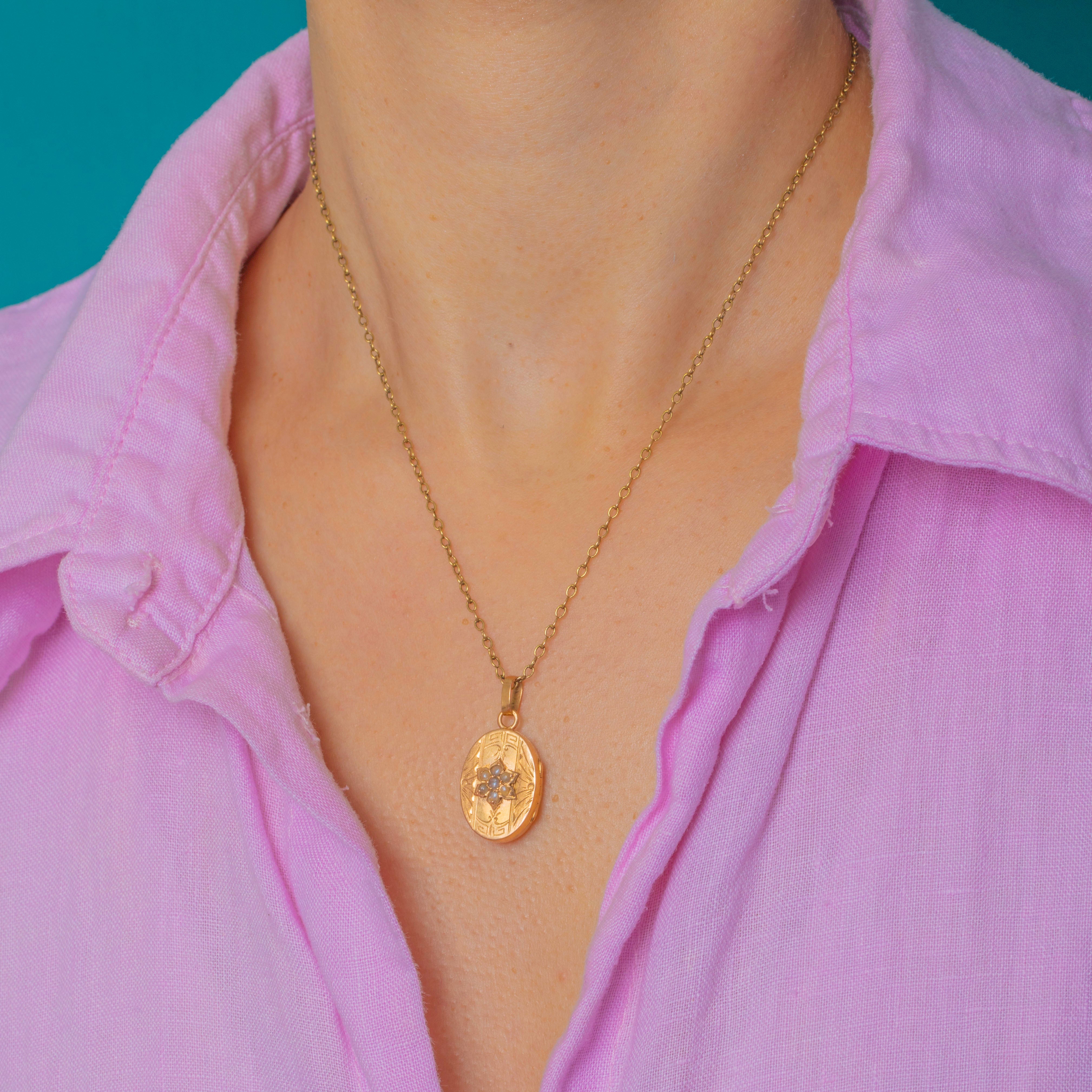 This dainty French Edwardian locket is a charming little treasure, crafted in rich 18ct Gold and set with a sweet Seed Pearl flower to the front. The design is delicately executed, with soft curves and pretty detailing that feel wonderfully romantic and feminine.