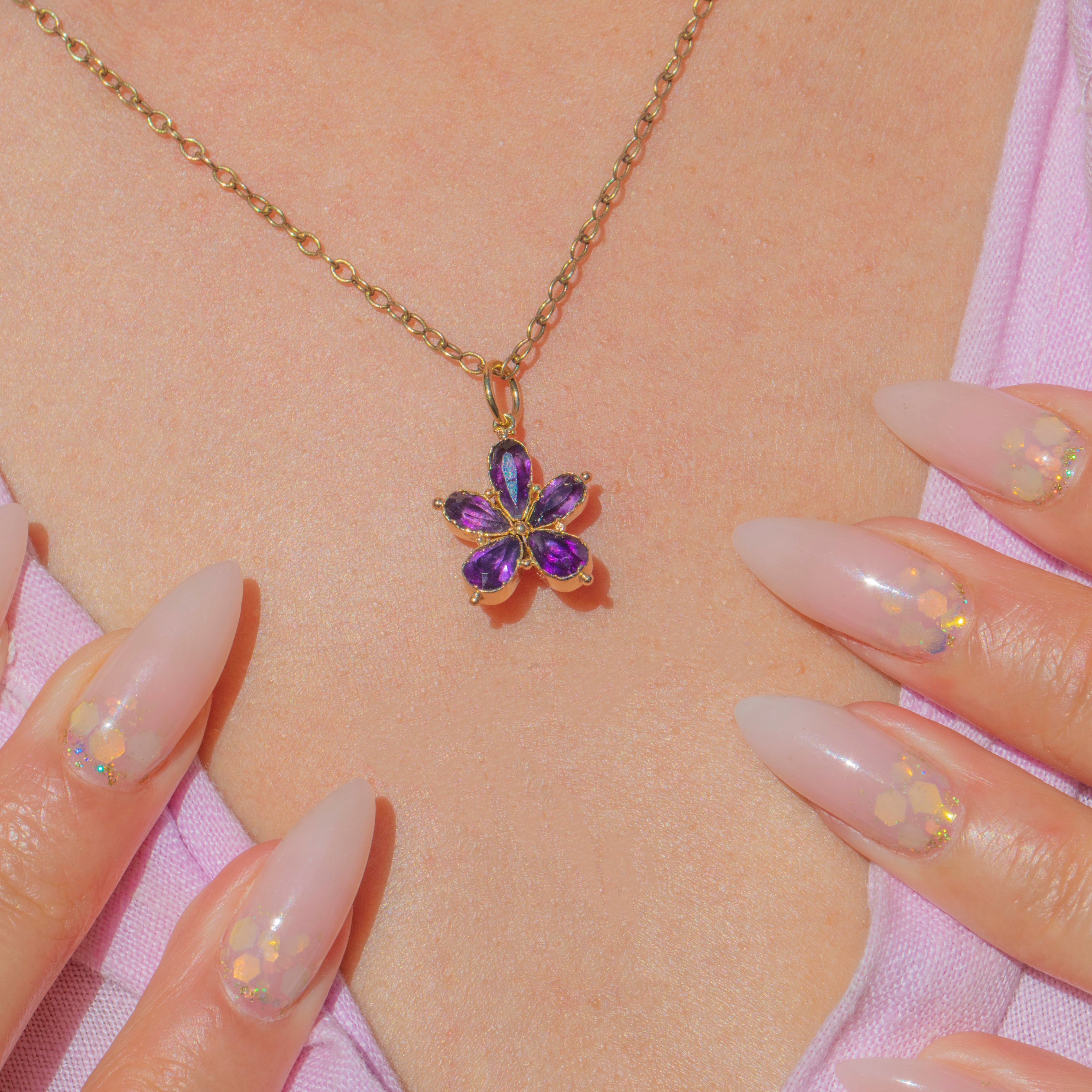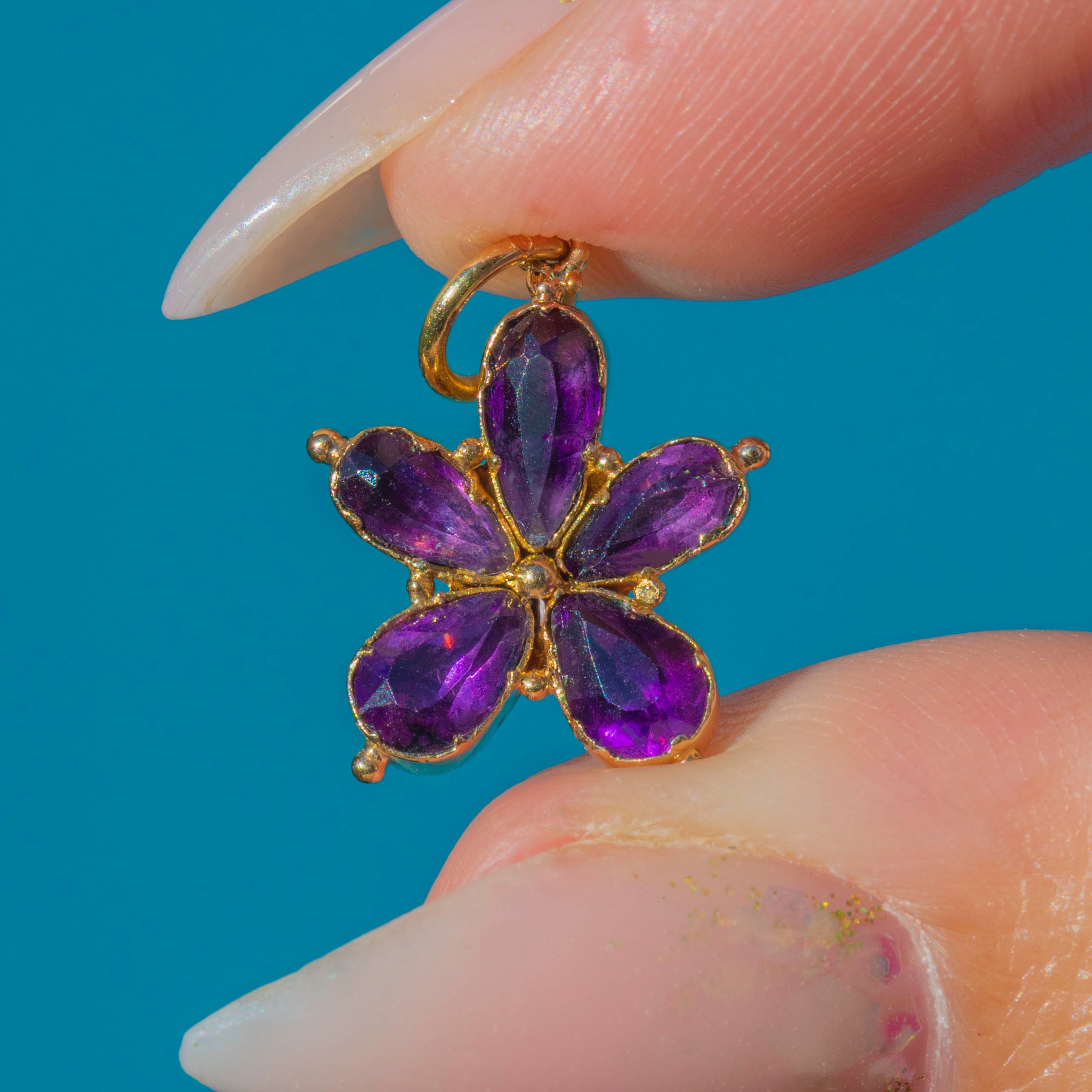 This dainty Georgian charm is crafted in 18ct Gold and set with a vibrant Purple Paste stone, faceted into the shape of a flower- a stylised pansy, no less! The petals shimmer with a rich, amethyst-like hue, radiating from the centre in a classic antique floral design.