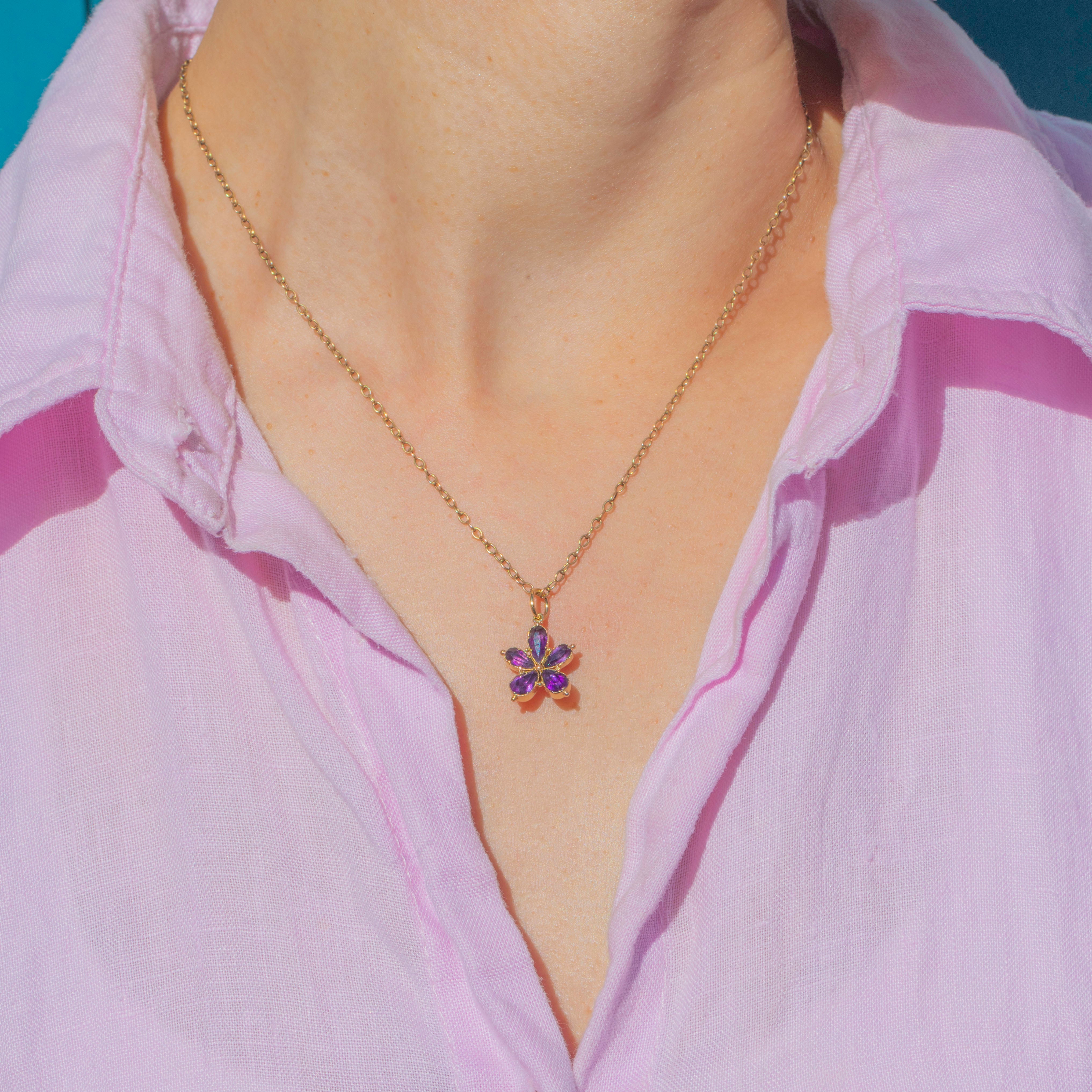 VERY GOOD: The Purple Paste displays a lively colour with only a small surface scratch visible under close inspection. There is some evidence of conversion, but the setting remains strong and secure. The 18ct Gold is sturdy and in very good condition and the original late Georgian locket-back feature is still intact- (a rare thing!) . Overall, this charming historic flower is a delight to behold, and is ready to wear.