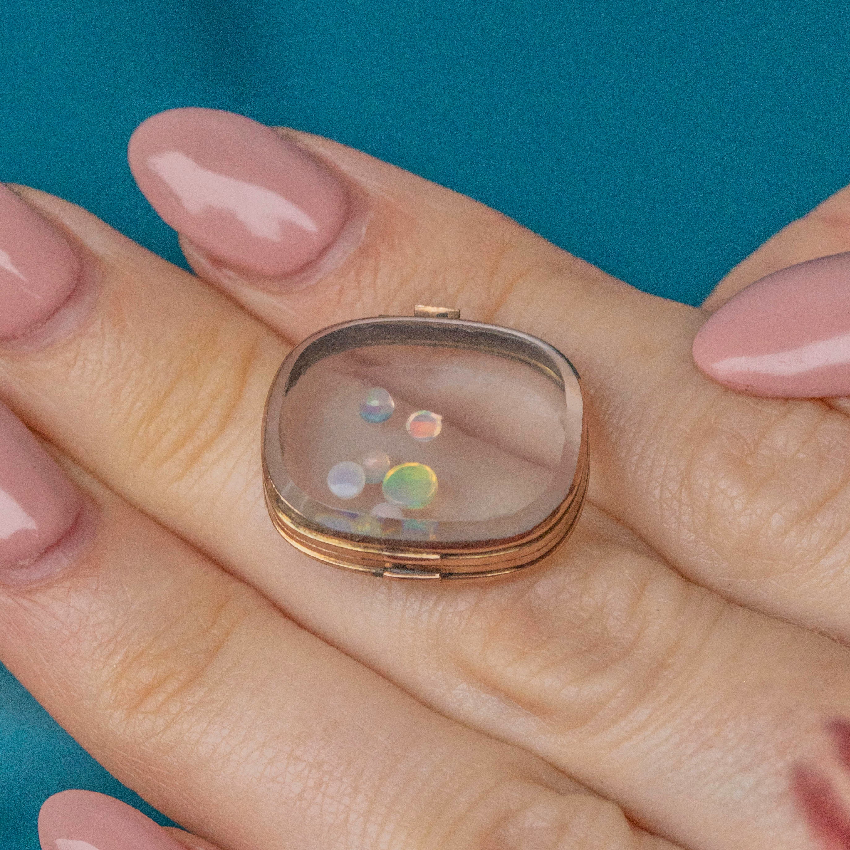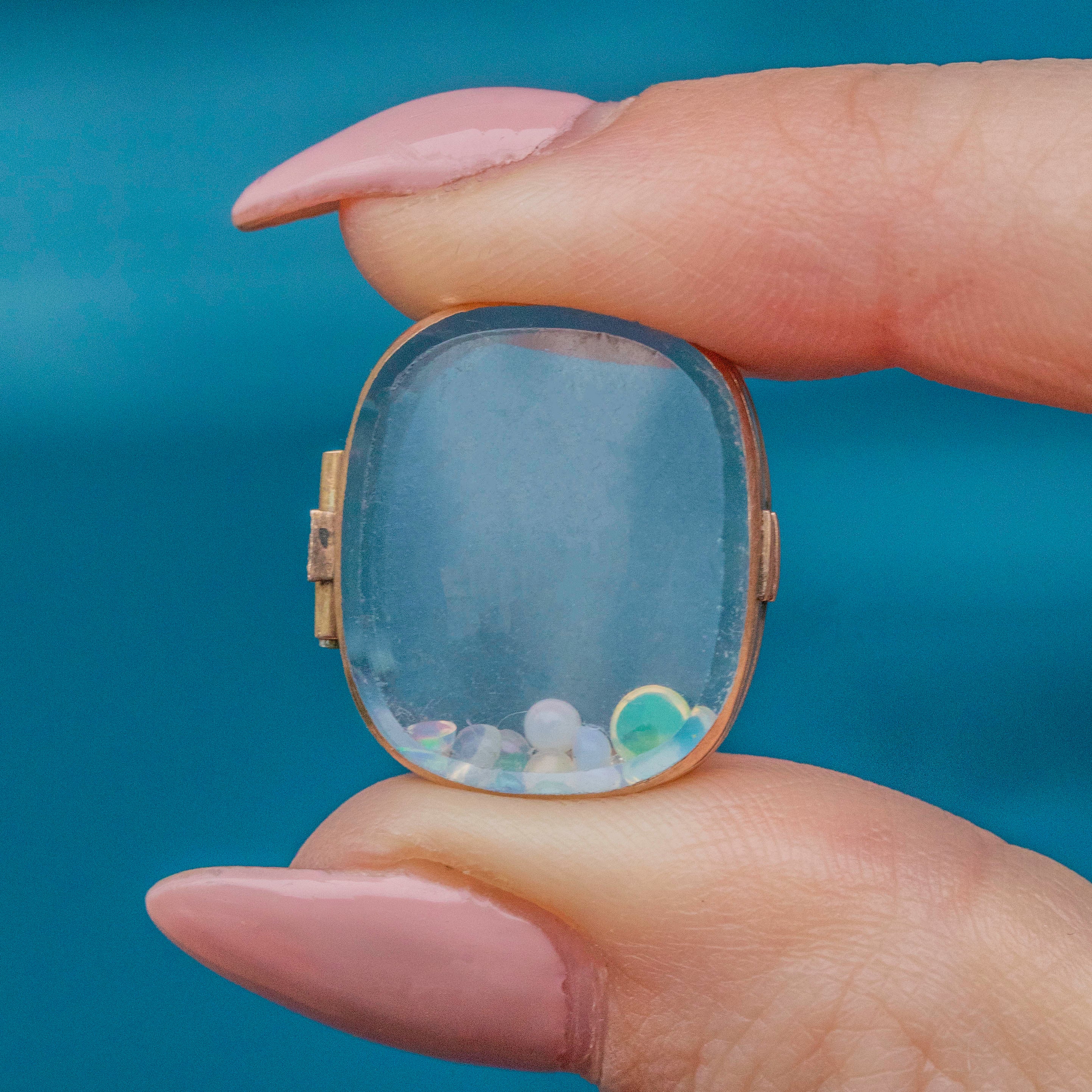 GOOD-VERY GOOD. This dainty Georgian 9ct Gold trinket box is in great condition. Her loose Opals and Diamonds are stunning, radiating iridescence and charm, and are encased securely within the trinket box. The glass encasing has a few scratches and scuffs commensurate with age, however, it is not overly noticeable and does not detract from her charm. Simply adorable, this antique trinket box is a must-have!