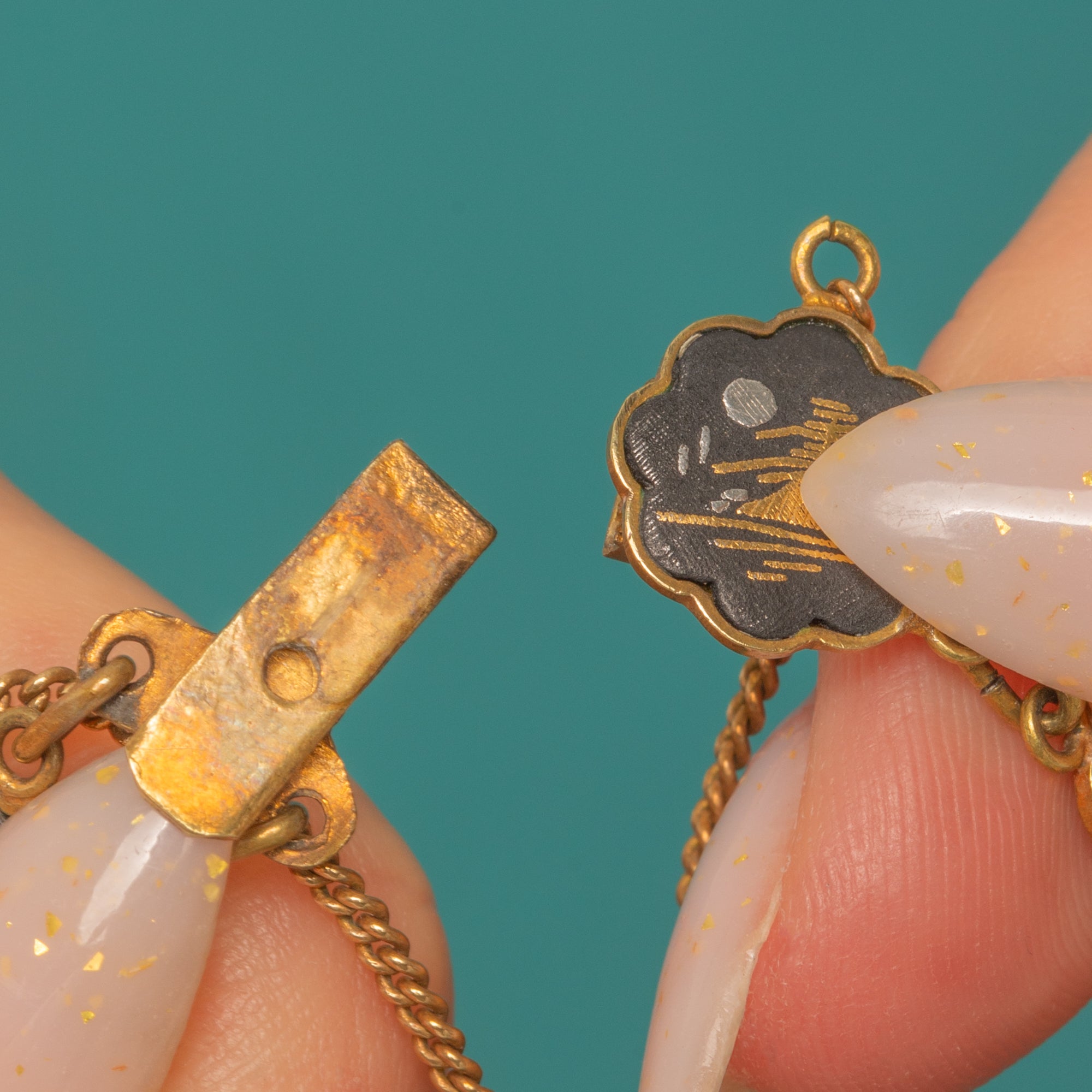 VERY GOOD: The scenic Shakudo panels are crisp with light, even surface wear commensurate with age and minor patina rubbing in places. One link shows an historic solder repair which is secure and stable. The articulated construction, box clasp and safety chain are all in good working order, indicating careful wear over time.