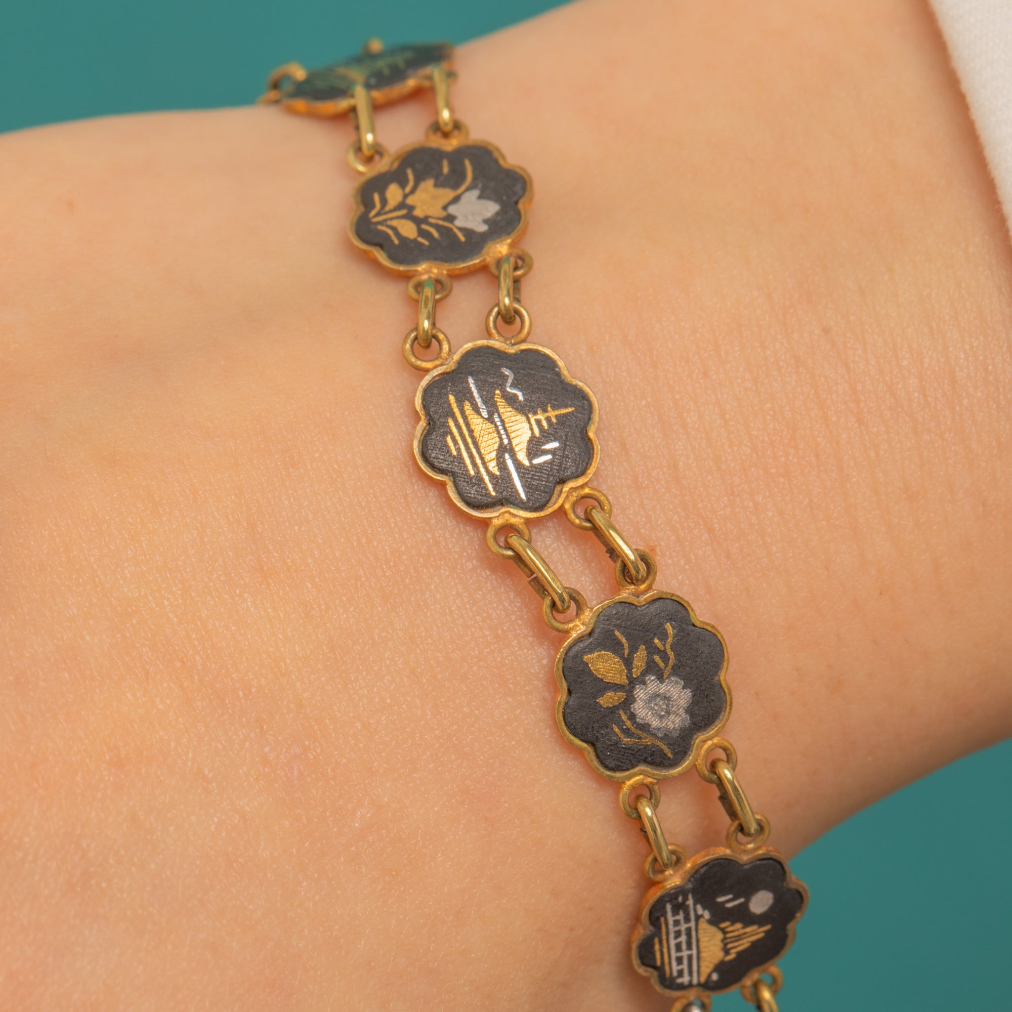 A refined Art Deco Shakudo bracelet, composed of delicately scalloped round plaques linked for fluid movement. Each plaque displays fine gold- and silver-toned inlay against a rich dark patina, depicting flowers, butterflies and serene Japanese landscapes with beautiful clarity. Finished with a neat box clasp and safety chain for peace of mind.