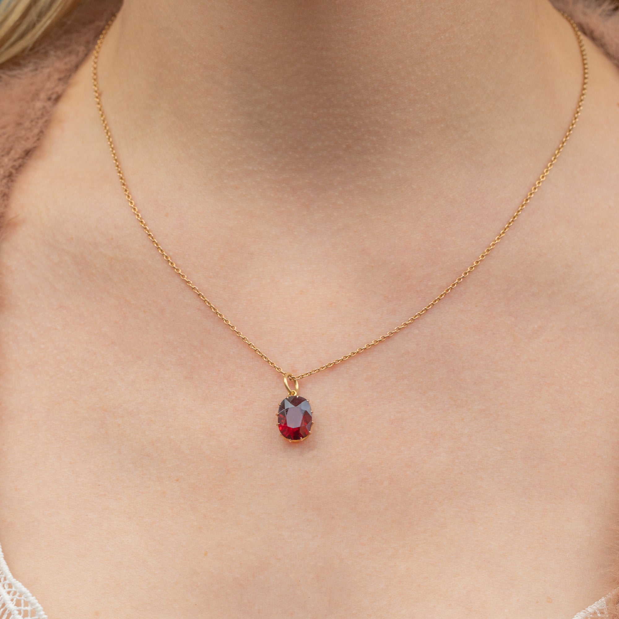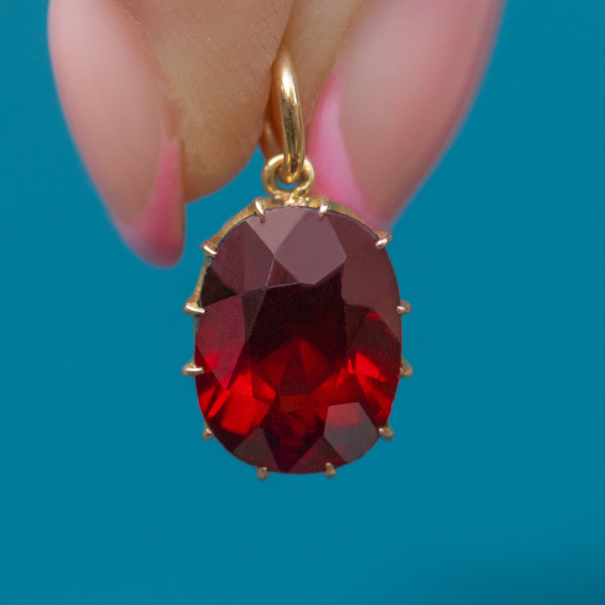 Each curve and contour of the pendant reflects in the light, revealing seductive crimson hues that shimmer across the smoothly faceted; this Edwardian charm will swoon!