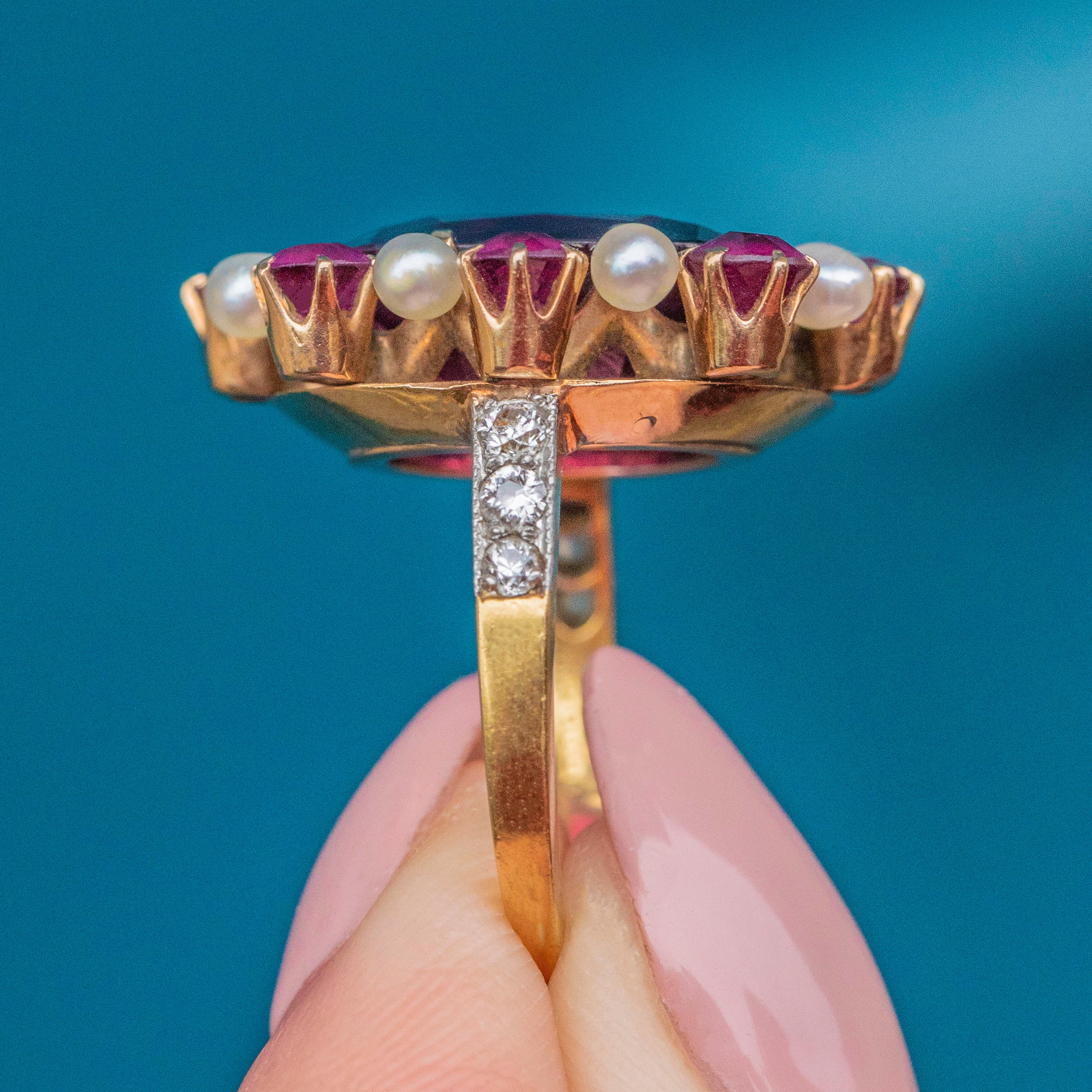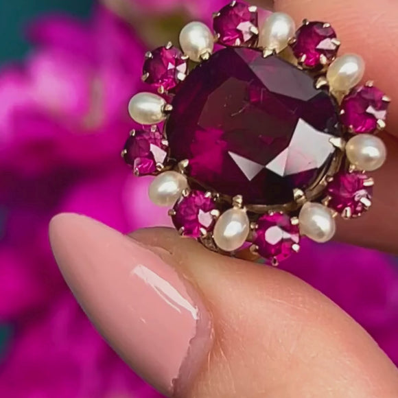 This Edwardian 14ct Gold Garnet Pearl cluster ring is brimming with historical intrigue. Boasting an impressive cranberry-hued 4.00ct Garnet, she is haloed by dainty Pearls and Garnets and flanked by Diamond encrusted shoulders.