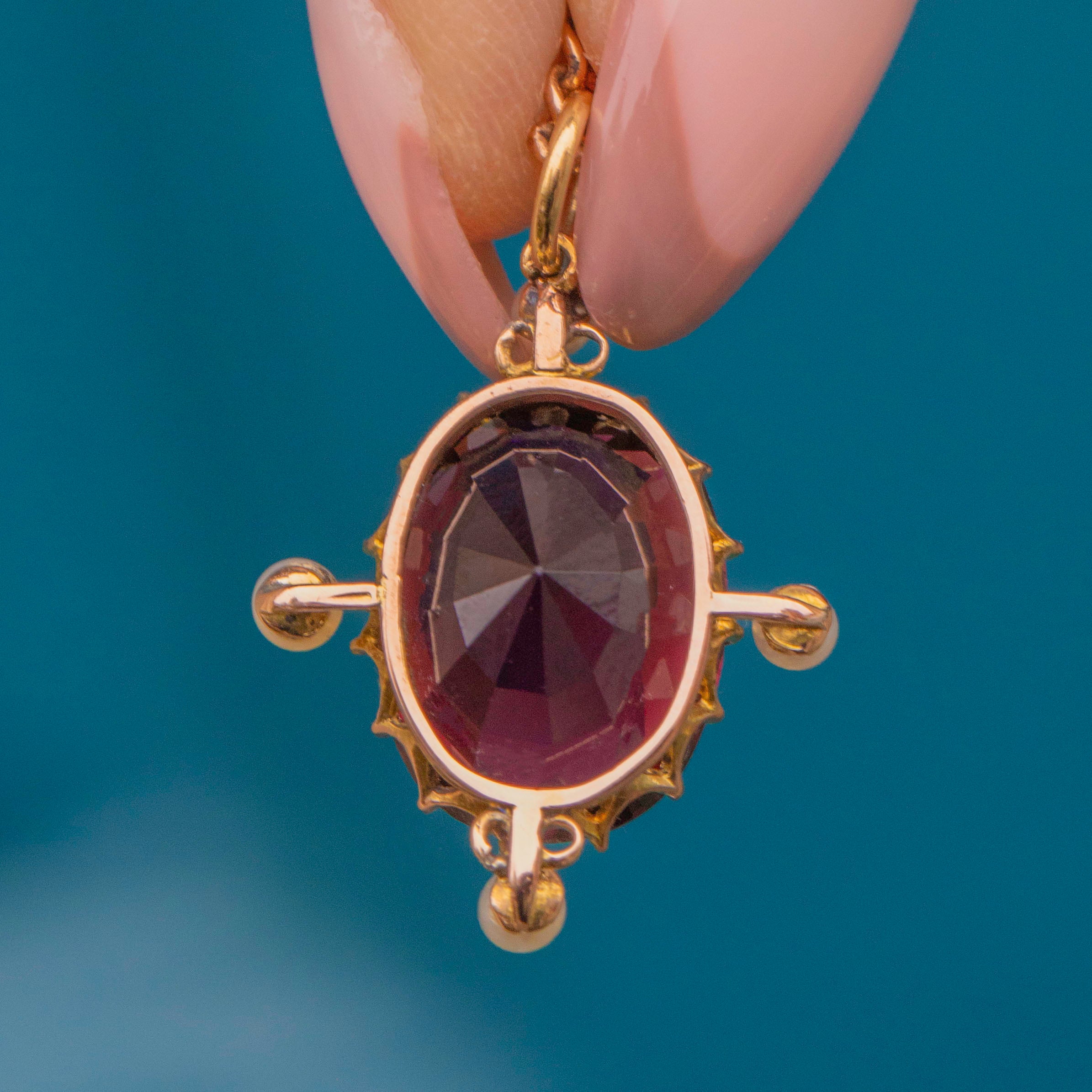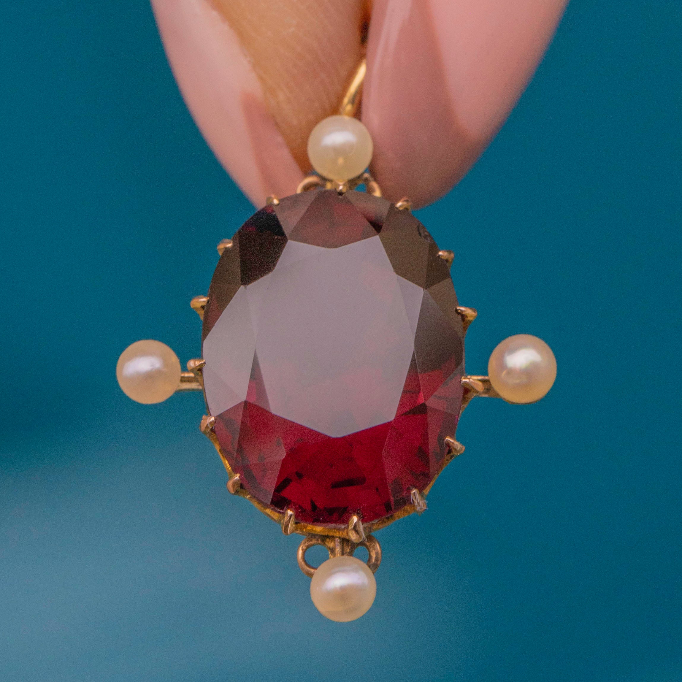 EXCELLENT. This Edwardian 14ct Gold Garnet and Pearl pendant is in excellent condition. The Garnet has a crisp set of facets, free from chips or abrasions, and is securely set within its claws. The Pearls are pristine and smooth with no wear visible to their nacre. Preserved in such fabulous condition, this antique Garnet Pearl pendant will delight you for years to come!