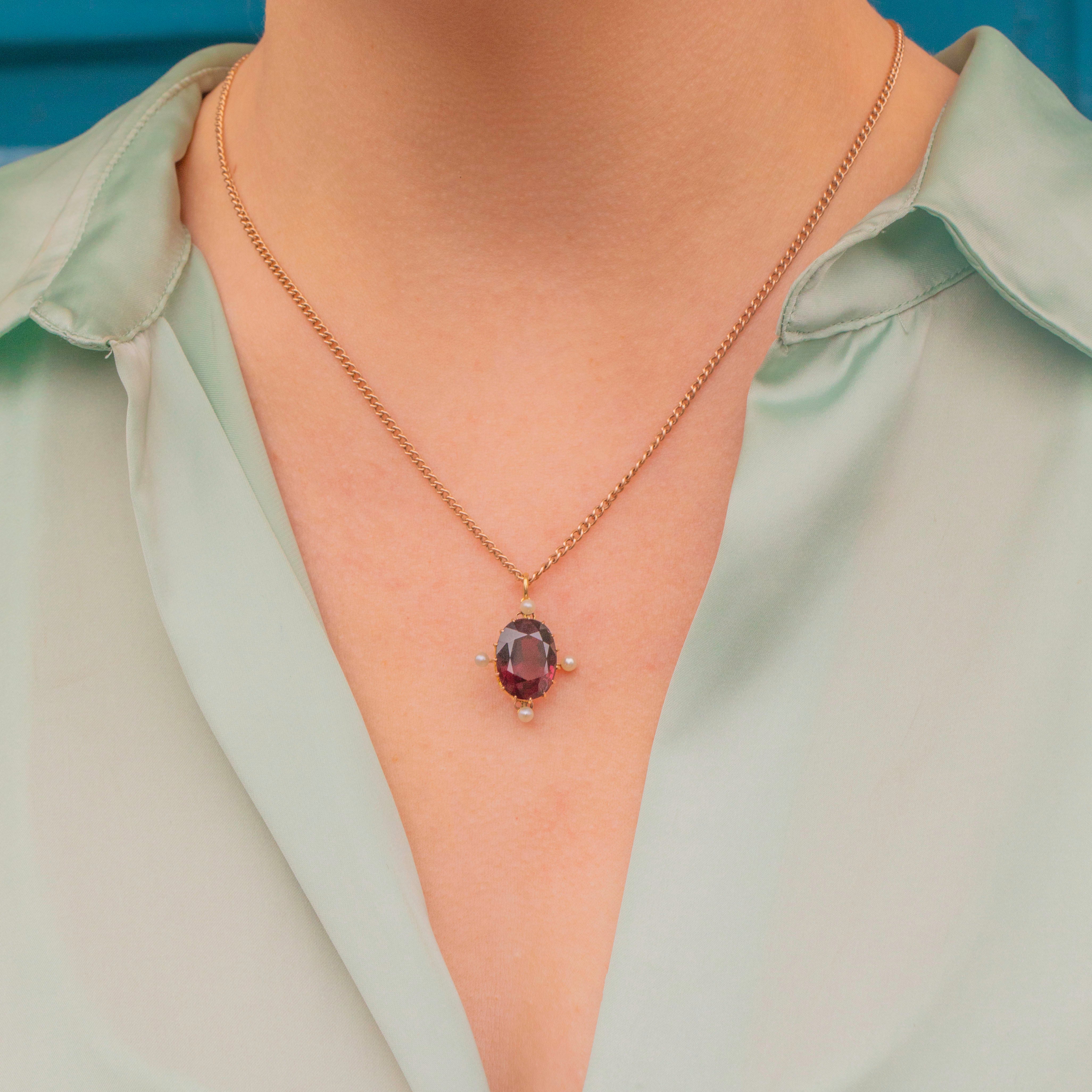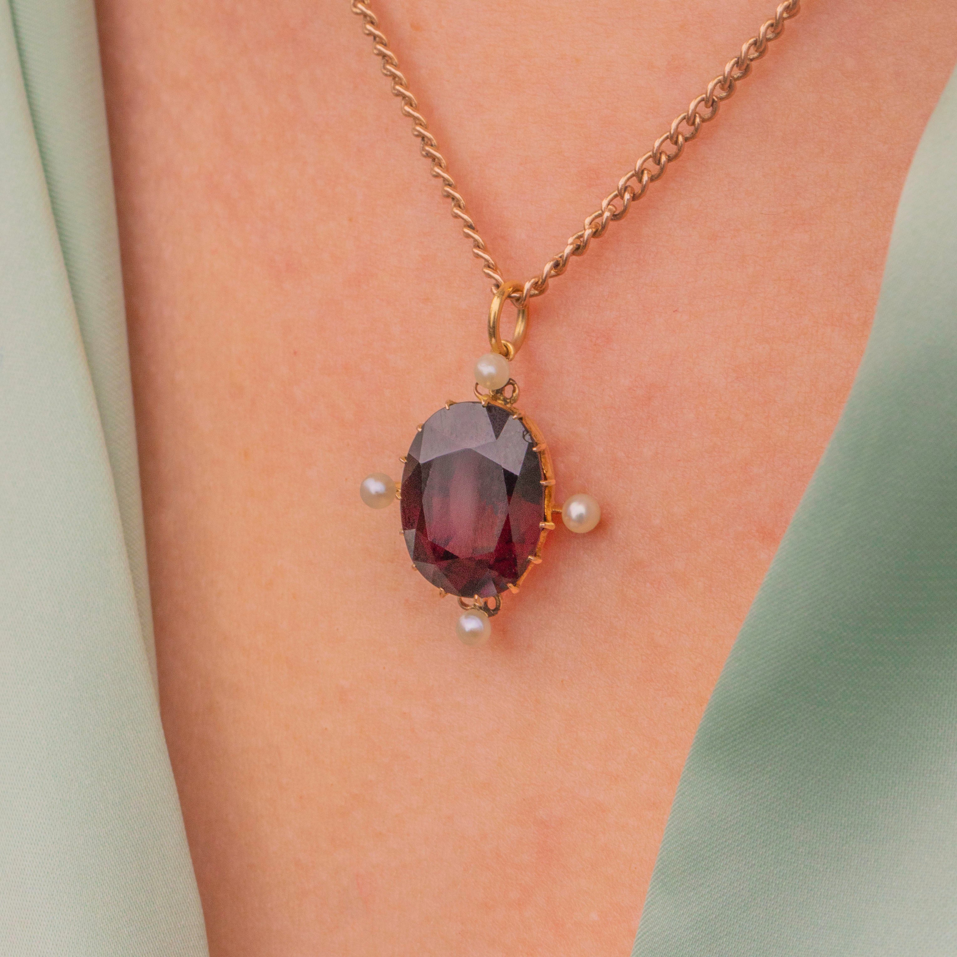 Exuding elegance from every angle, this Edwardian 14ct Gold Garnet and Pearl pendant will instantly seduce you with its 10.76ct Garnet and silky Pearls! The Garnet boasts deep burgundy hues and is perfectly contrasted by four lustrous Pearls arranged into a striking design in solid 14ct Gold.