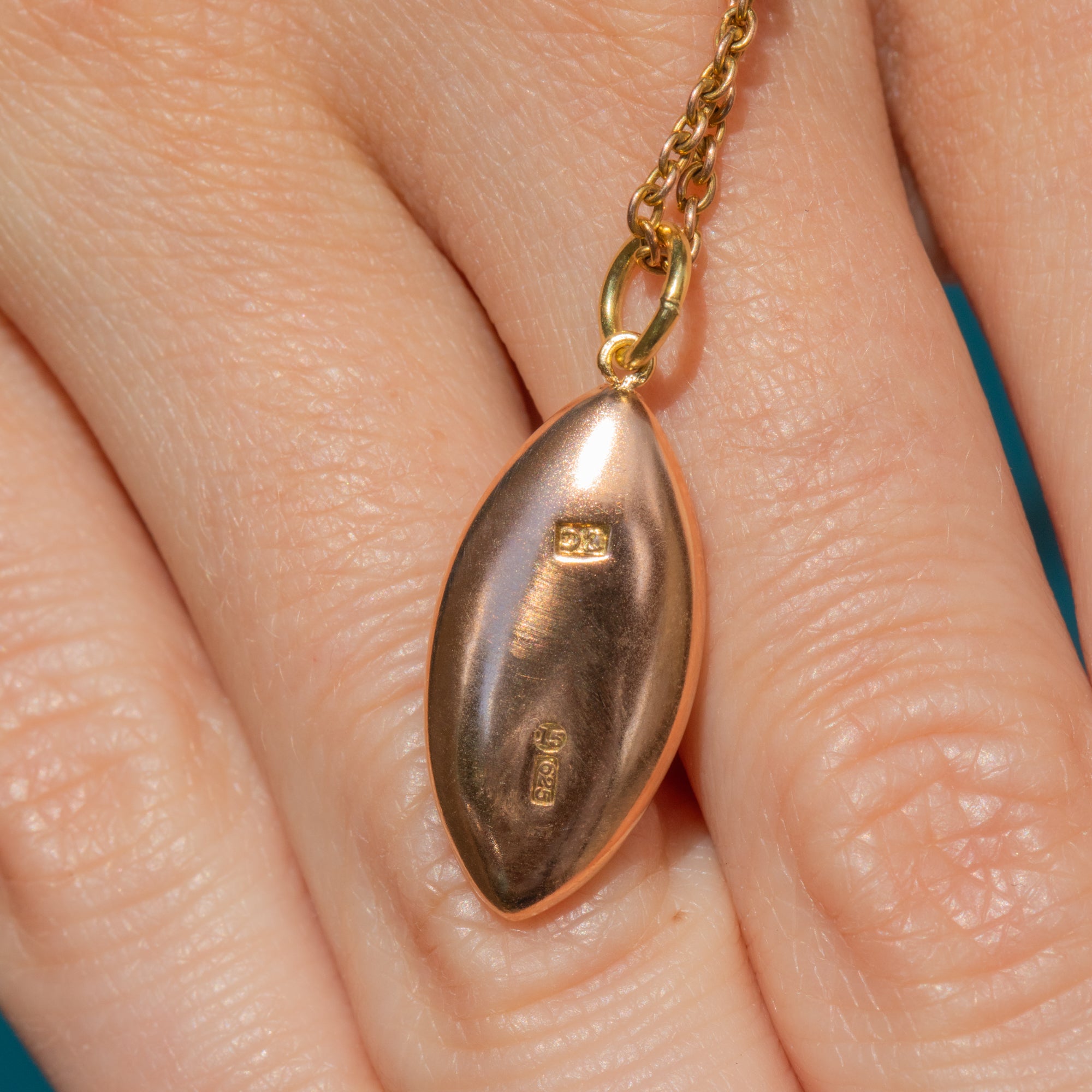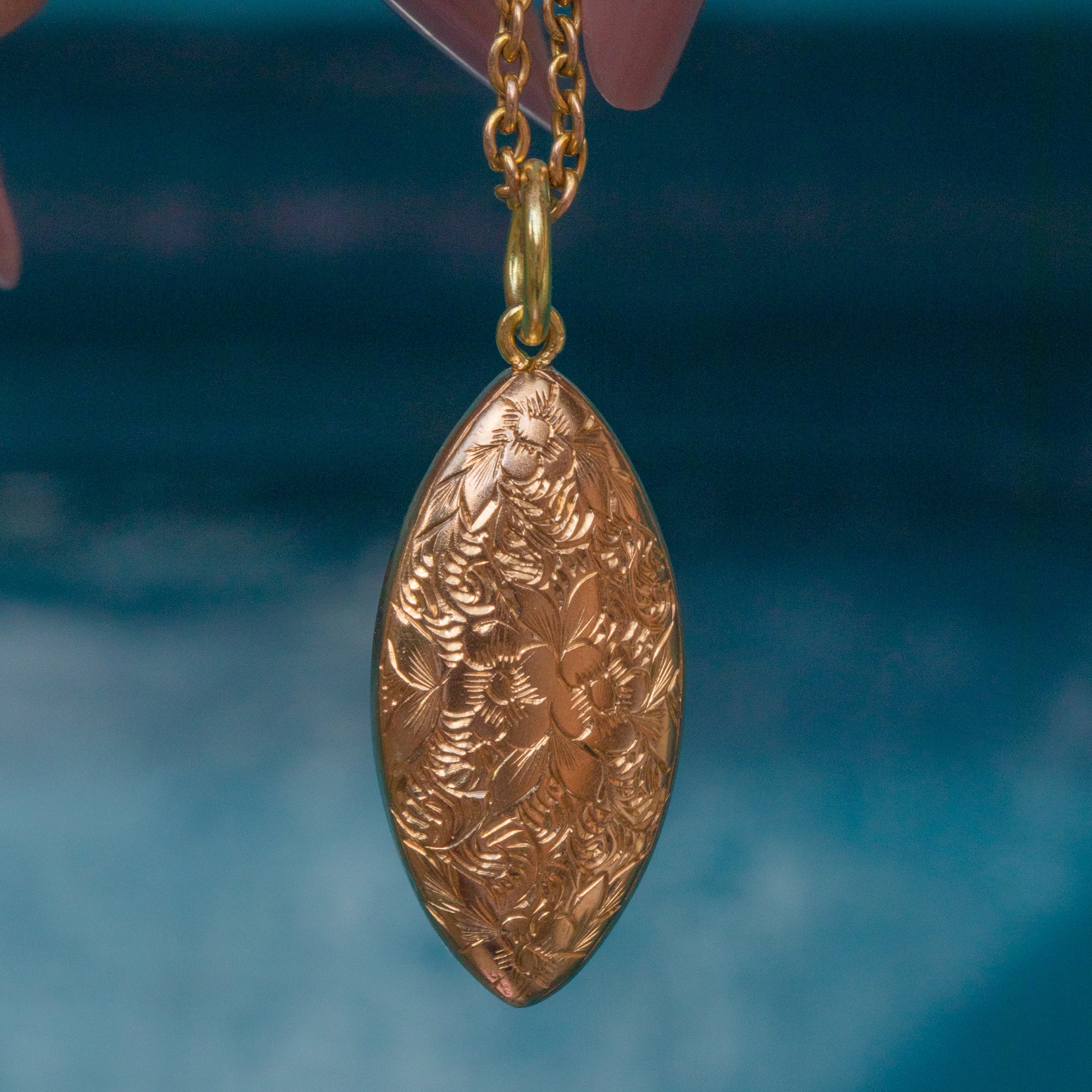 Plucked from the prettiest era, this Edwardian 15ct Gold floral engraved pendant is bursting with beauty. Her sleek lozenge form is inlaid with whimsical forget-me-not engravings, a motif that carries strong romantic sentiment within antique jewellery.